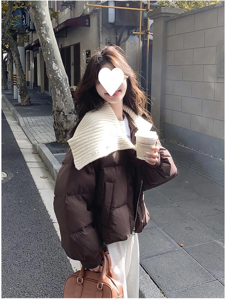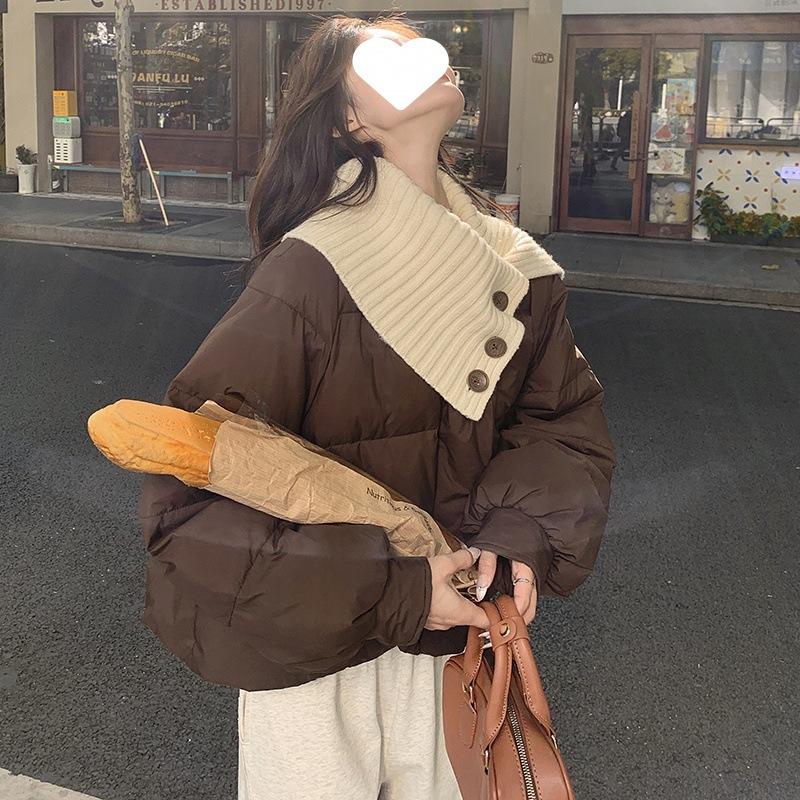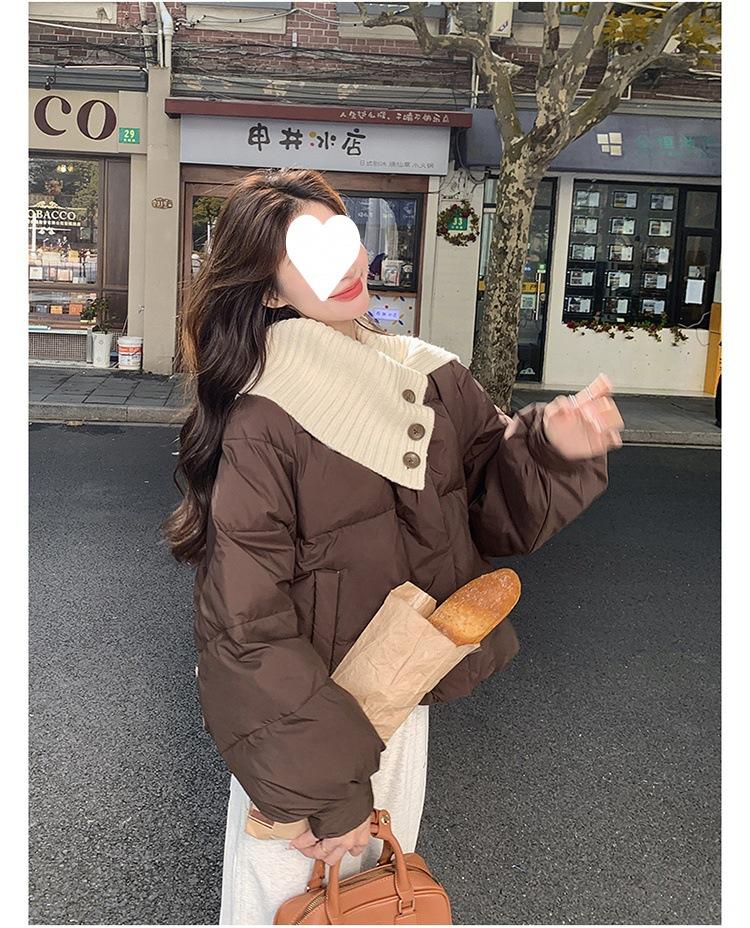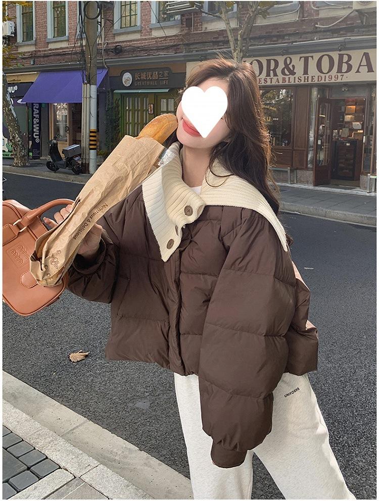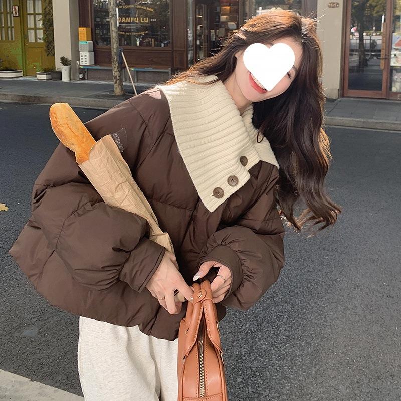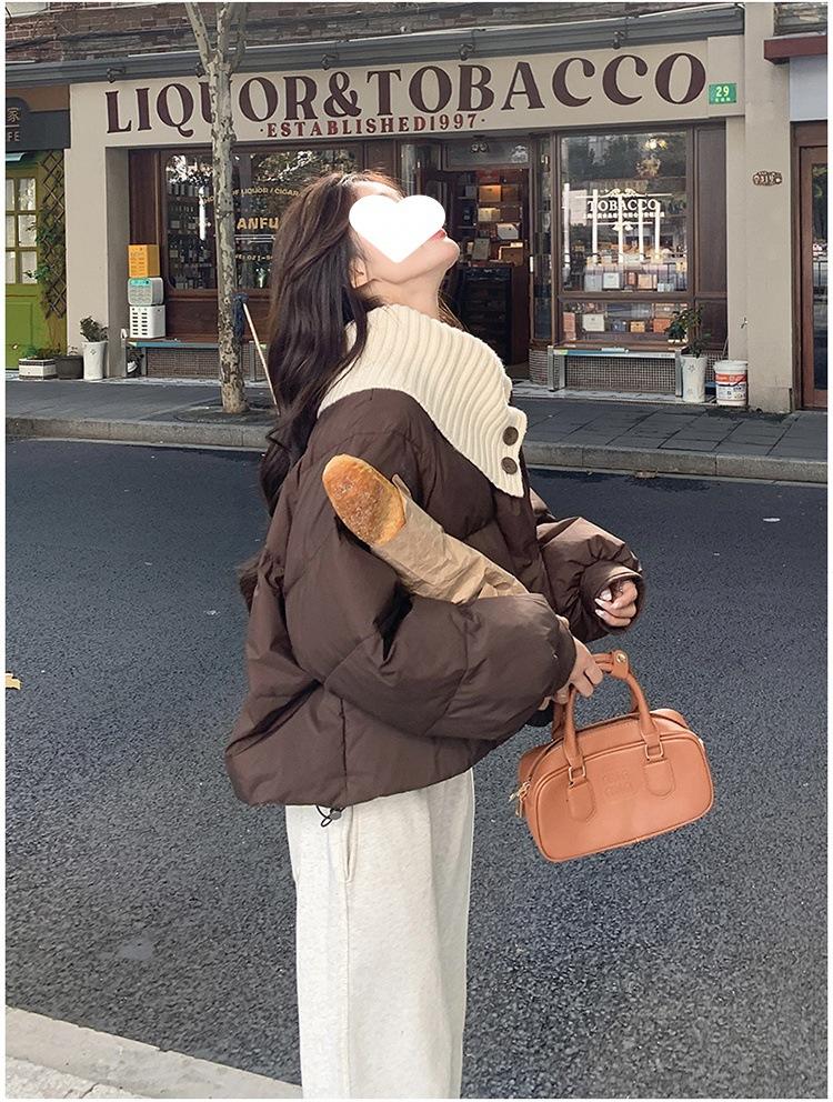 Abrigo acolchado de algodón con cuello de punto de diseño marrón para mujer corto 2023 Invierno nuevo pequeño abrigo de moda de alta gama