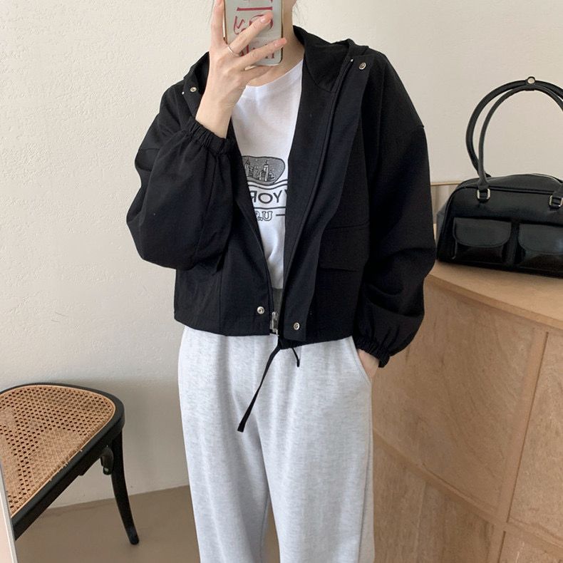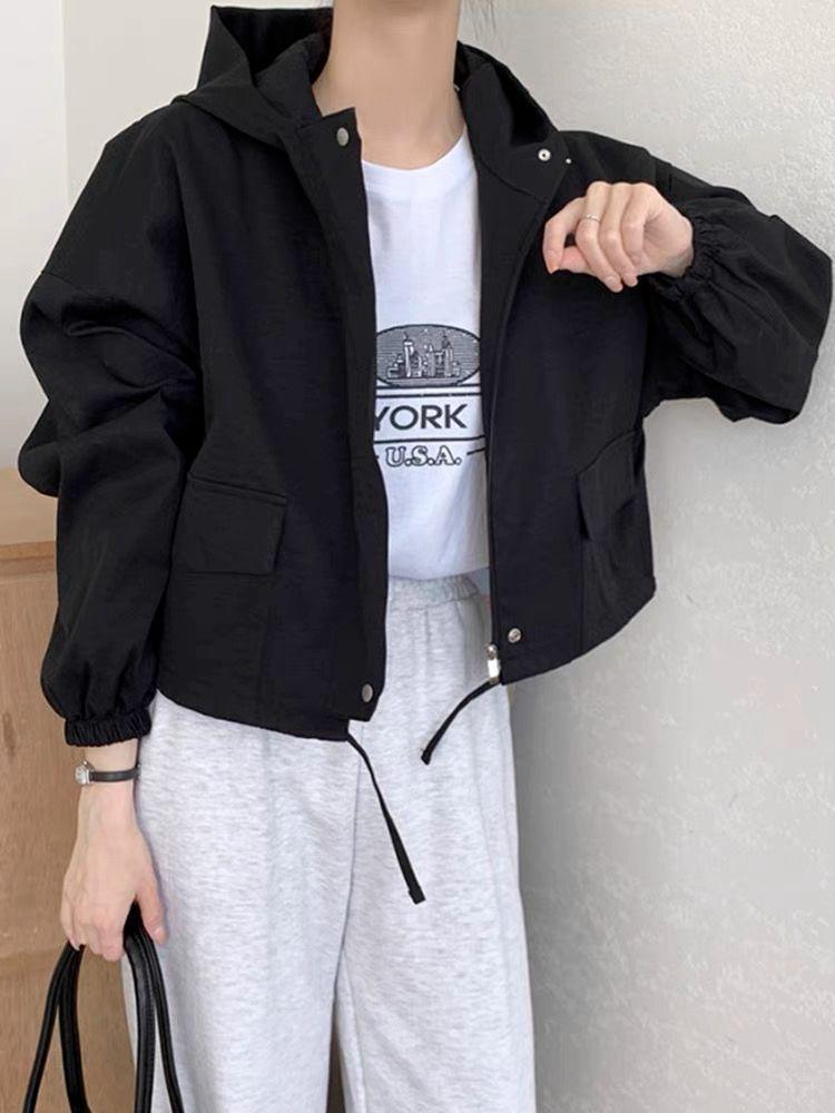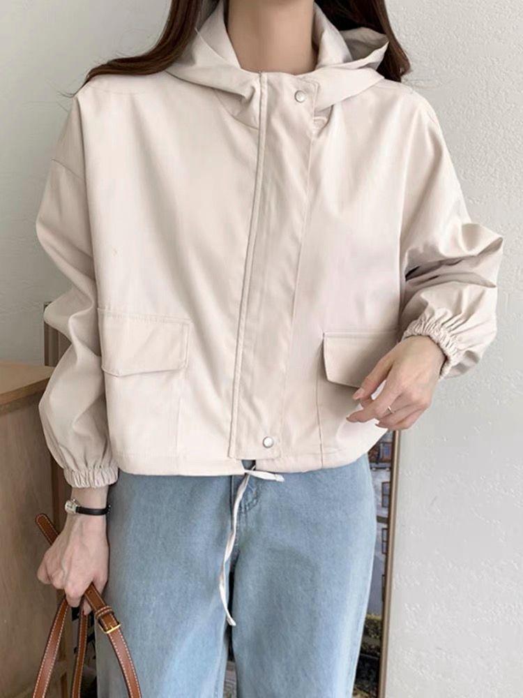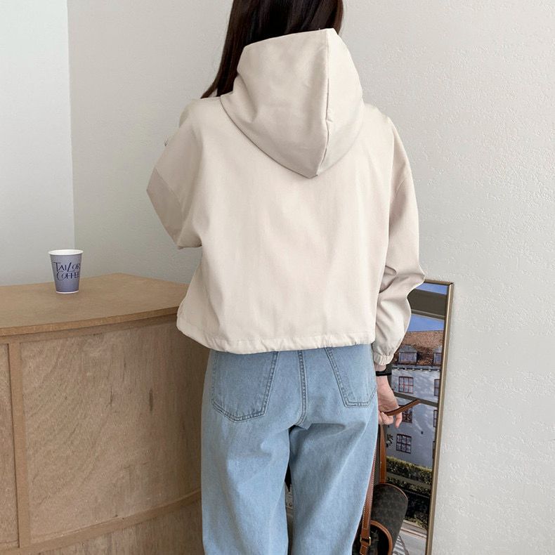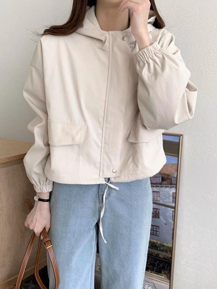Chaqueta Corta Coreana Otoño Retro Versátil con Capucha Cierre Holgada Casual Versátil Color Sólido Manga Larga Mujer