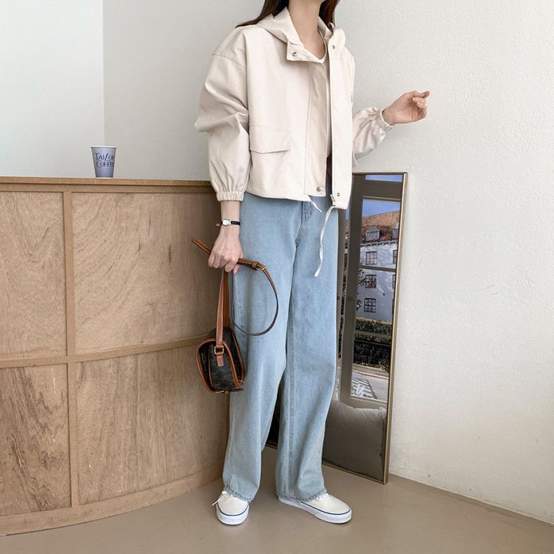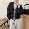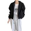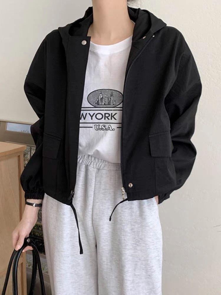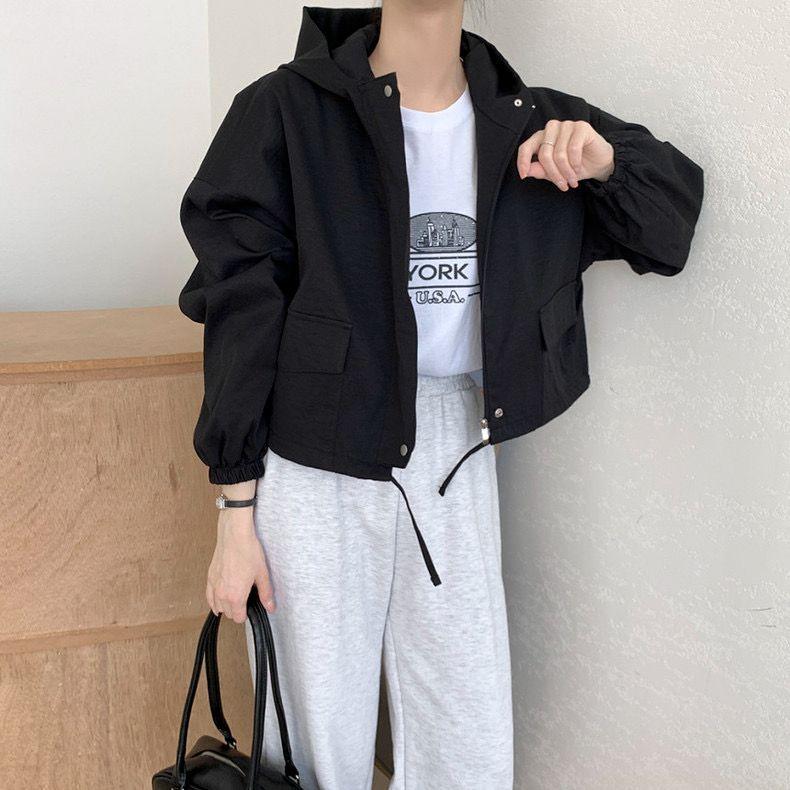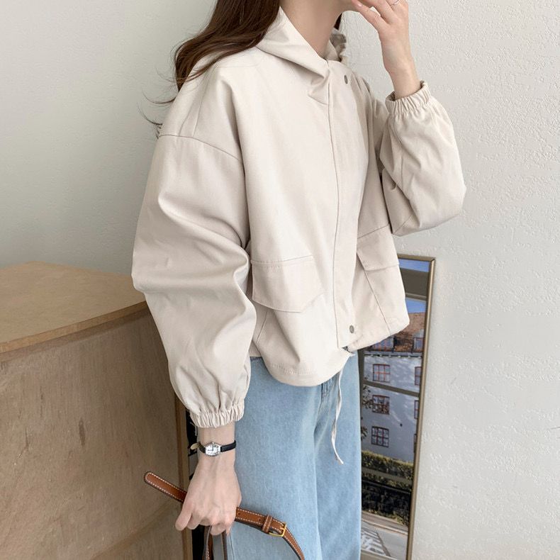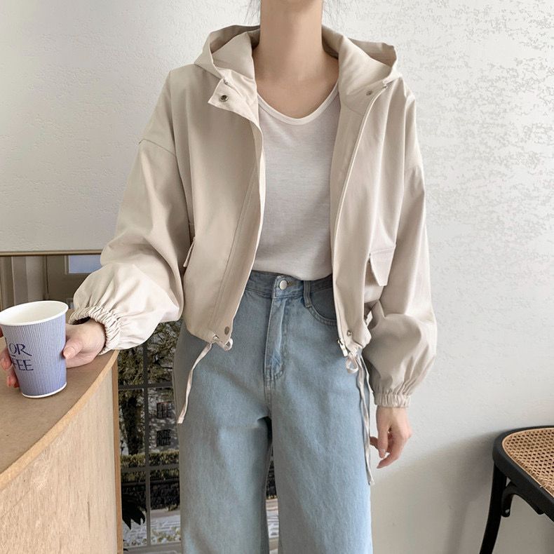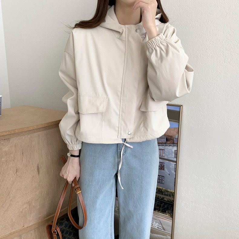 Chaqueta Corta Coreana Otoño Retro Versátil con Capucha Cierre Holgada Casual Versátil Color Sólido Manga Larga Mujer