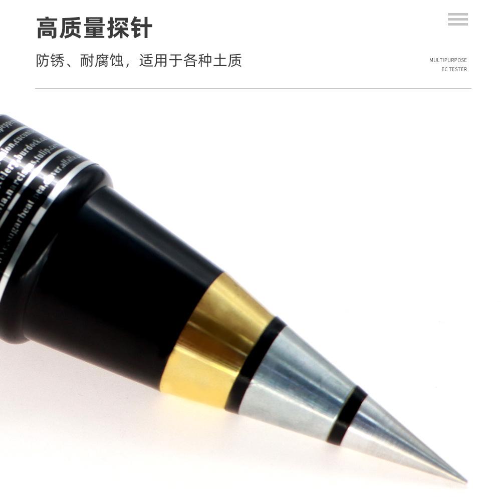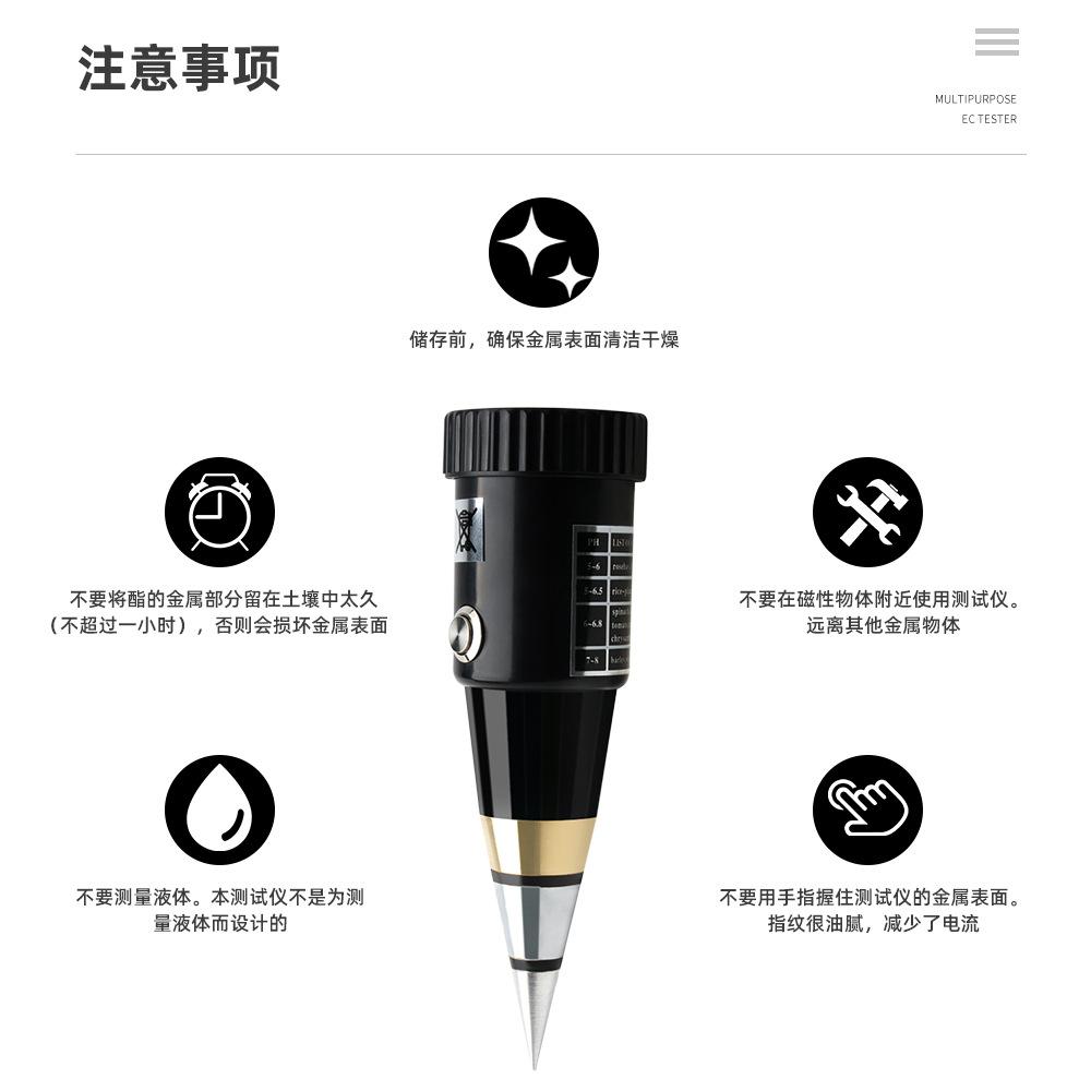 (1) La sonda de metal del instrumento no debe insertarse en el suelo durante demasiado tiempo para evitar daños por oxidación o daños en la superficie de la sonda.