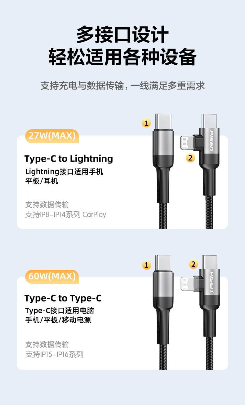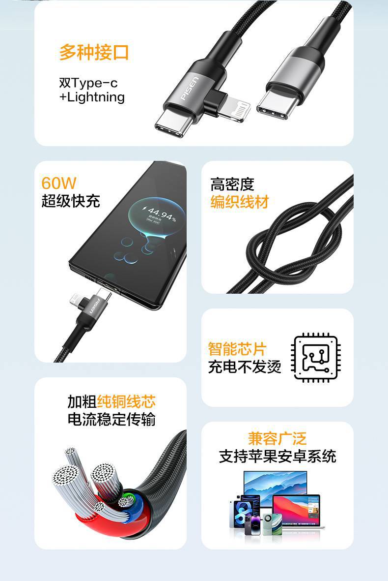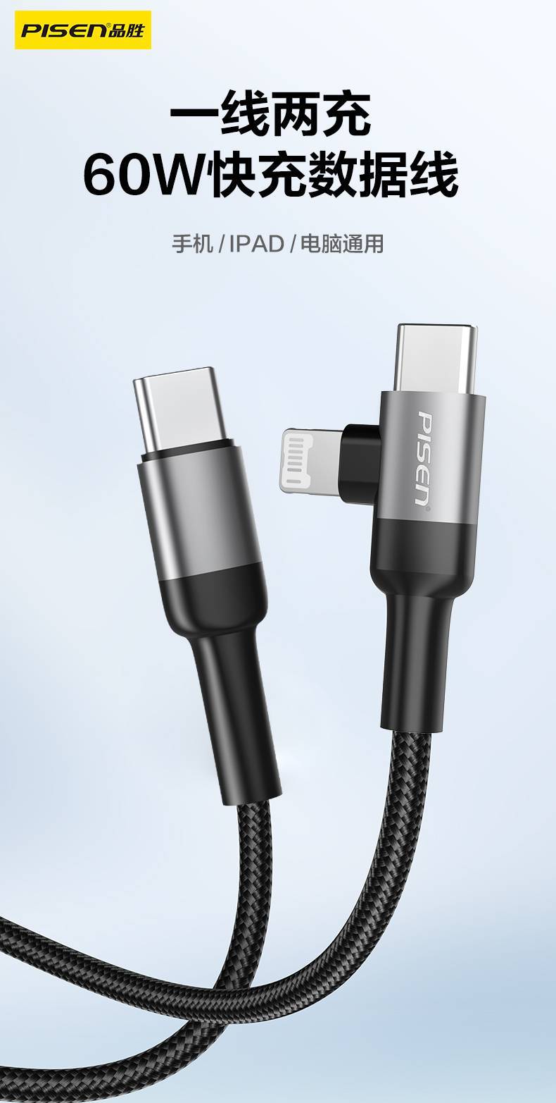 El Cable de Datos Dos en Uno Pinsheng es Adecuado para Cable de Carga Apple 16 Uno a Dos 60W Carga Súper Rápida Huawei Typec