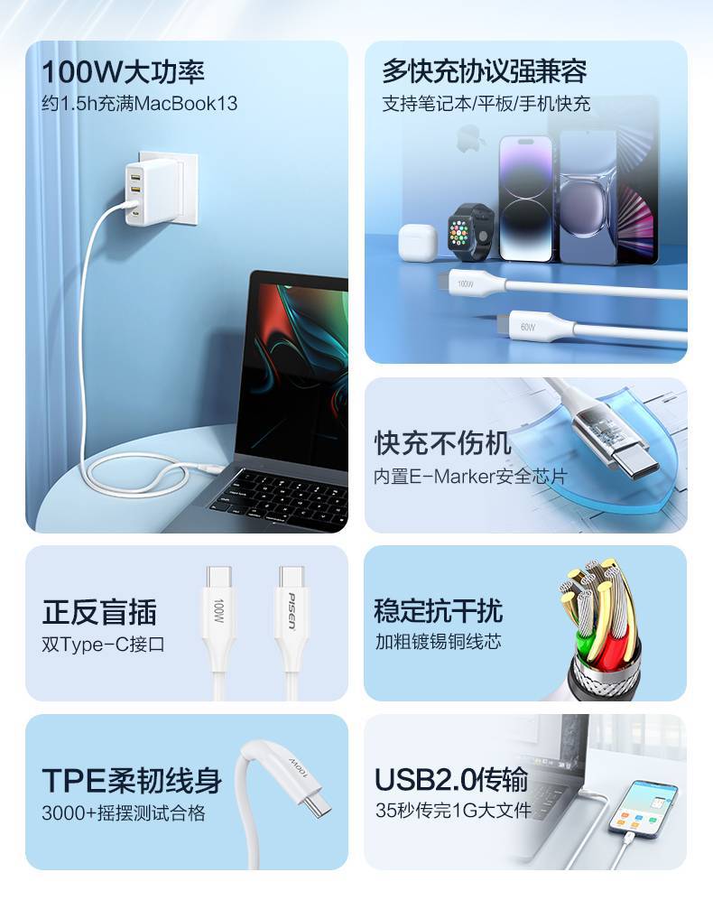 Cable de Datos Tipo C de Doble Cabezal Pinsheng PD100W Carga Rápida Tipo C a Tipo C Teléfono Móvil Tableta PC Express