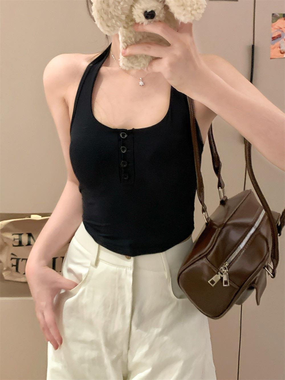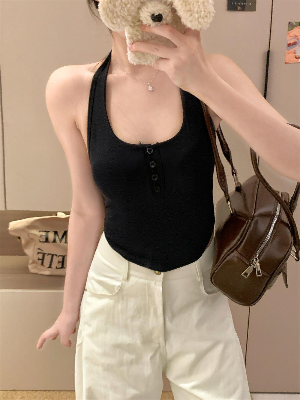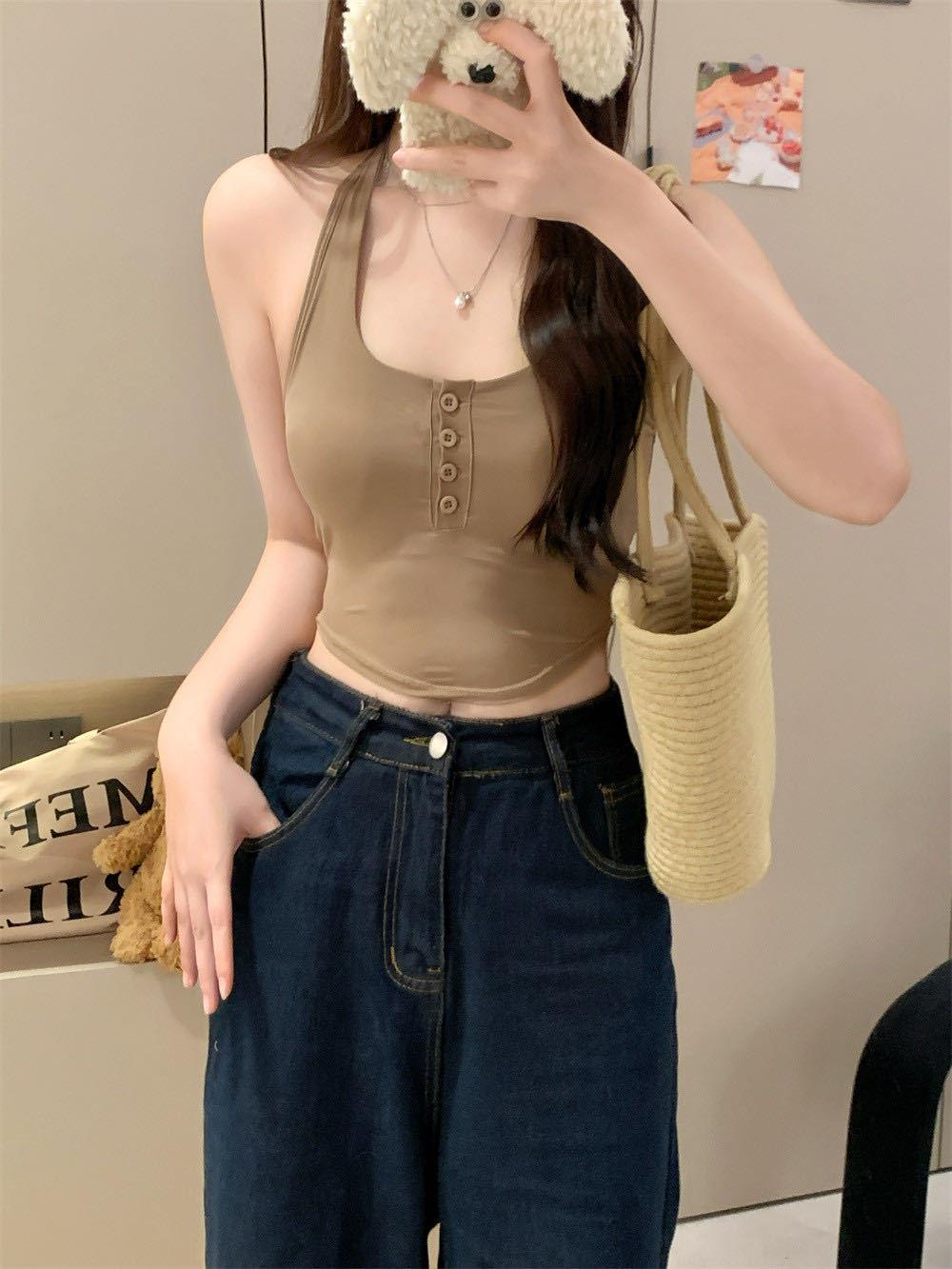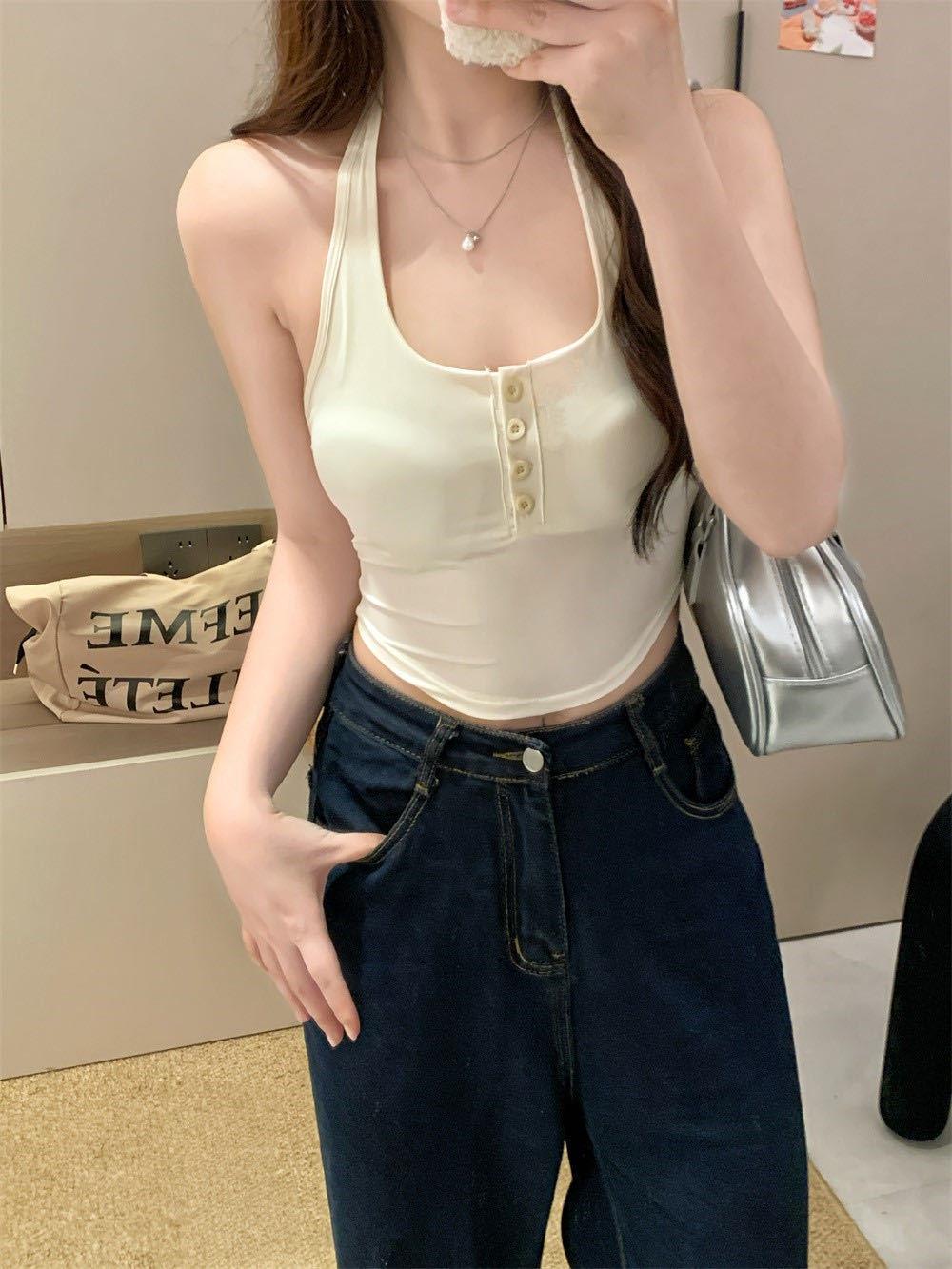 Verano Nuevo Sexy Top Halter de Tirantes Diseño de Botones Chaleco Mujeres Adelgazante Ropa Exterior con Almohadilla en el Pecho Top