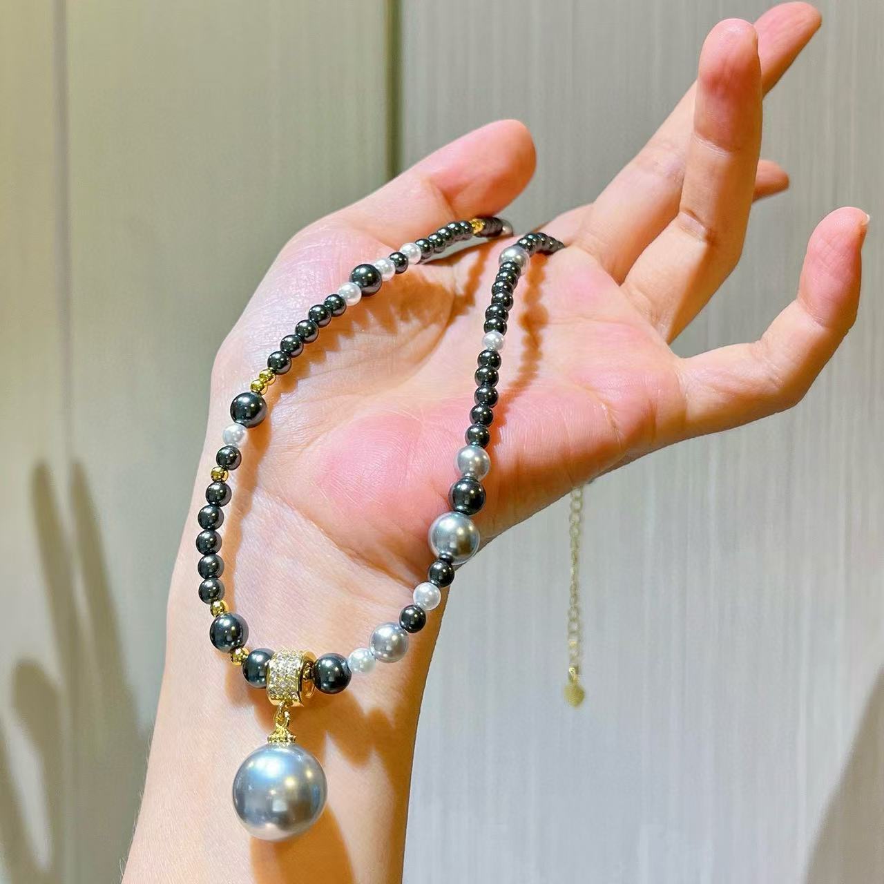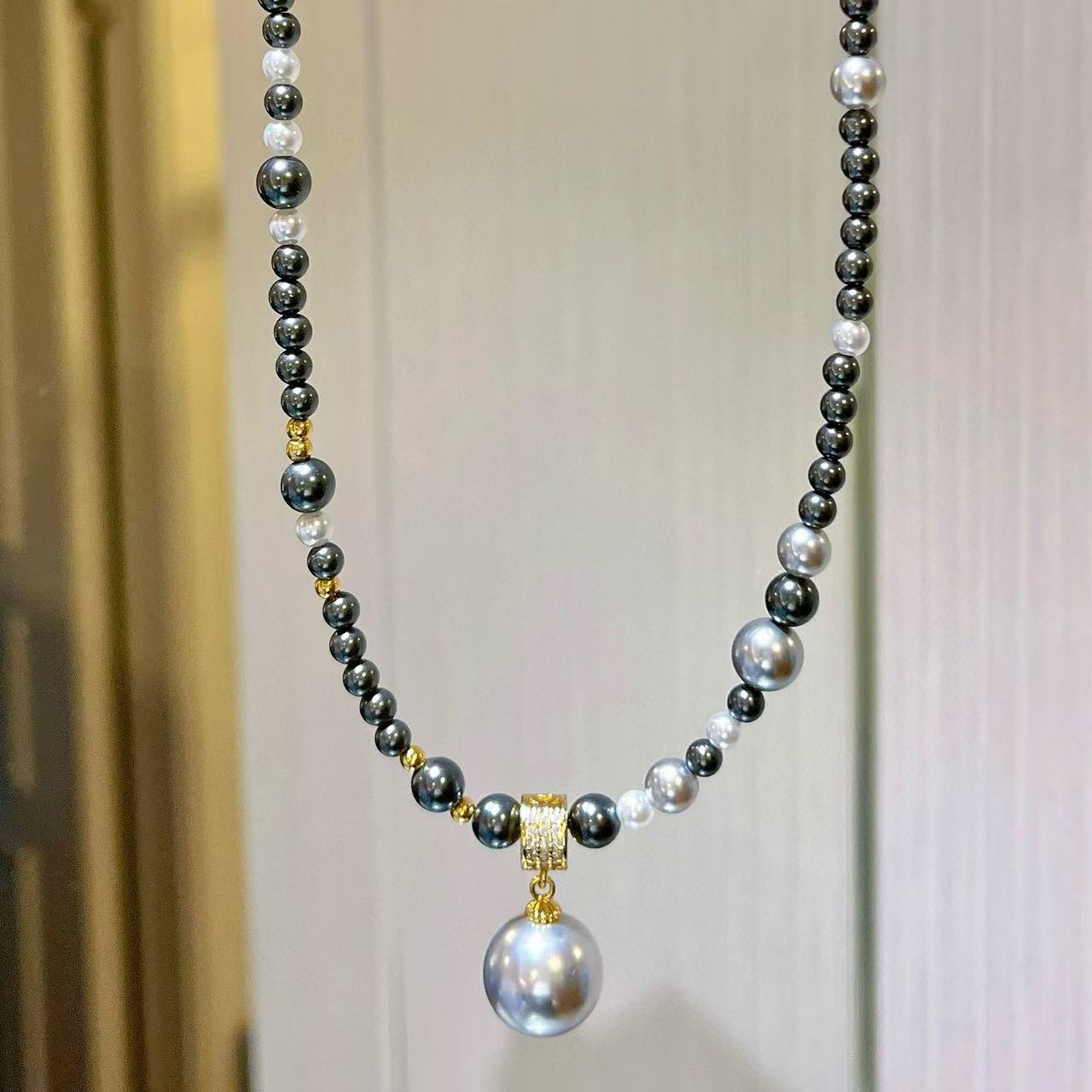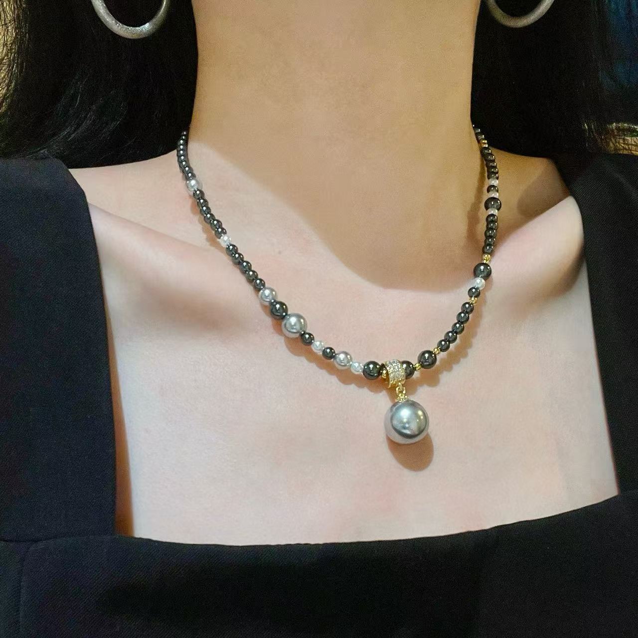 Collar de Perlas de Cristal Tahitiano de Imitación Gris Negro Noble Cadena Clavícula Colgante