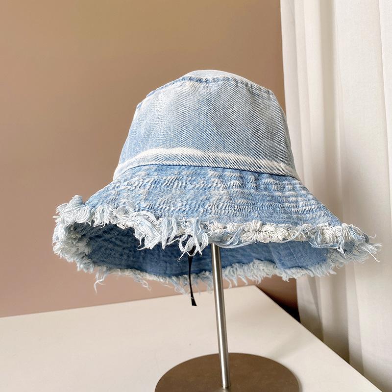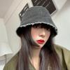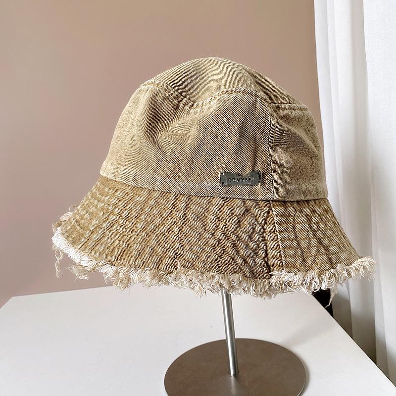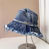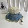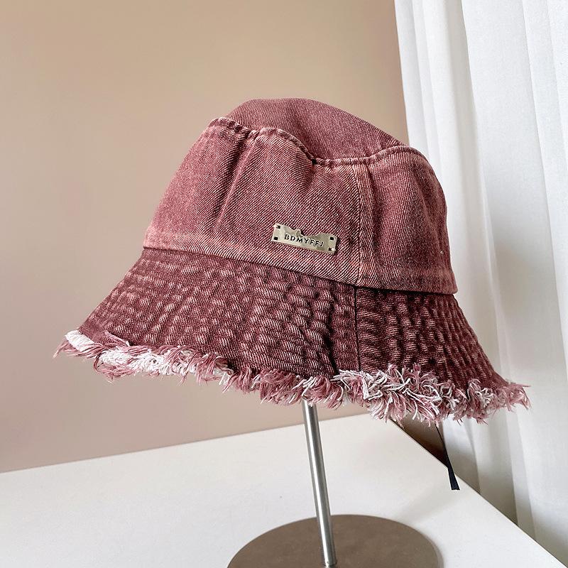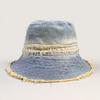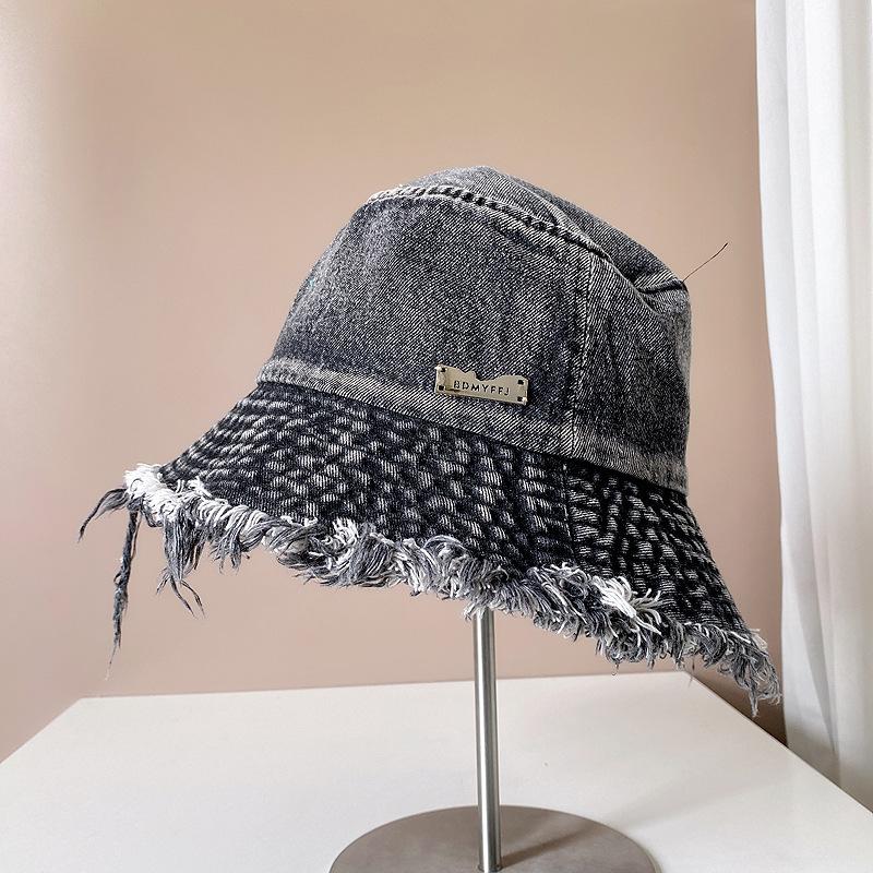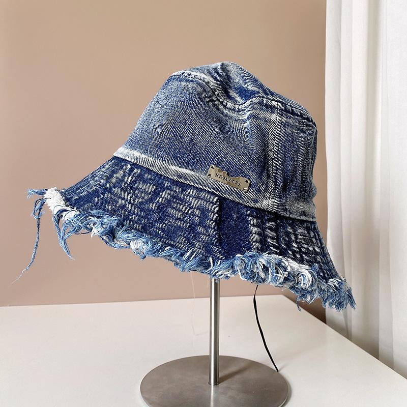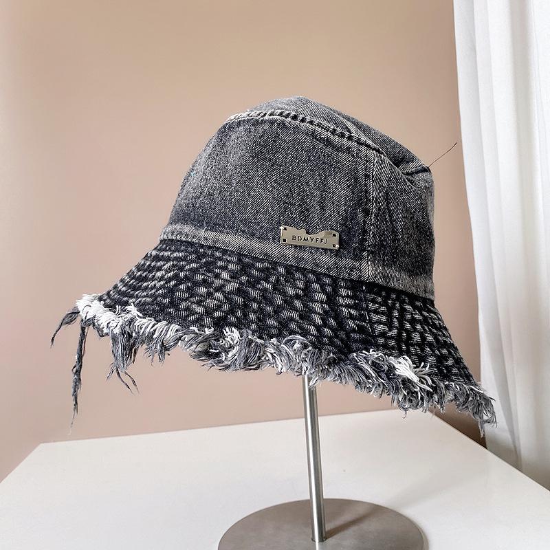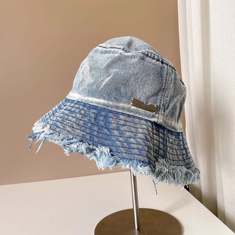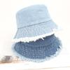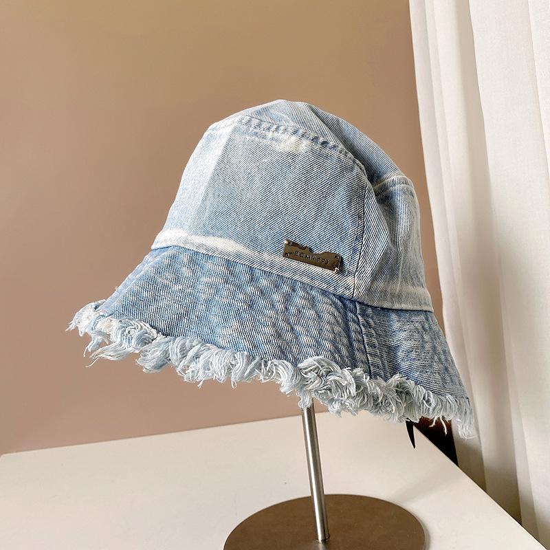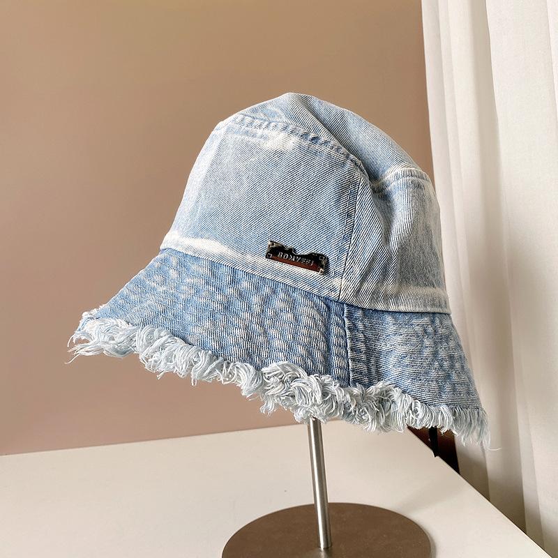Sombrero de pescador de mezclilla con borde crudo desgastado para mujer verano placa de metal decorativa sombrero de cubeta retro versátil casual para el sol sombrero de tela