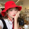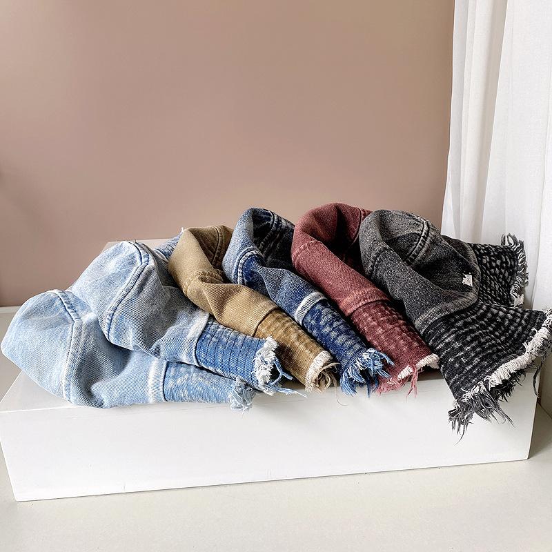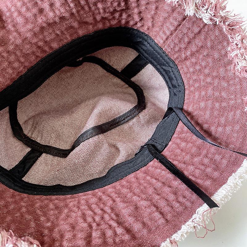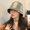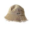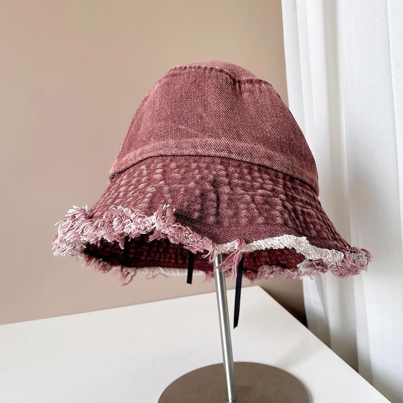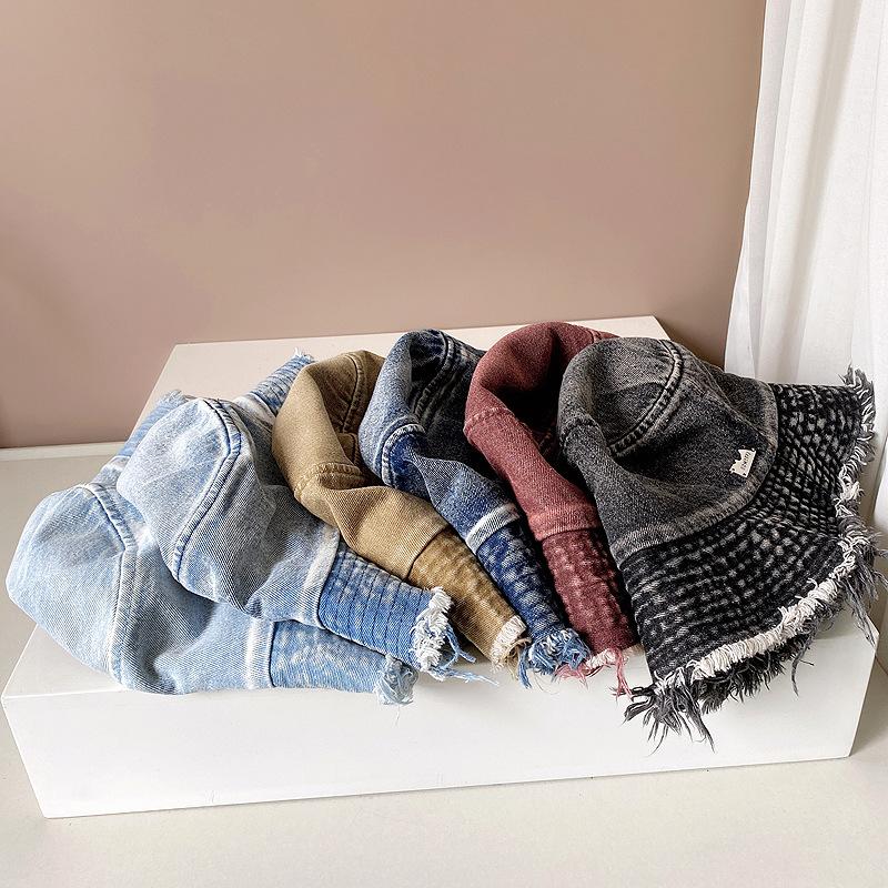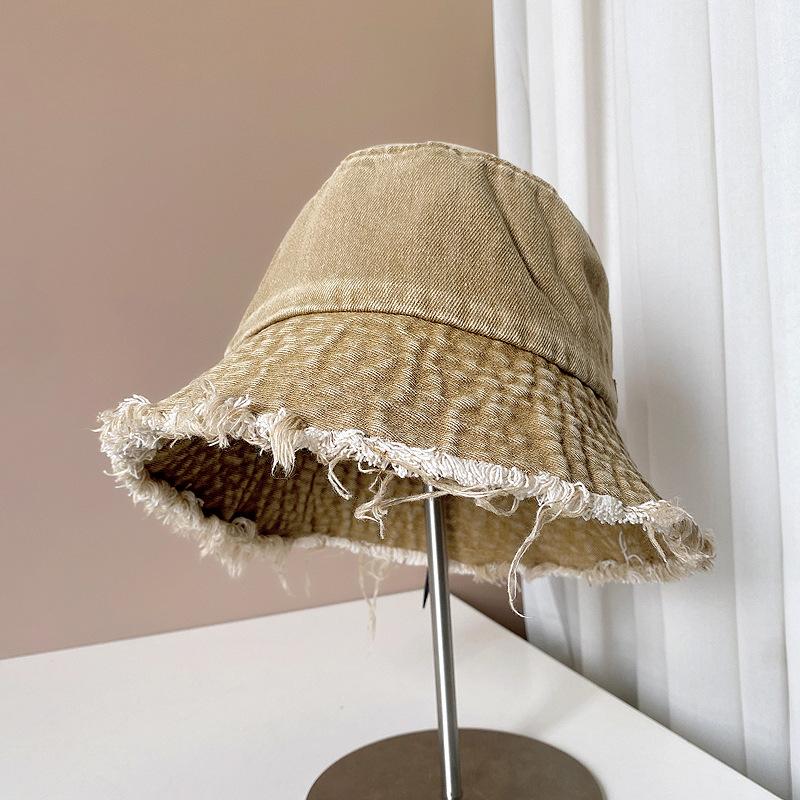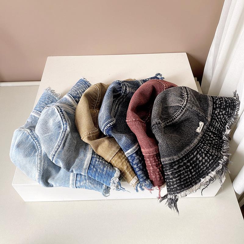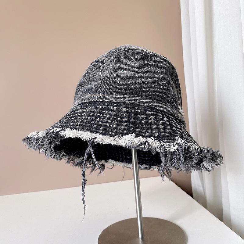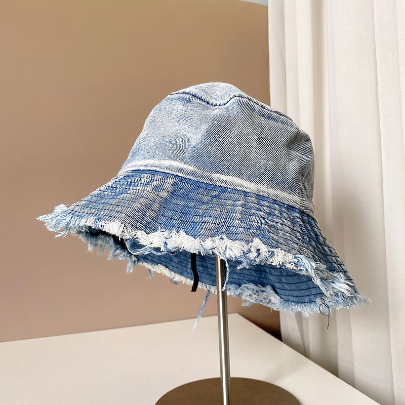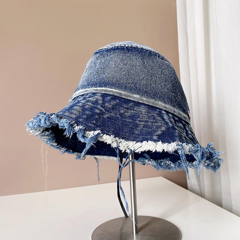 Sombrero de pescador de mezclilla con borde crudo desgastado para mujer verano placa de metal decorativa sombrero de cubeta retro versátil casual para el sol sombrero de tela