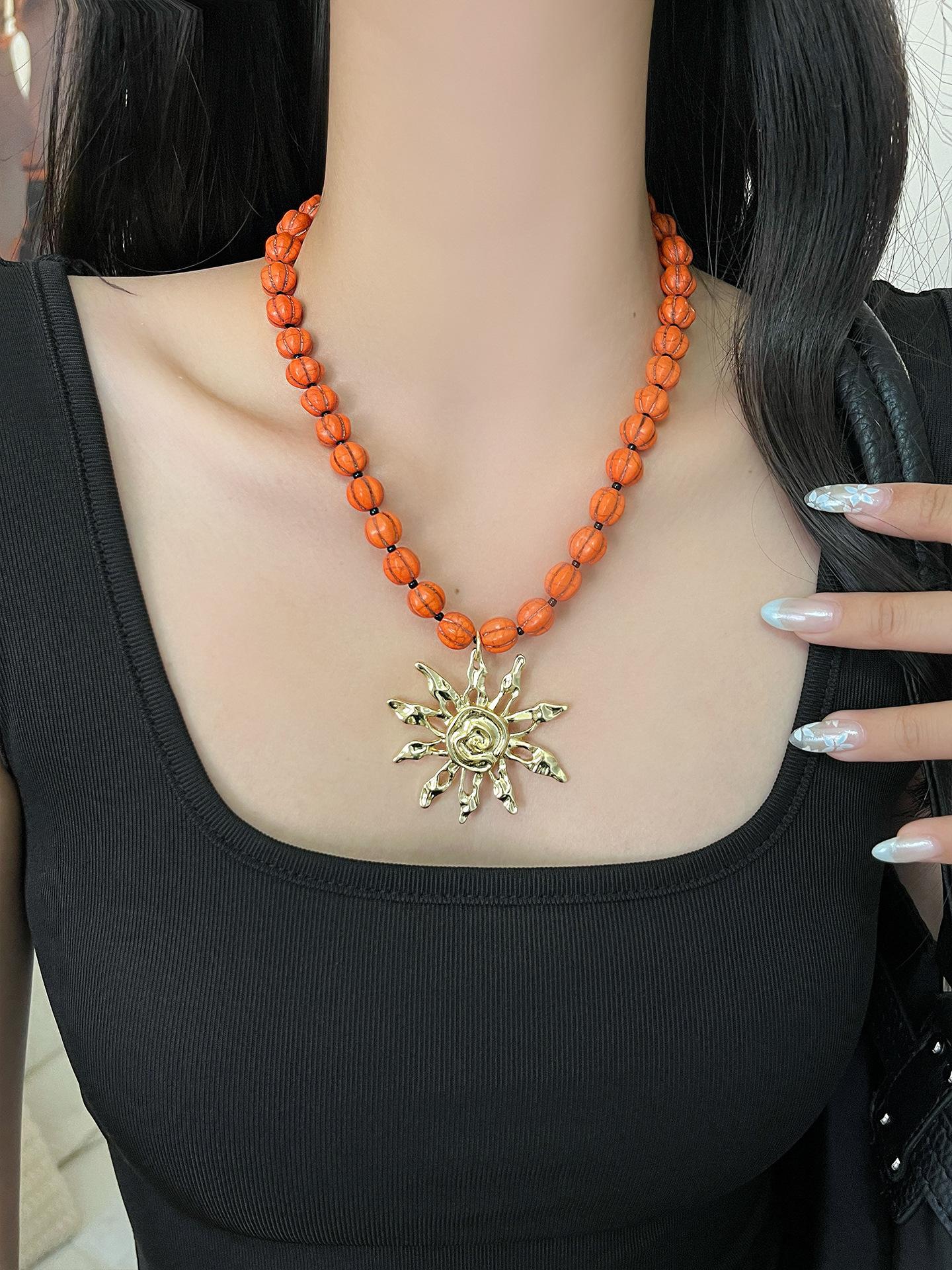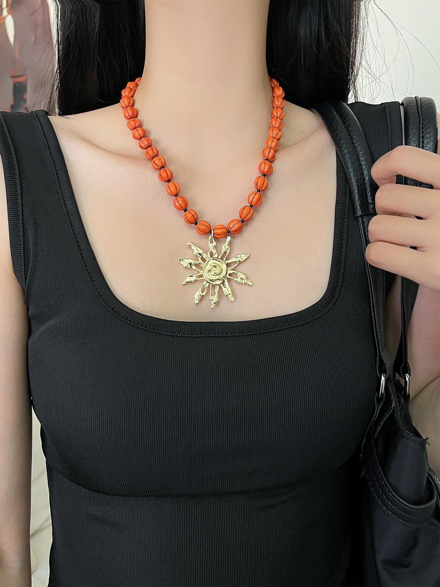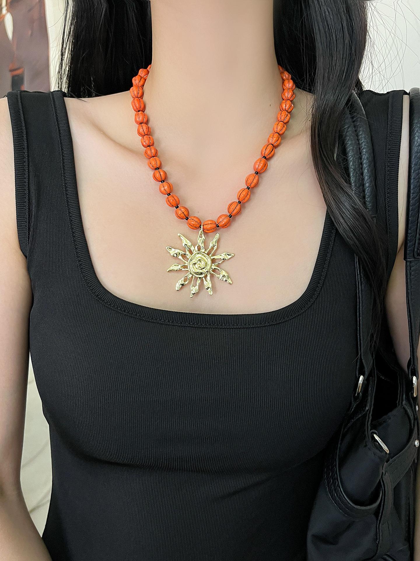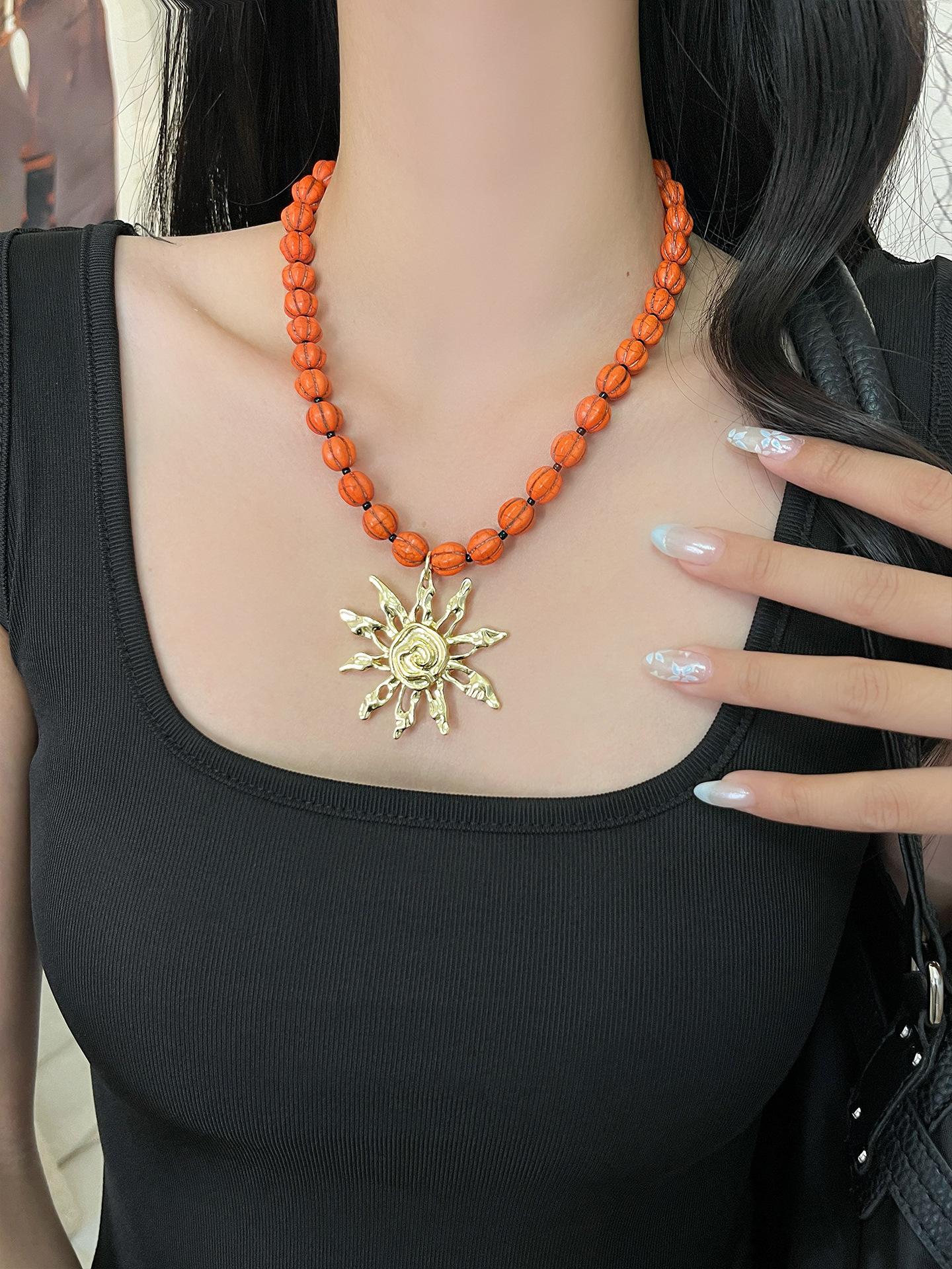 Collar con colgante de girasol dorado retro europeo y americano, diseño de nicho, cadena para clavícula con cuentas, temperamento individual, gargantilla para mujer