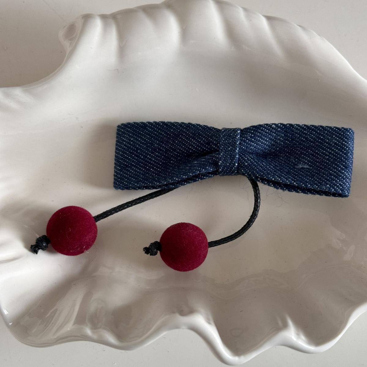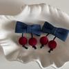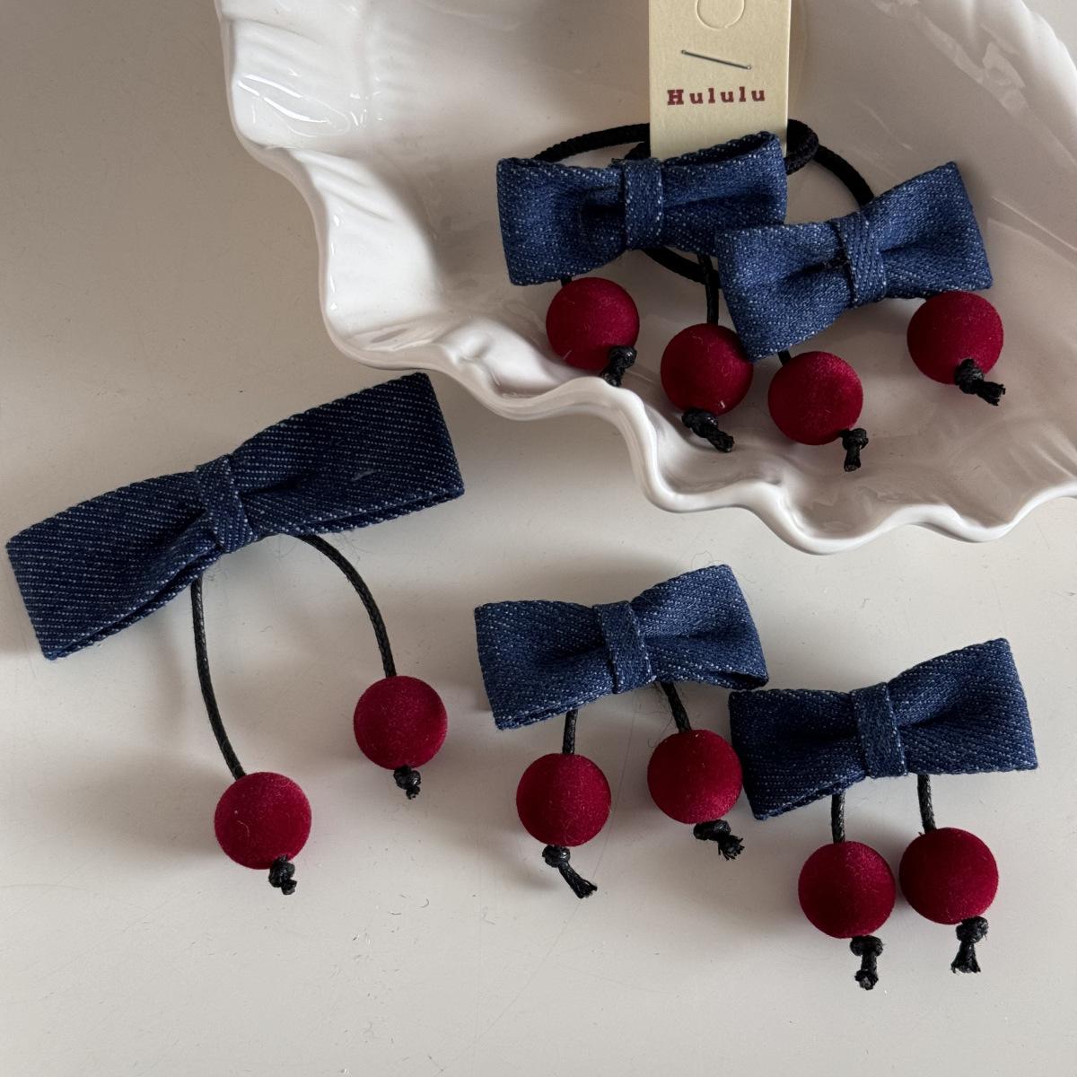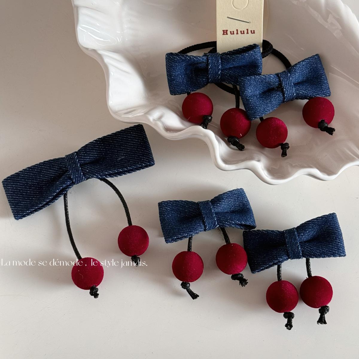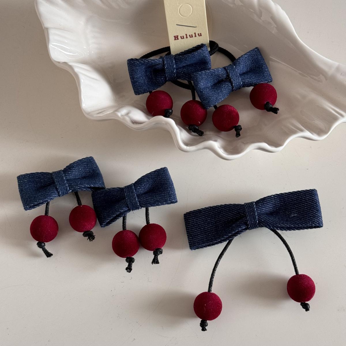 Tela de mezclilla azul Lazo de cereza con bola roja Horquilla para el cabello de niños Lindo anillo para el cabello de niñas Otoño e invierno Adorno para la cabeza Horquilla