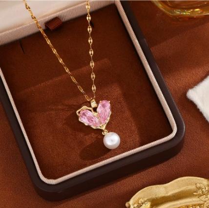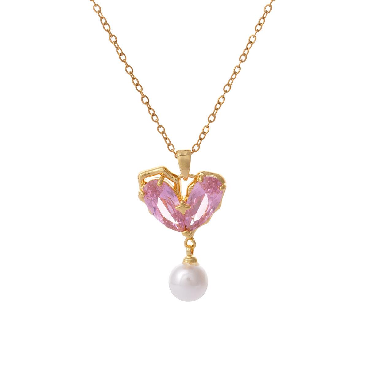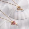N32058PK#Pink Zircon Heart Tassel Pearl Necklace