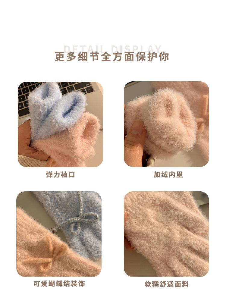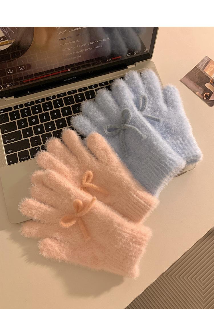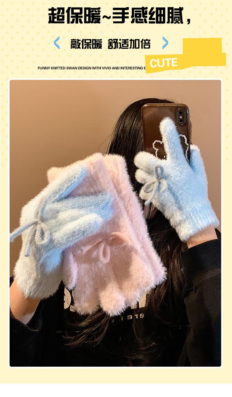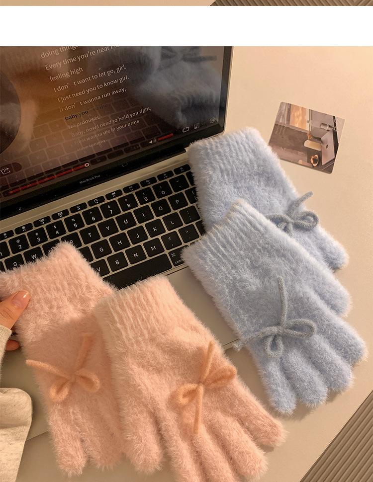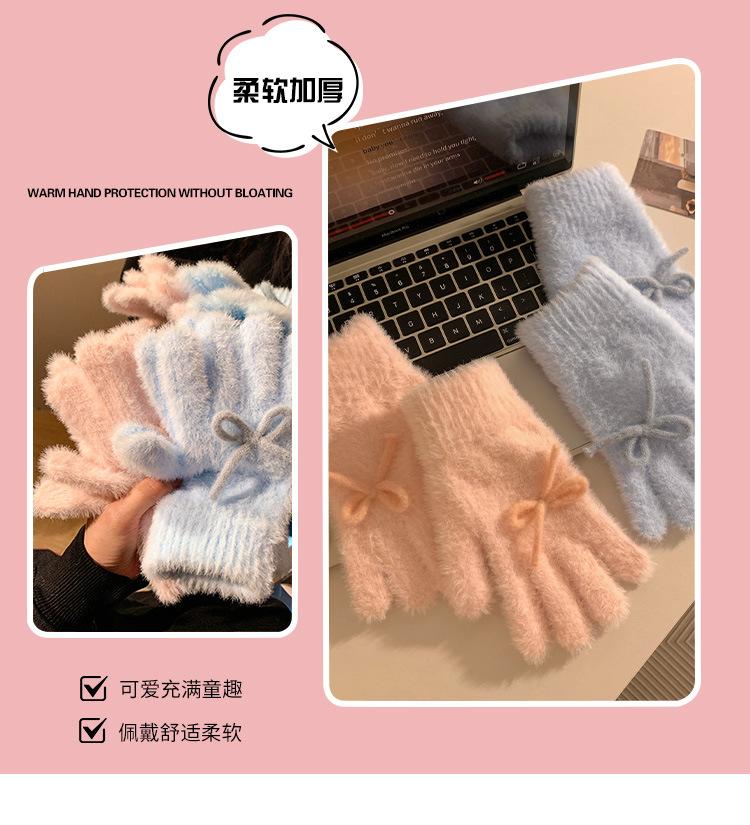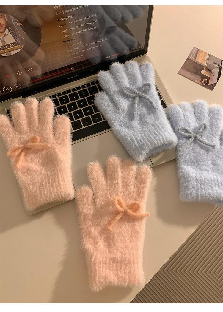 Guantes de Punto Peludos sin Dedos con Lazo Azul Lindo Estilo Coreano para Mujer Otoño Invierno Cálidos a Prueba de Frío Plus Terciopelo