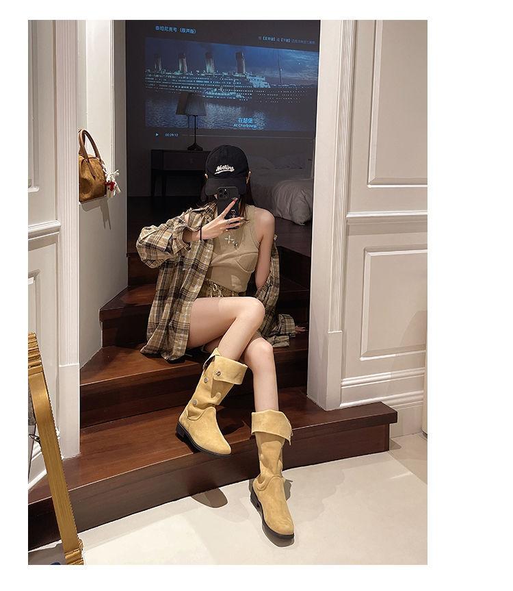 Botas ajustadas de tacón grueso 2025 otoño e invierno nuevo estilo ropa exterior botas por encima de la rodilla botas Martin temperamento antideslizantes botas slip-on de color sólido