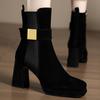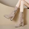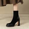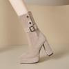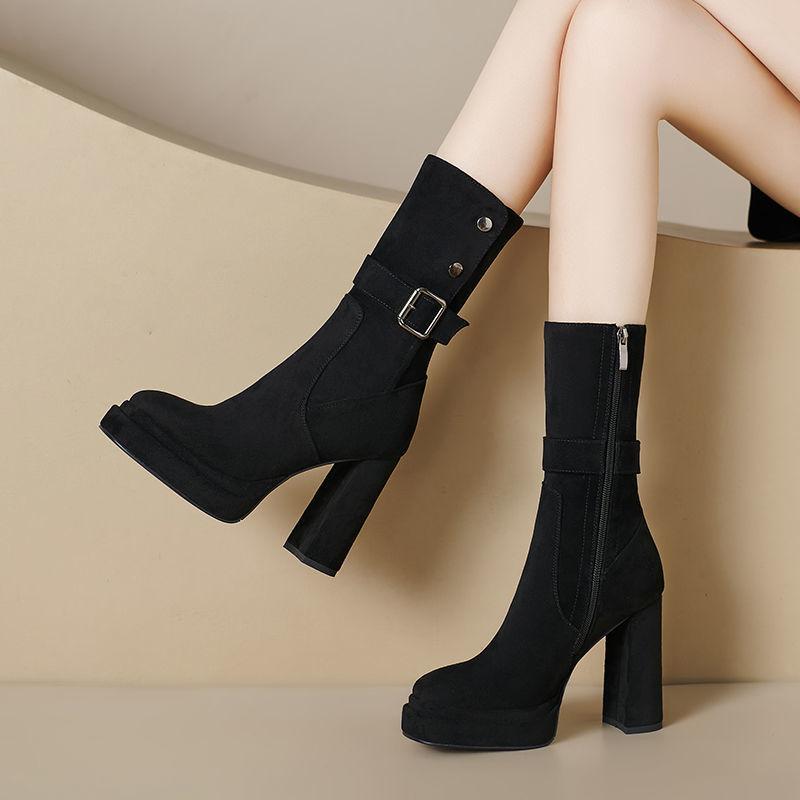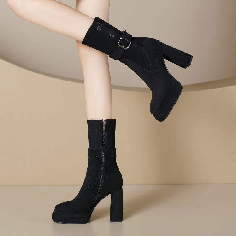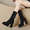 2025 Botines de Plataforma de Tacón Super Alto para Mujer Punta Redonda Tacón Chunky Suela Gruesa Albaricoque Piel Elástica Hasta Media Pantorrilla Botas Individuales Negras