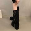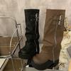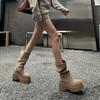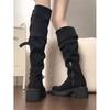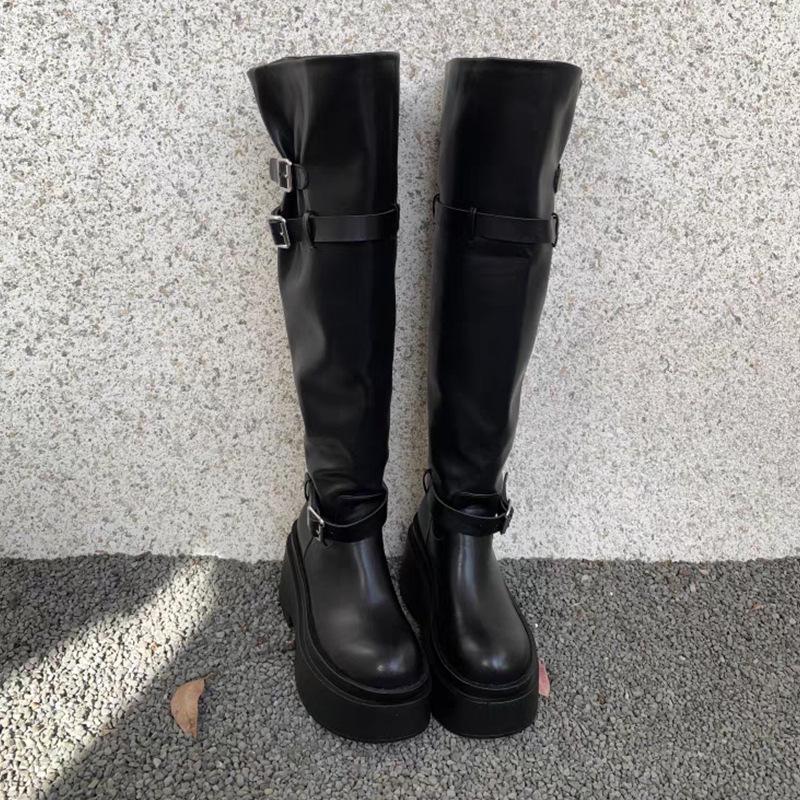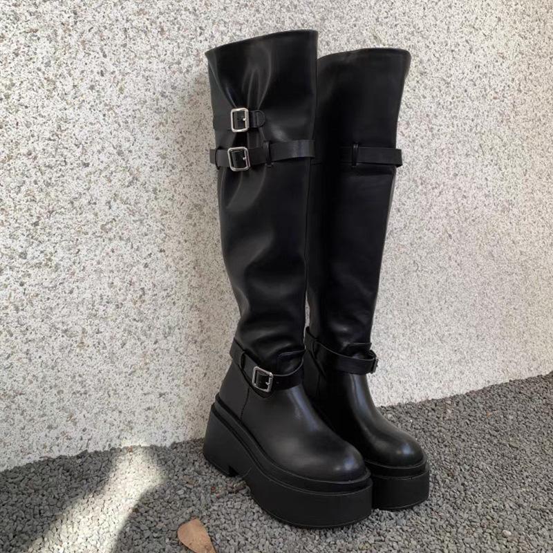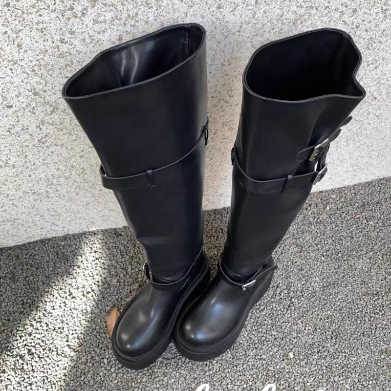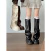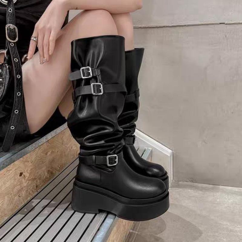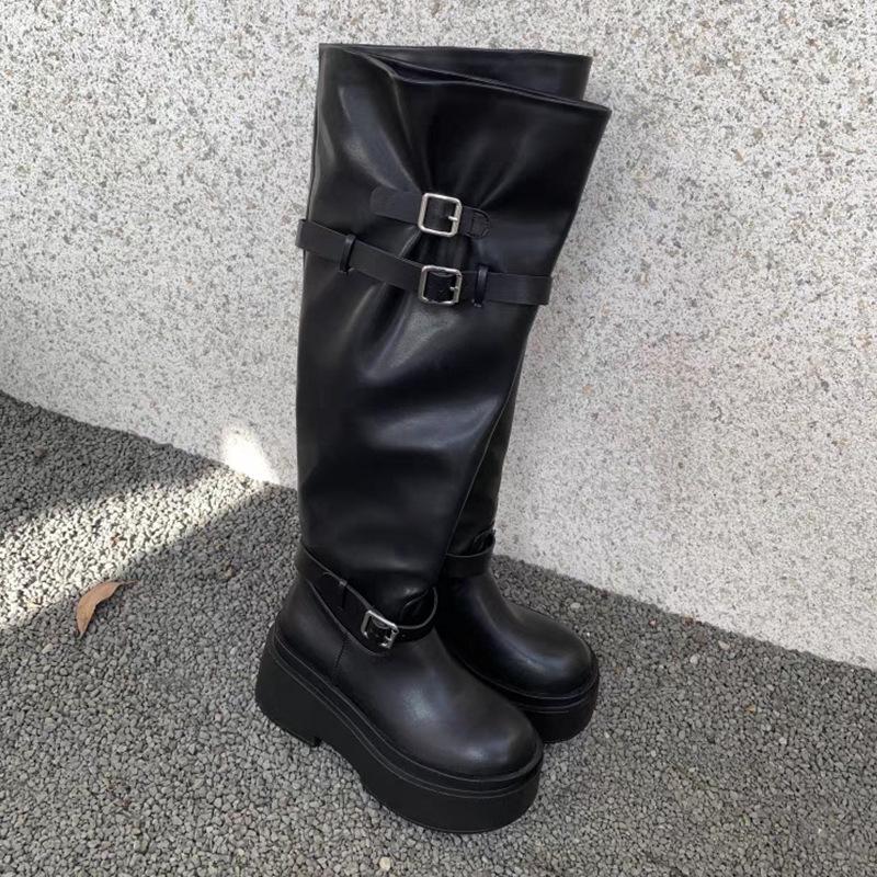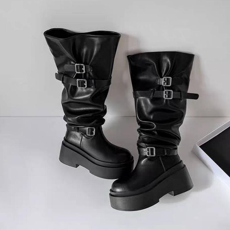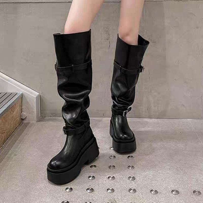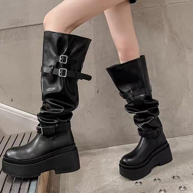 Song Xixi 2025 Primavera y Otoño Nuevas Botas Apiladas de Punta Redonda con Suela Gruesa para Circunferencia de Pantorrilla Grande Botas de Caballero de Caña Alta con Hebilla para Chica Hot
