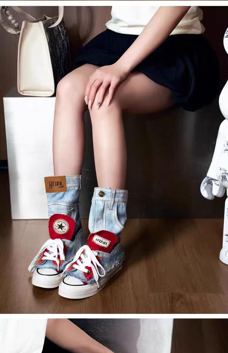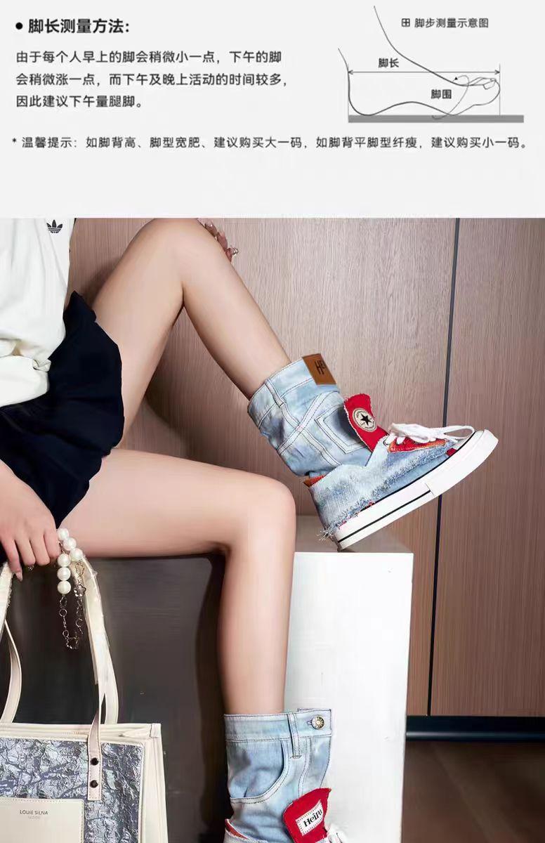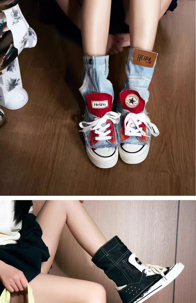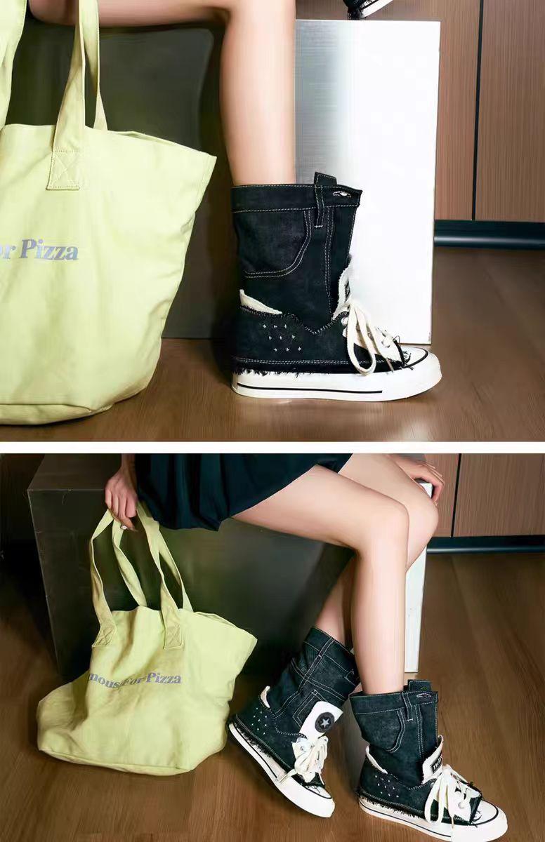 2025 Nuevo Estilo Pato Mandarín Bloque de Color AB Denim Lavado Botas de Media Caña con Cordones Botas Altas Botas Largas Botas Martin Zapatos de Mujer
