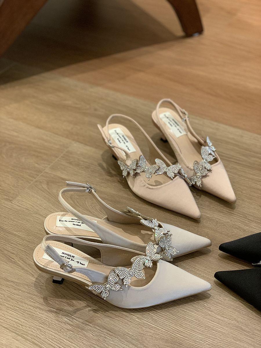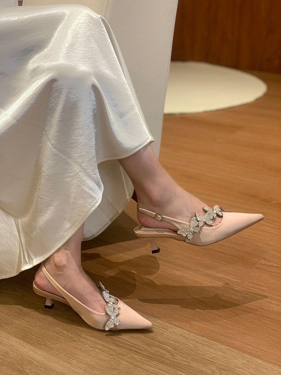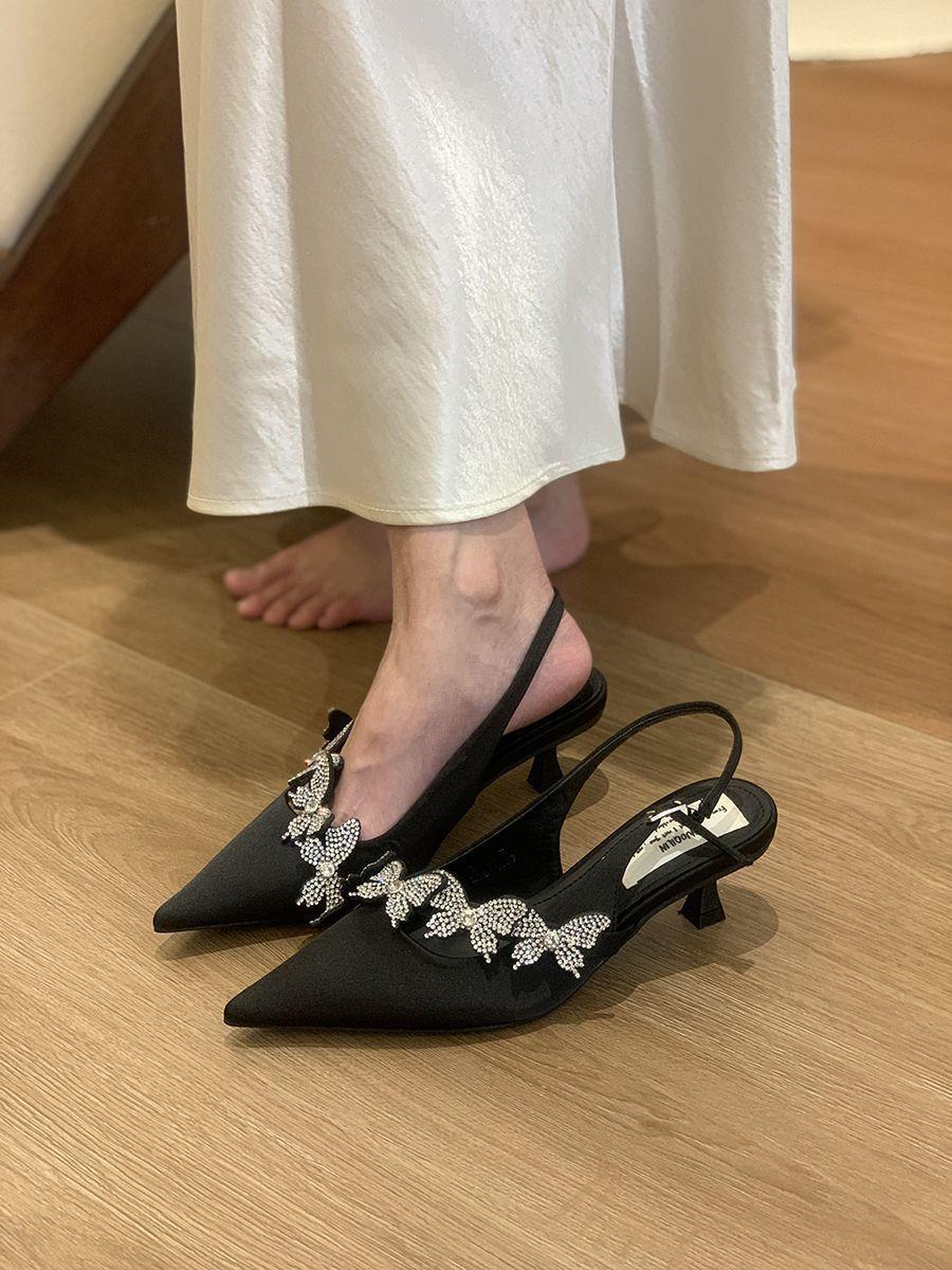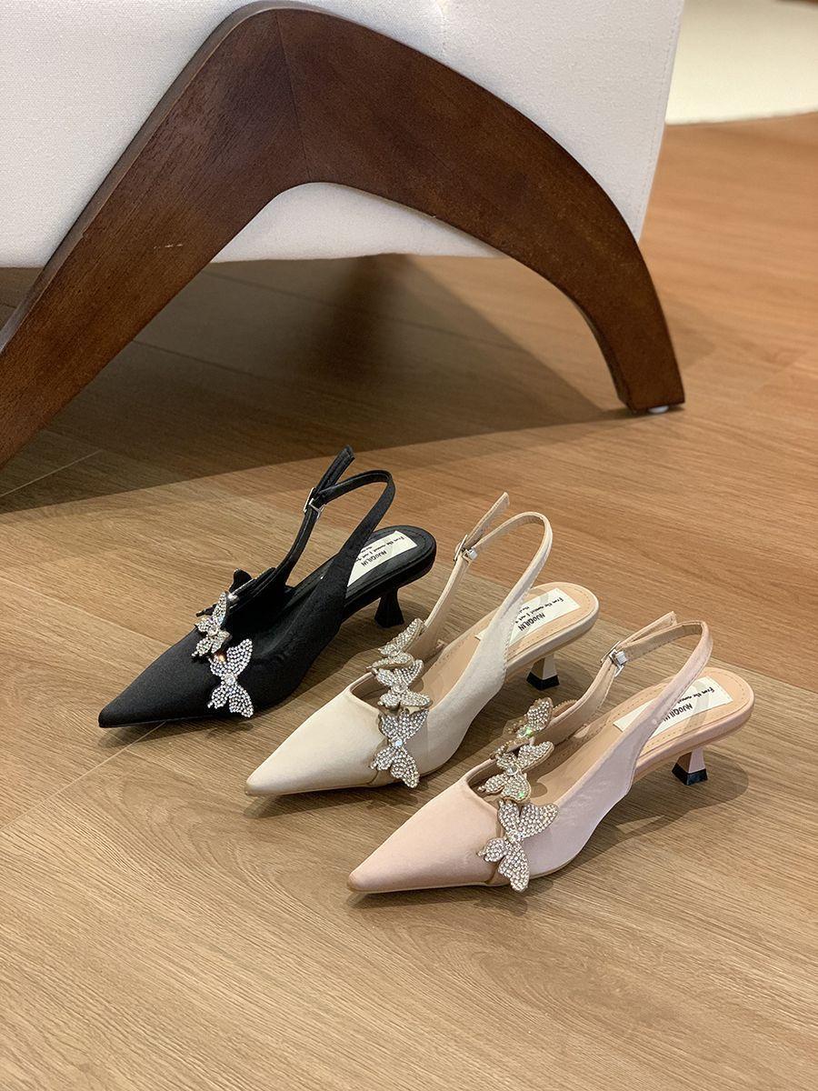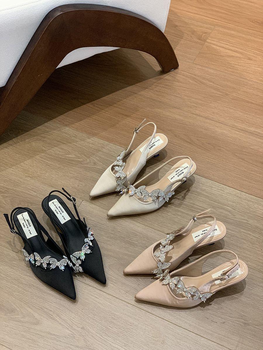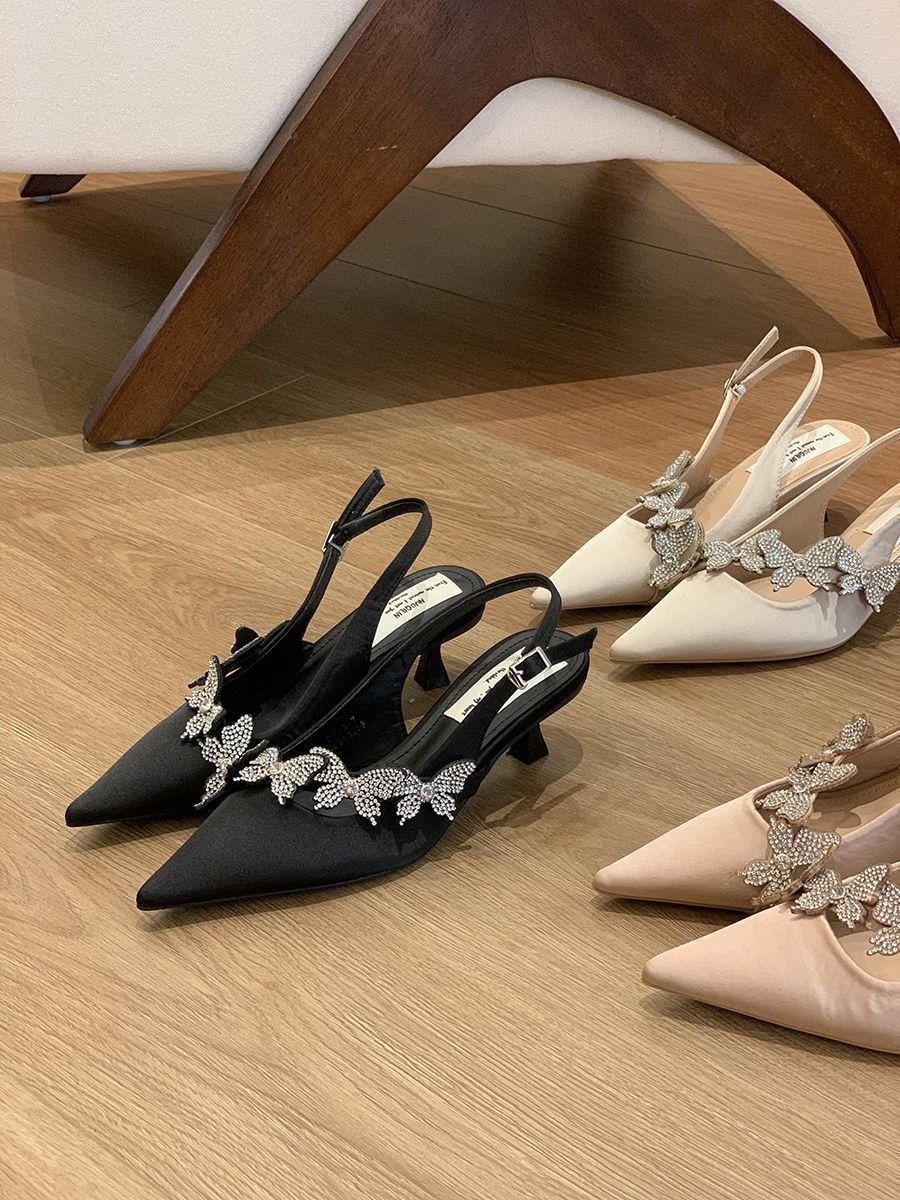 Zapatos Únicos de Punta con Pedrería de Una Tira Verano 2025 Nuevo Estilo Chino Mariposa Satén de Seda Tacones Altos Tacón de Aguja Sandalias de Punta Cerrada Mujer