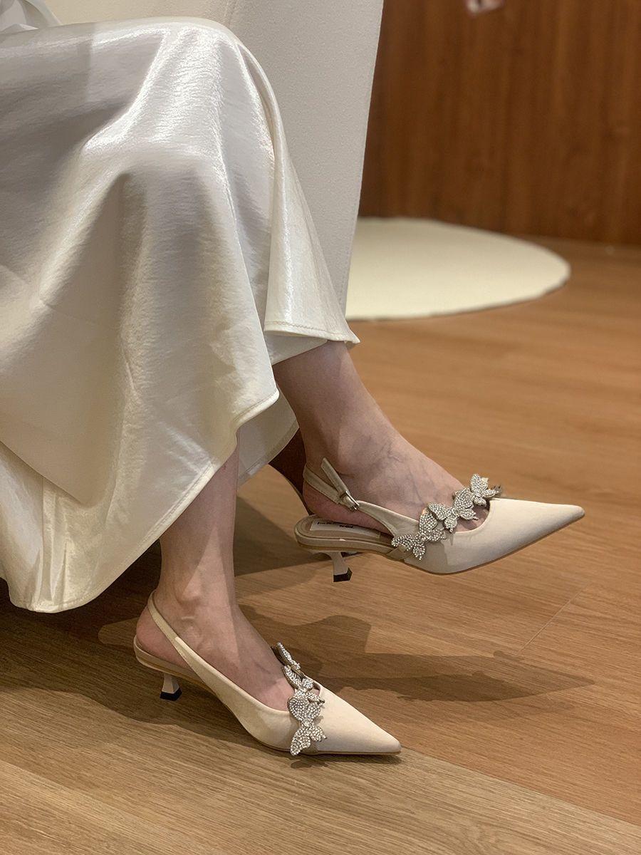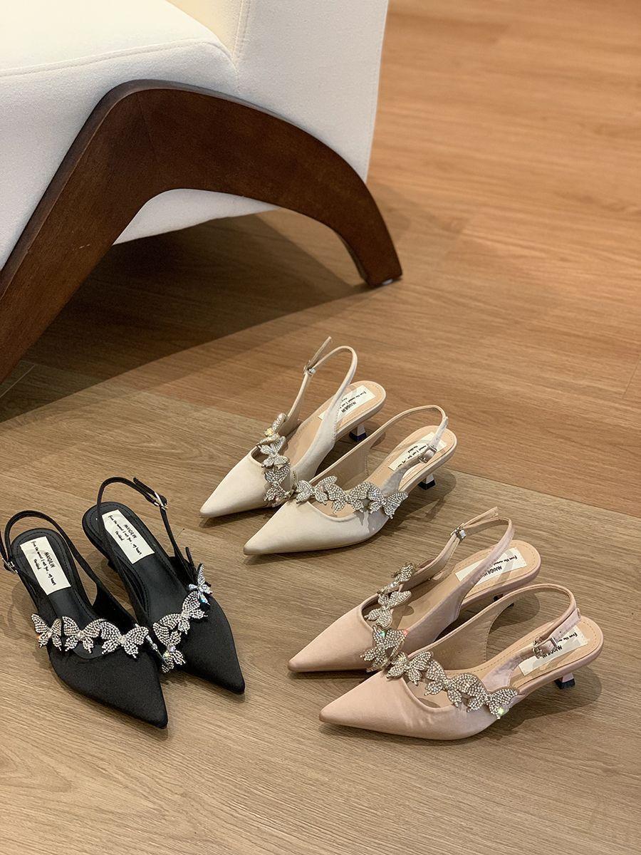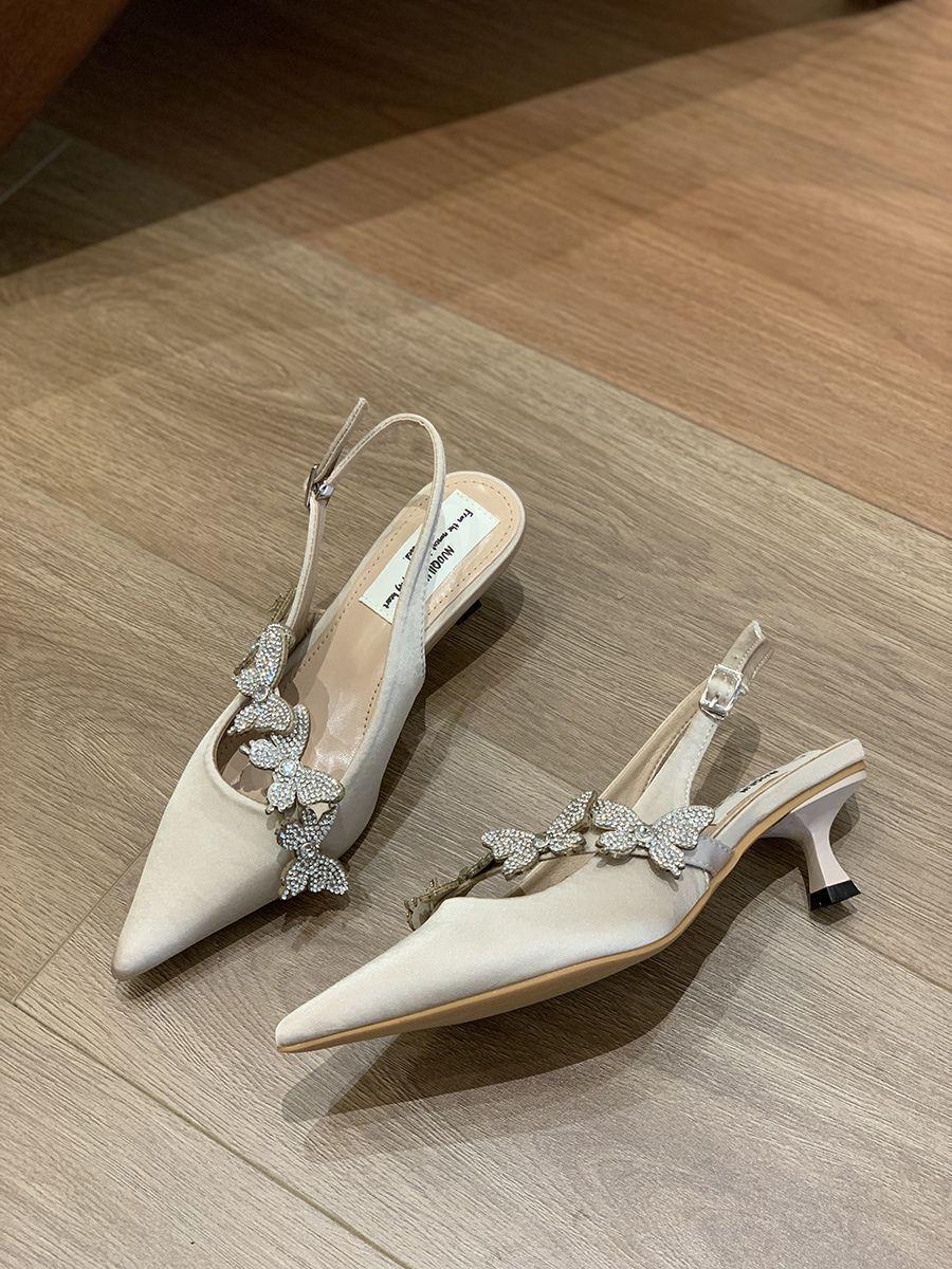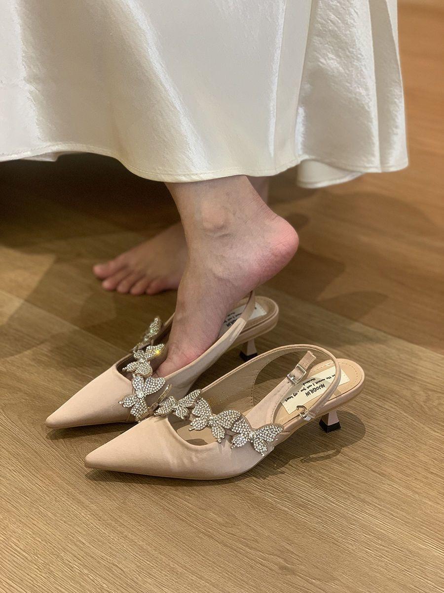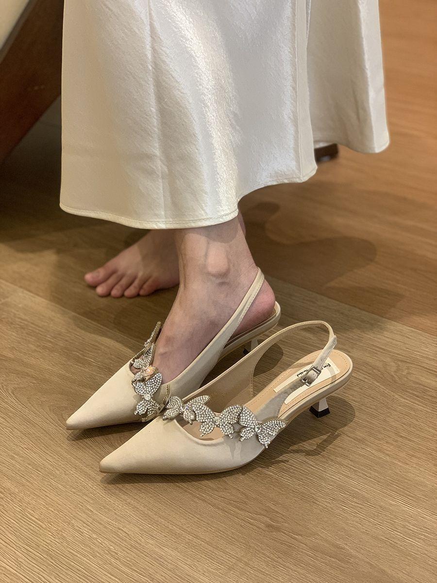 Zapatos Únicos de Punta con Pedrería de Una Tira Verano 2025 Nuevo Estilo Chino Mariposa Satén de Seda Tacones Altos Tacón de Aguja Sandalias de Punta Cerrada Mujer