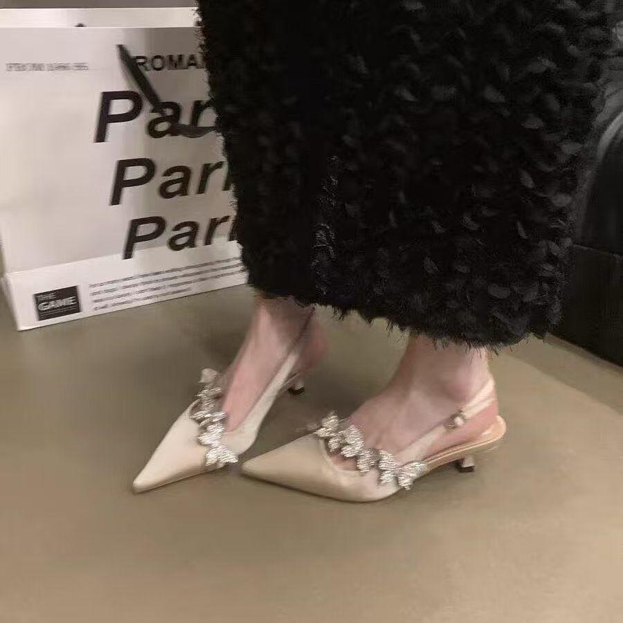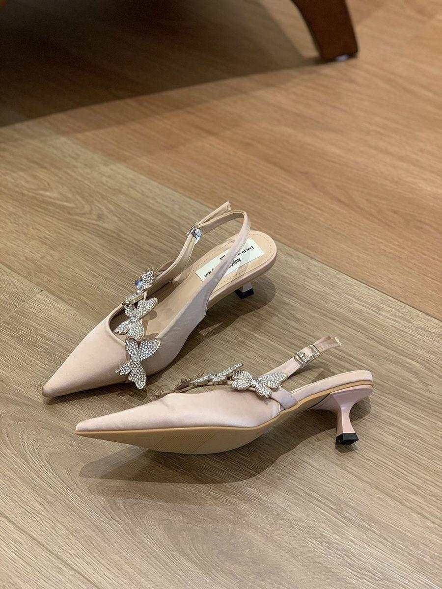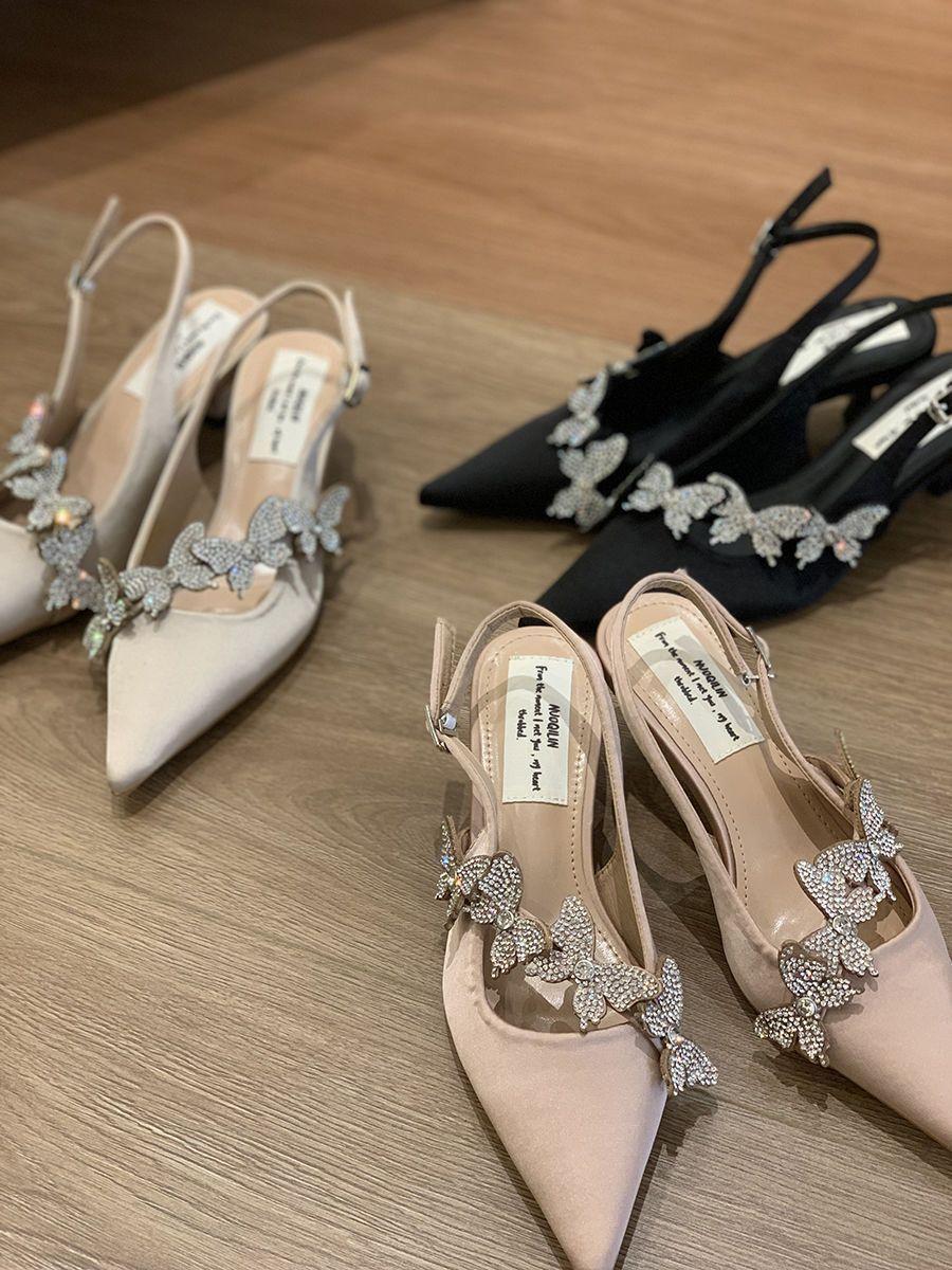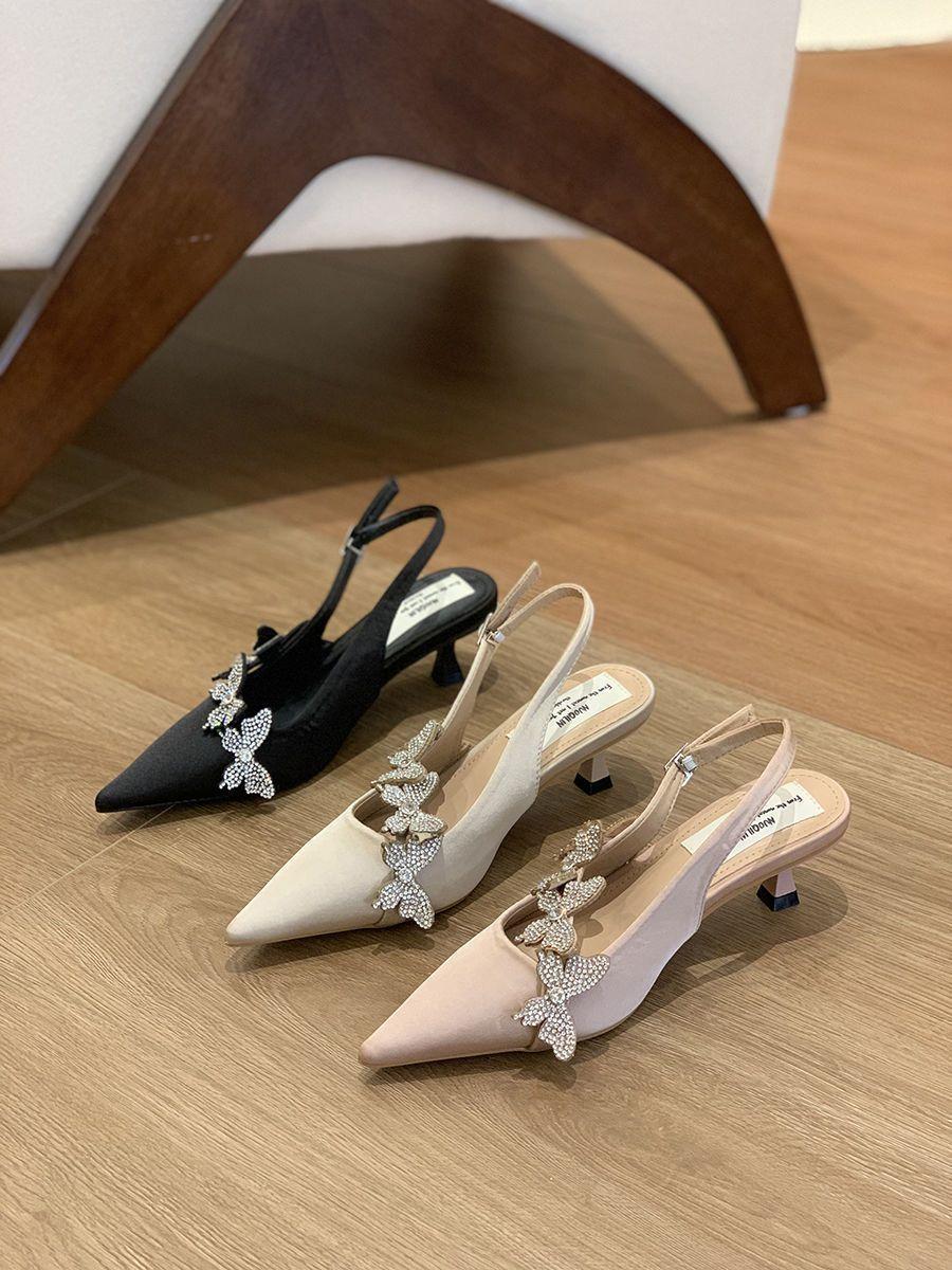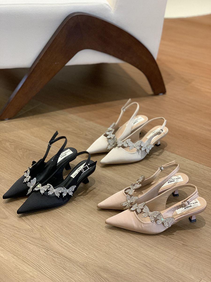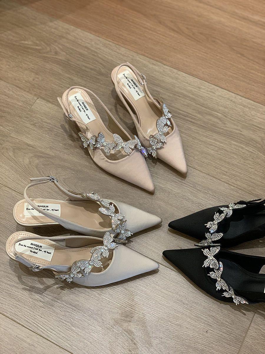Zapatos Únicos de Punta con Pedrería de Una Tira Verano 2025 Nuevo Estilo Chino Mariposa Satén de Seda Tacones Altos Tacón de Aguja Sandalias de Punta Cerrada Mujer