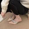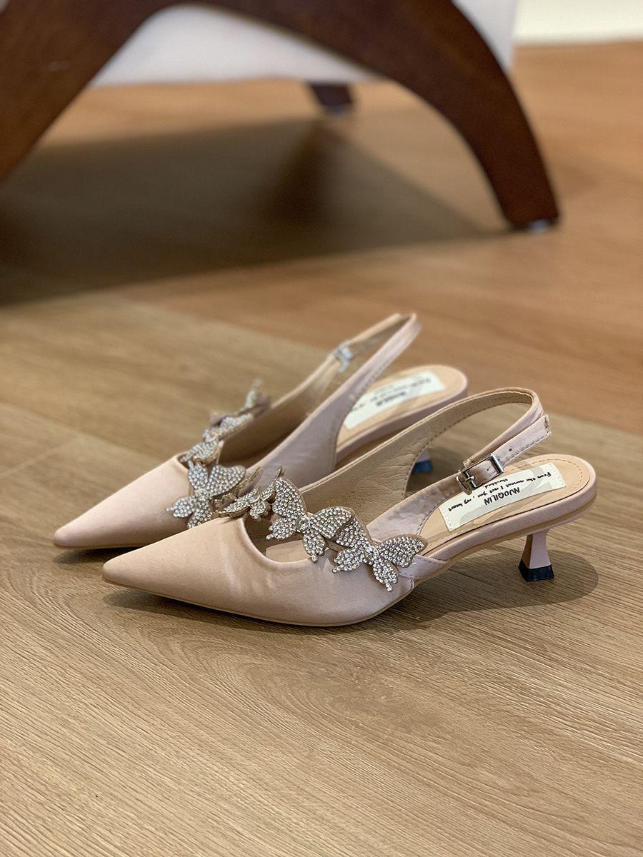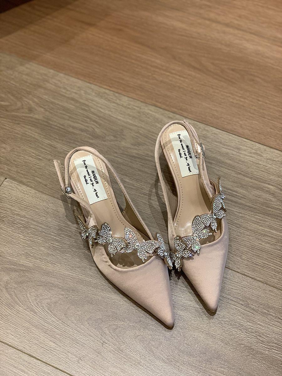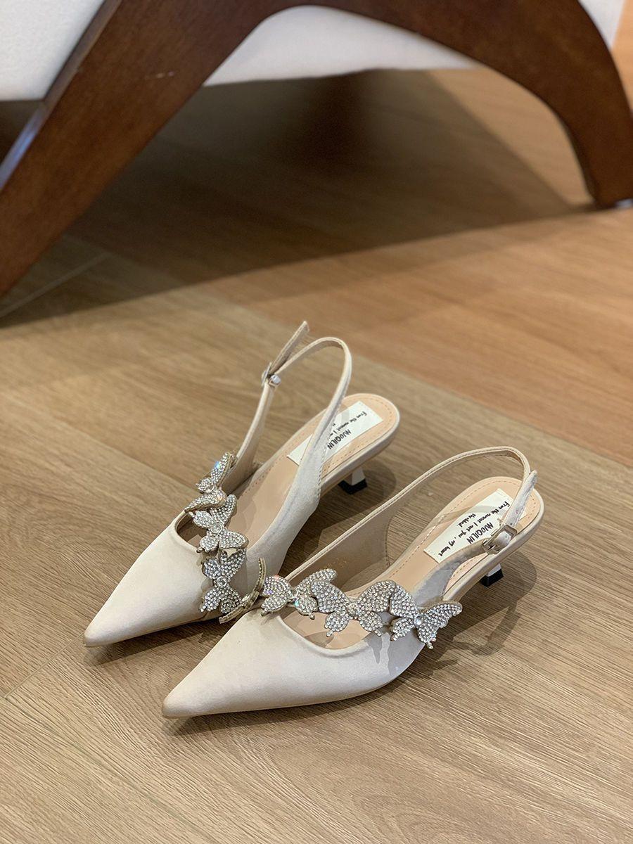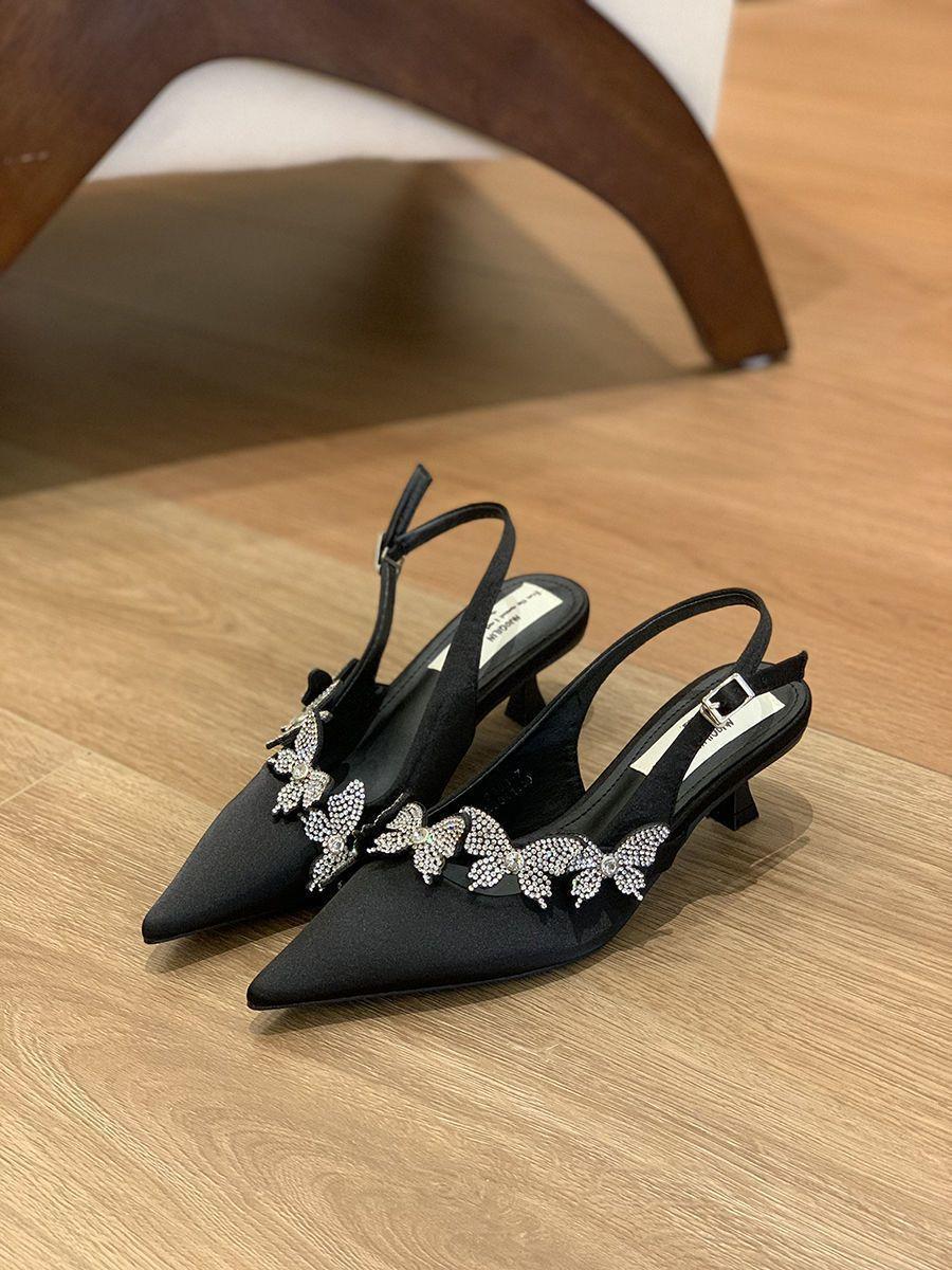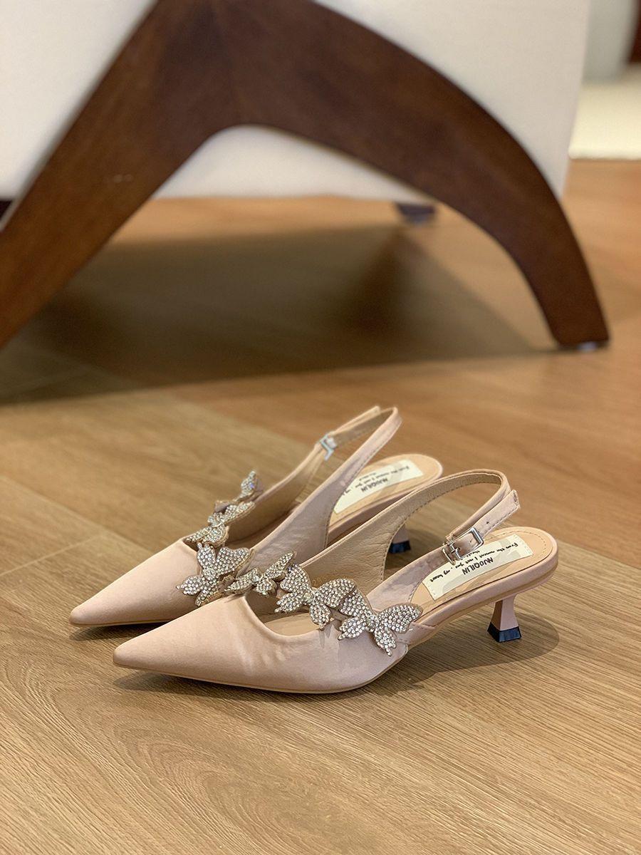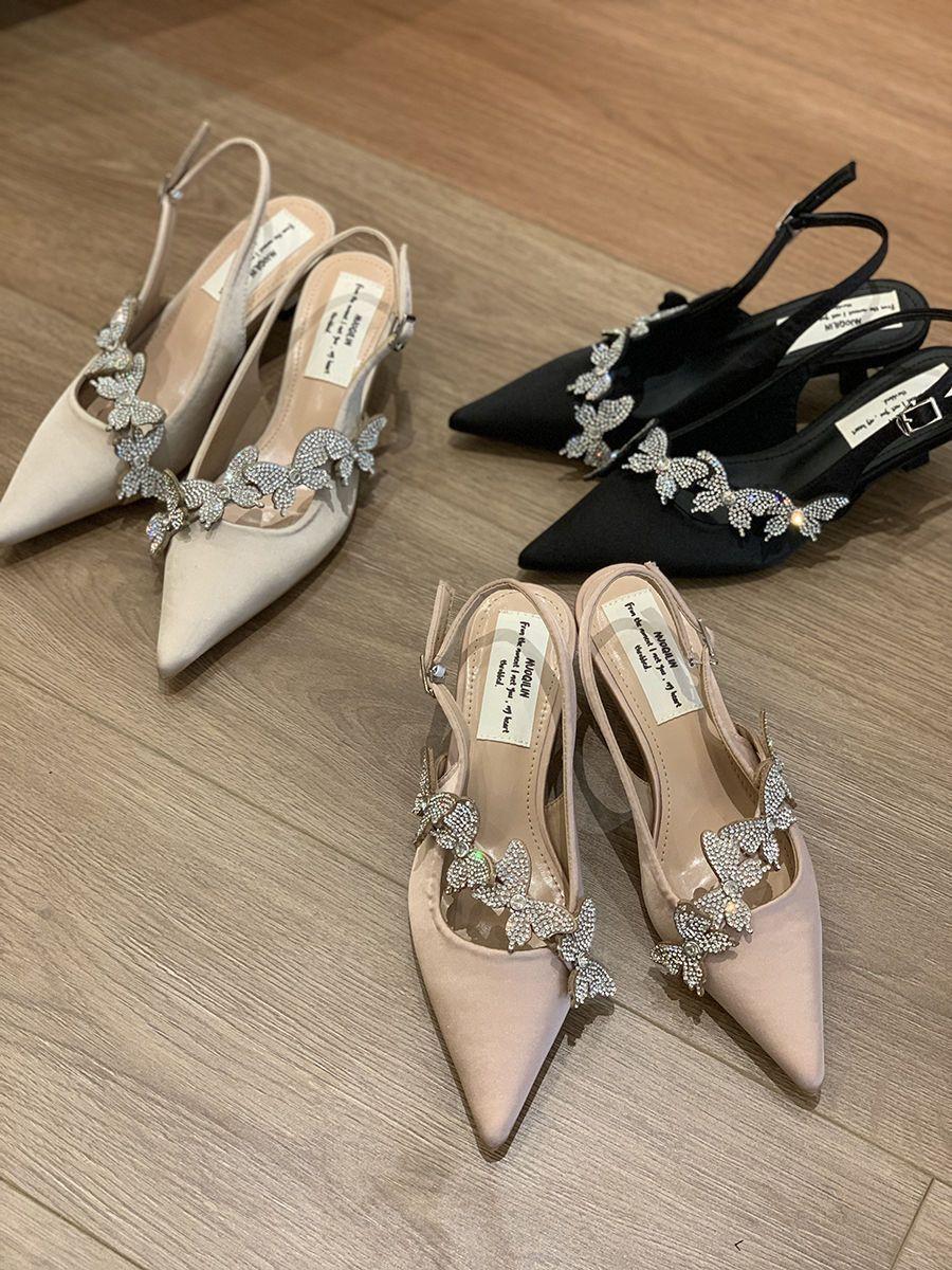 Zapatos Únicos de Punta con Pedrería de Una Tira Verano 2025 Nuevo Estilo Chino Mariposa Satén de Seda Tacones Altos Tacón de Aguja Sandalias de Punta Cerrada Mujer