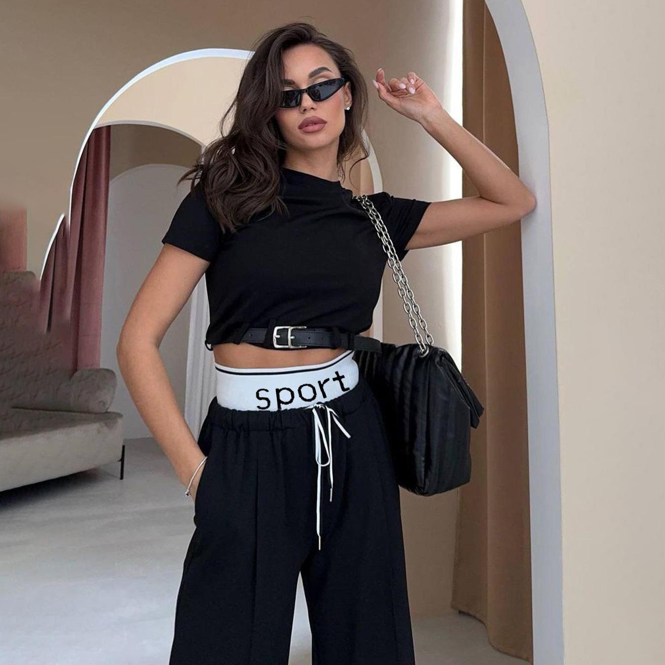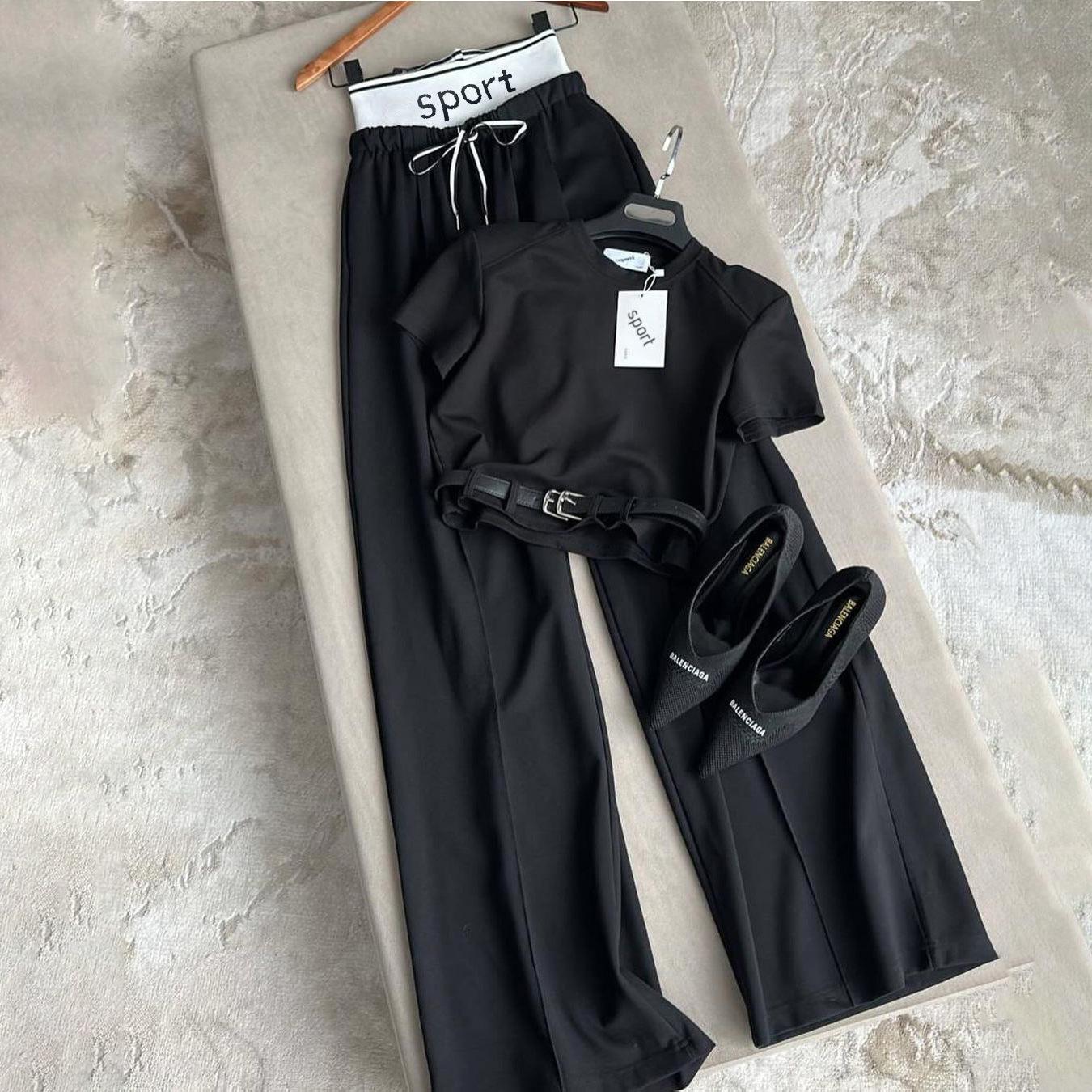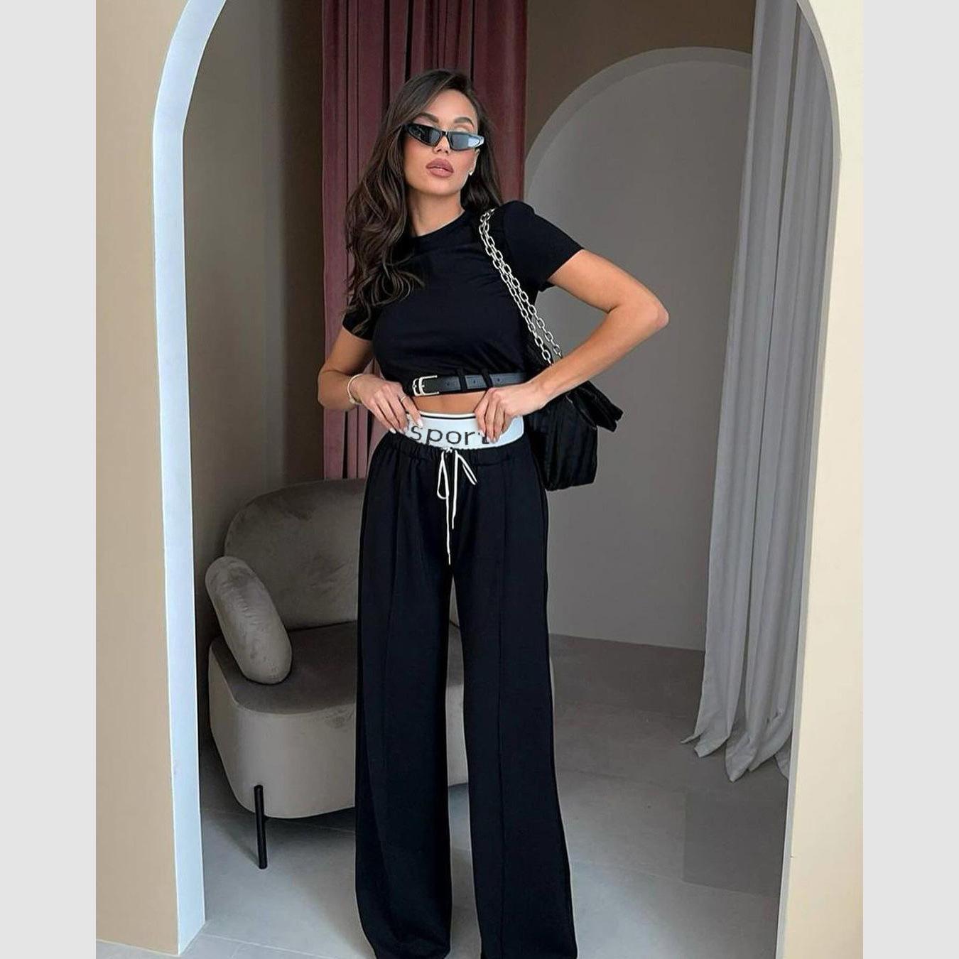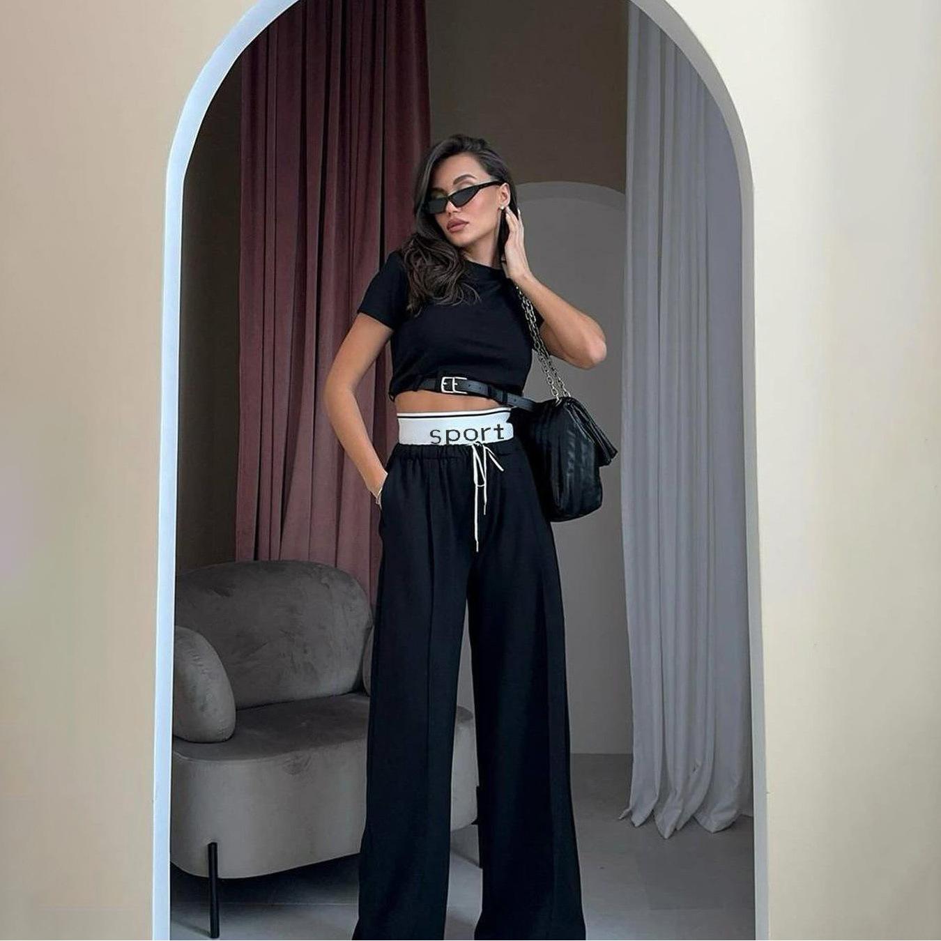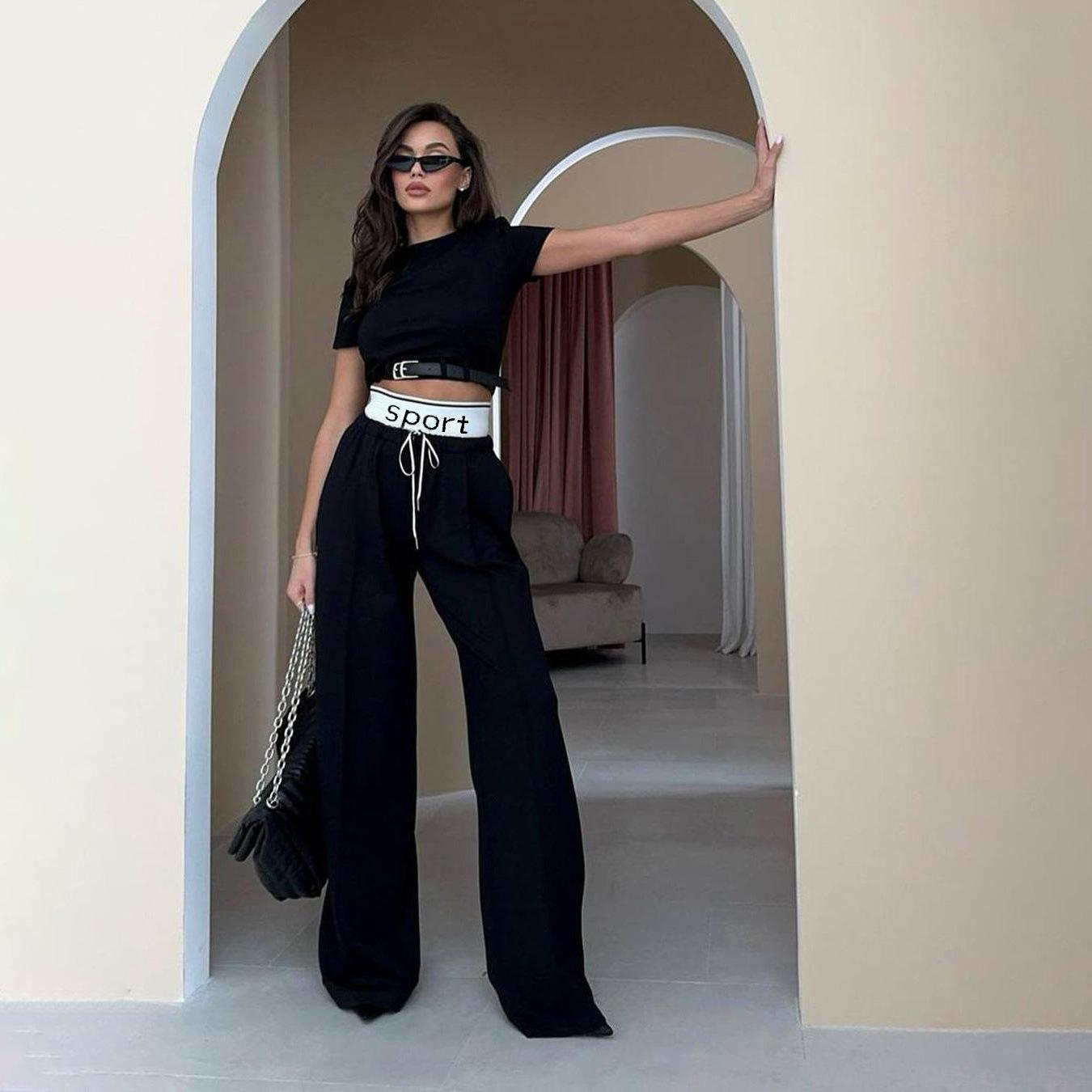 Nombre: Conjunto Europeo y Americano Ropa de Mujer de Alta Gama Primavera Top Corto de Manga Corta Camiseta Cintura Alta Pierna Recta Holgado Adelgazante Pantalón Largo Mujer