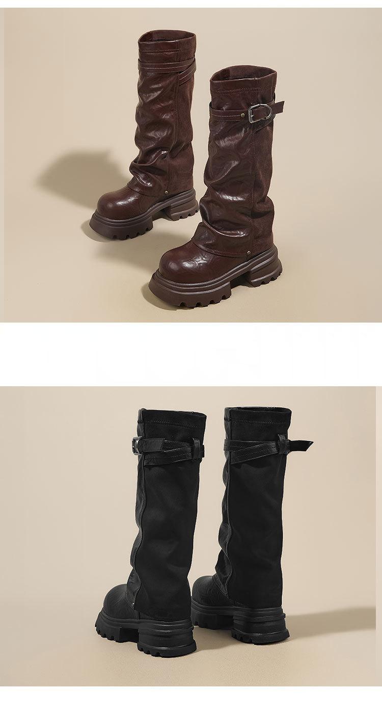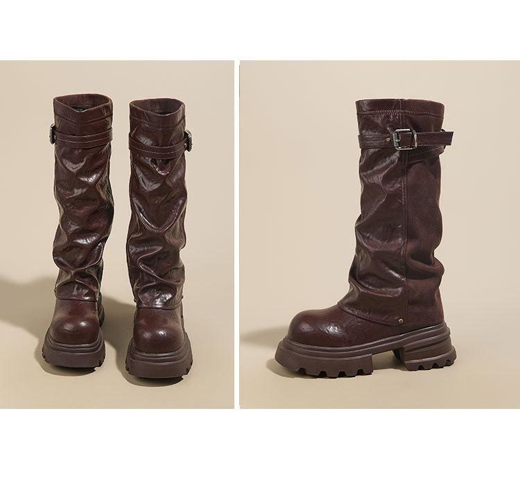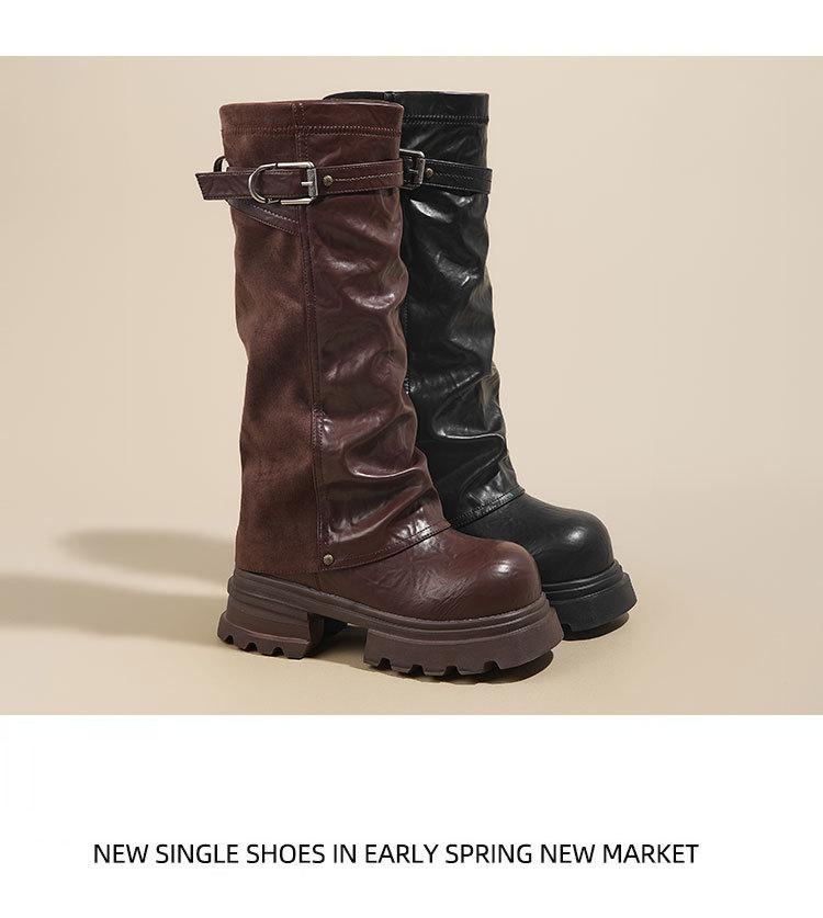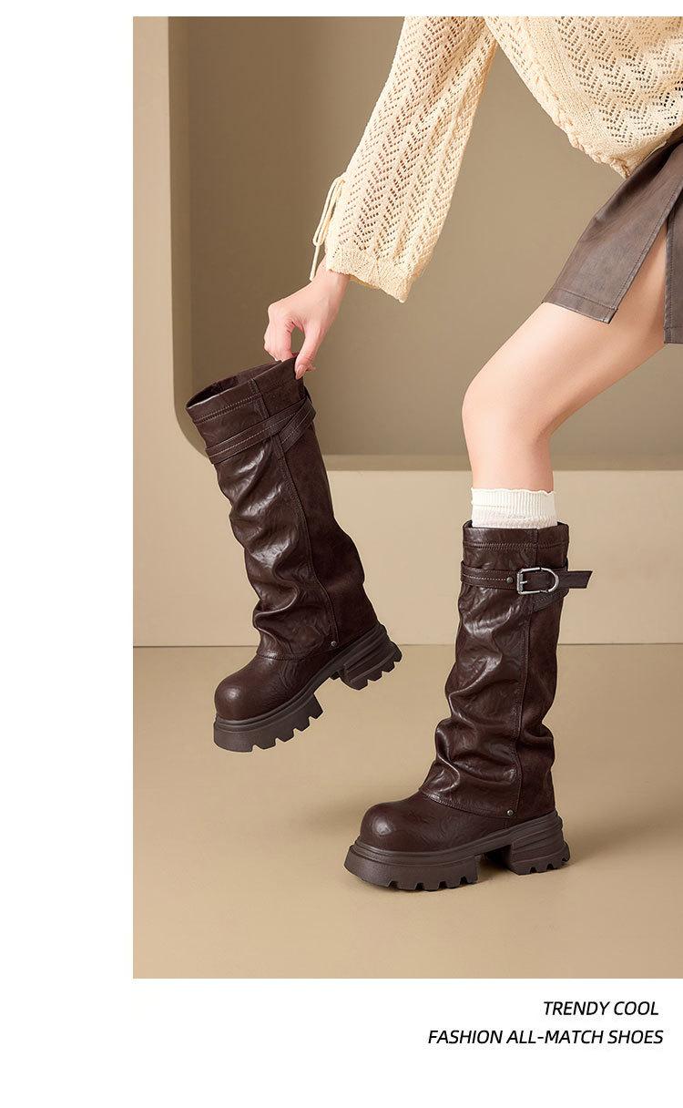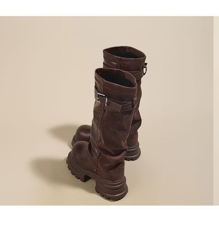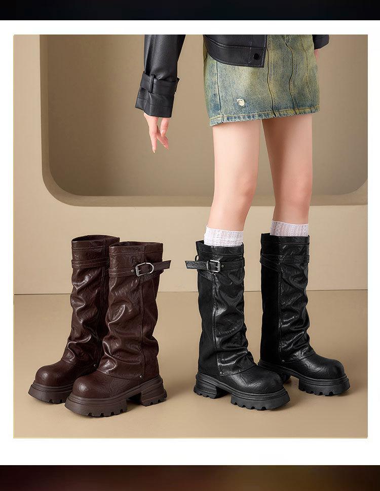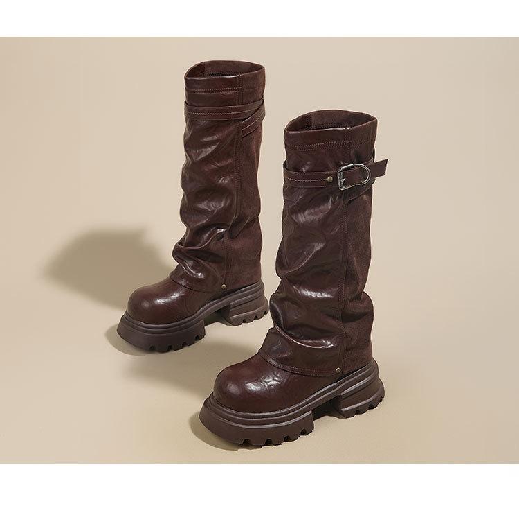 Botas Western de Hebilla de Cinturón de Suela Gruesa para Mujer 2025 Nuevas Botas Versátiles por Encima de la Rodilla Botas Arrugadas Caídas Botas de Caña Media
