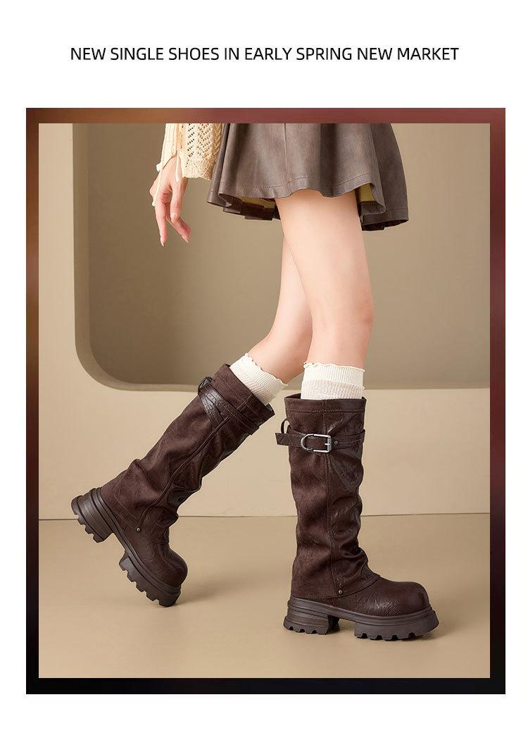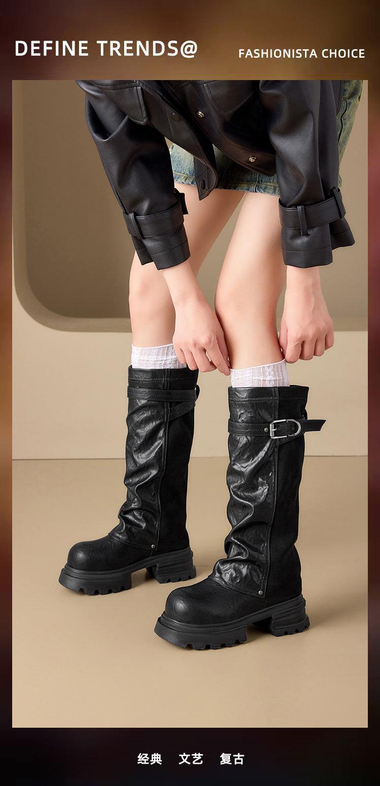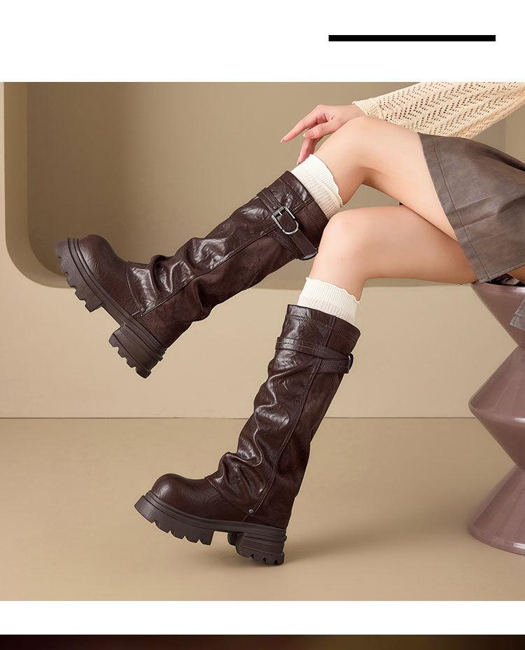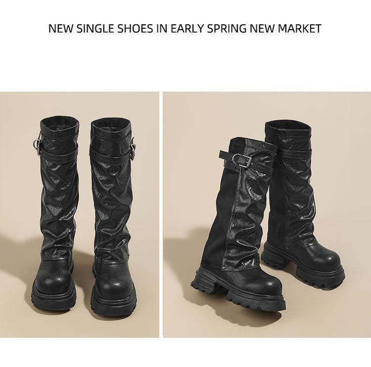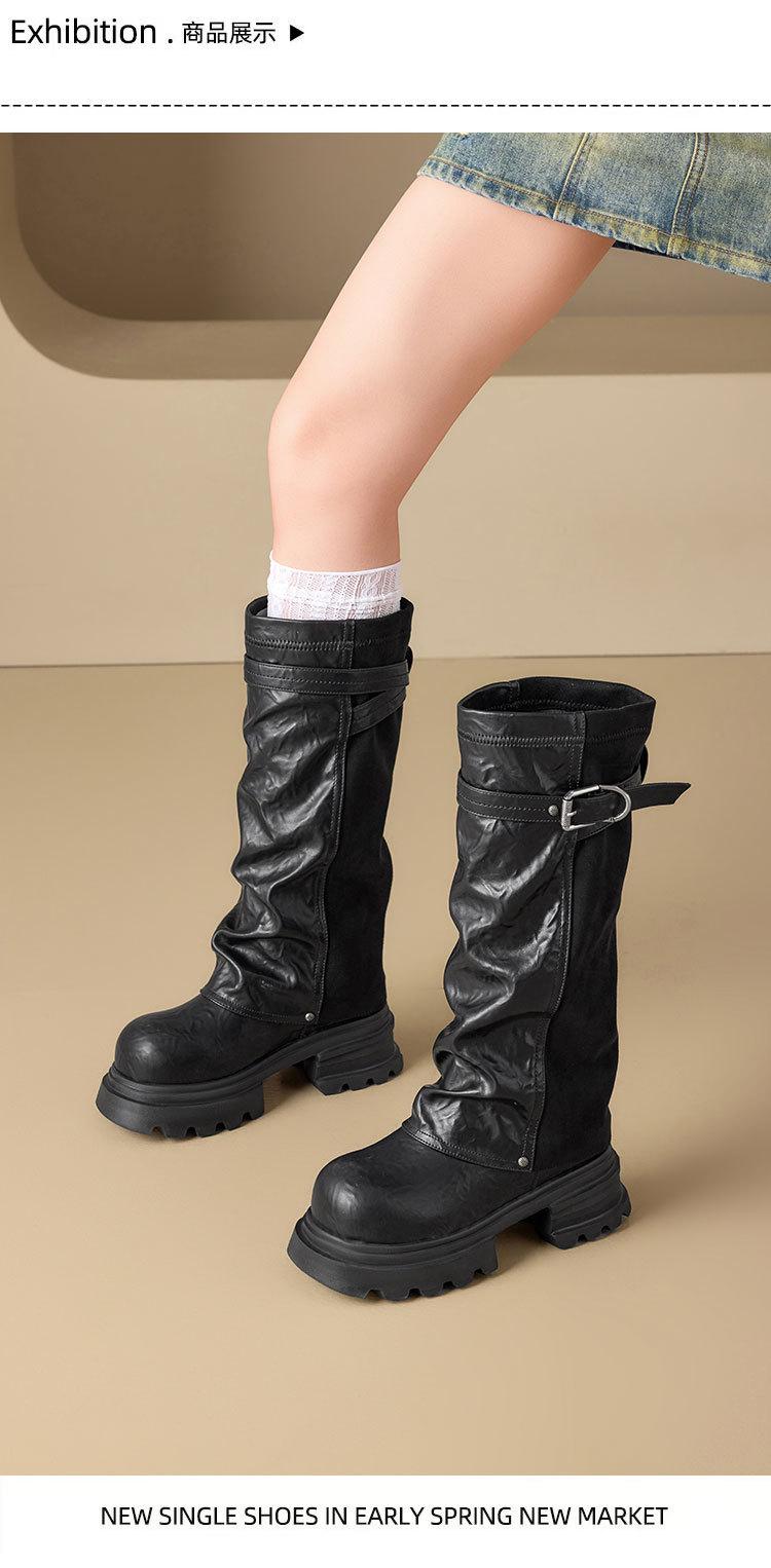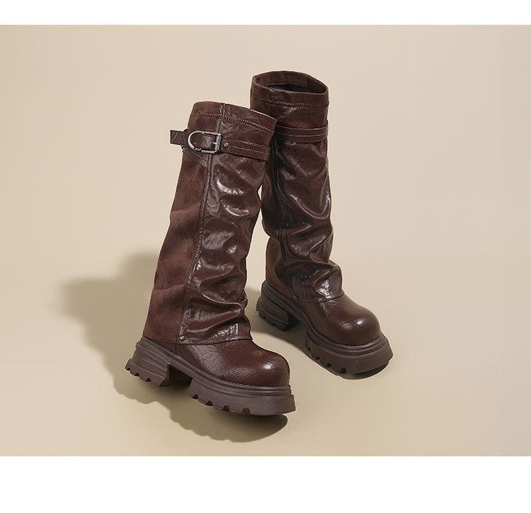 Botas Western de Hebilla de Cinturón de Suela Gruesa para Mujer 2025 Nuevas Botas Versátiles por Encima de la Rodilla Botas Arrugadas Caídas Botas de Caña Media