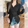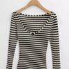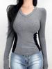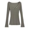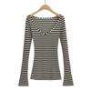 Estilo Otoño 2025 Puro y Sexy Chica Hot Cuello en V Profundo Abotonada Manga Larga Camiseta Mujer Figura de Papel Rayada Manga Larga Top Adelgazante