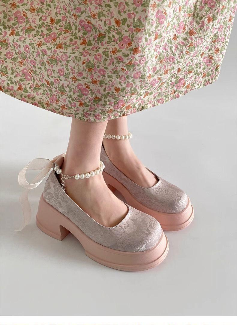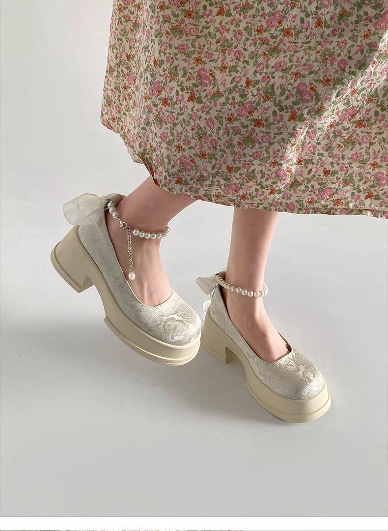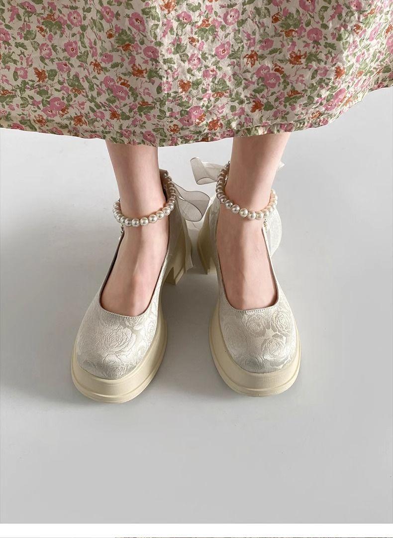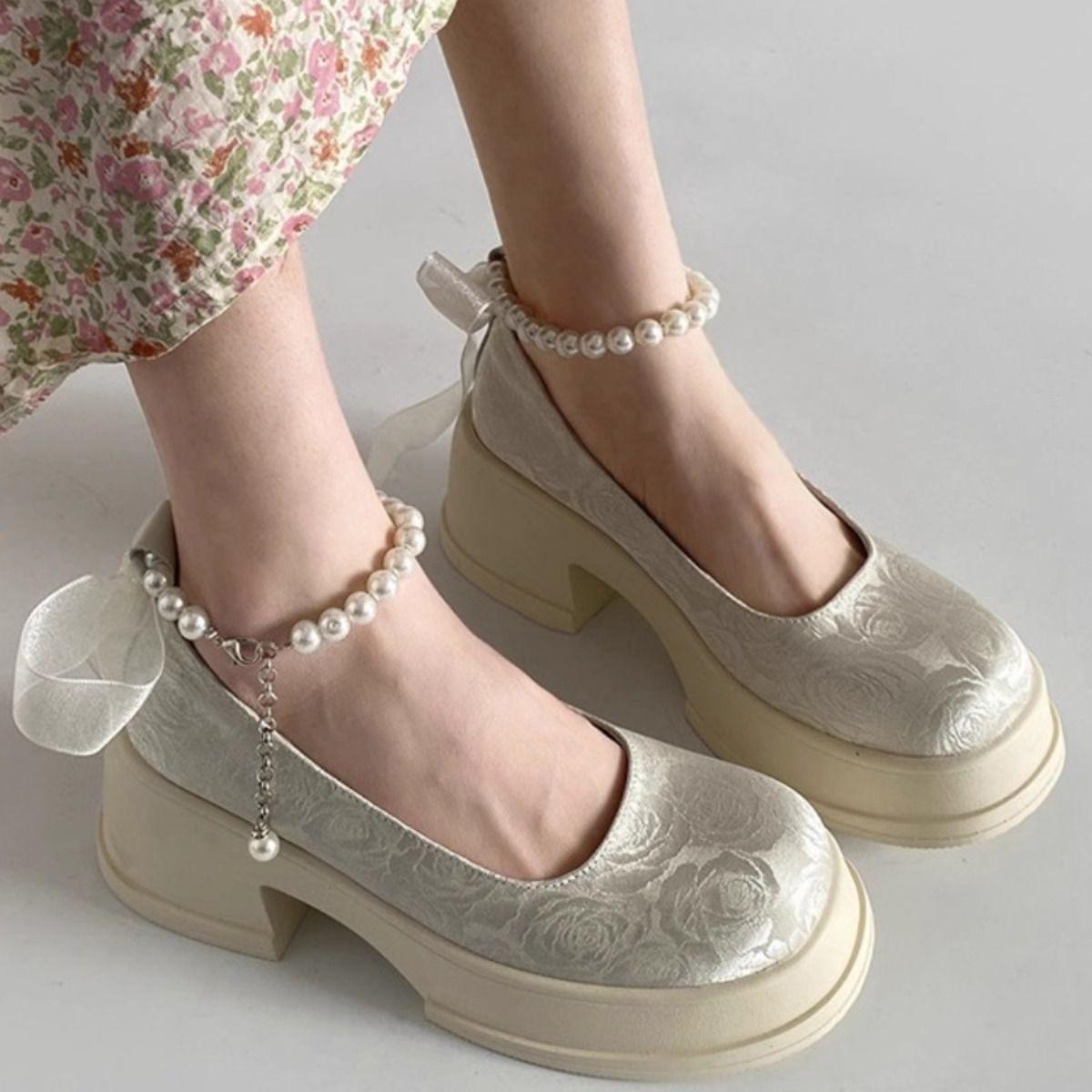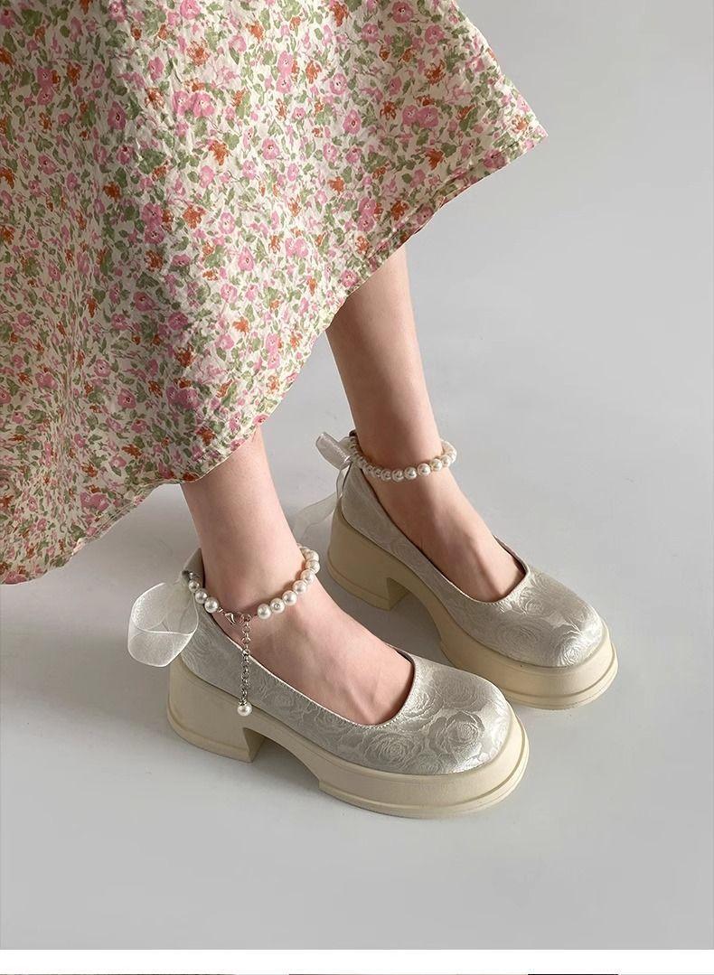 Zapatos de Salón Mary Jane de Perlas Escotados para Mujer Versátiles Retro Franceses 2024 Nuevo Estampado Mocasines de Plataforma Gruesa para Mujer