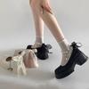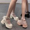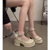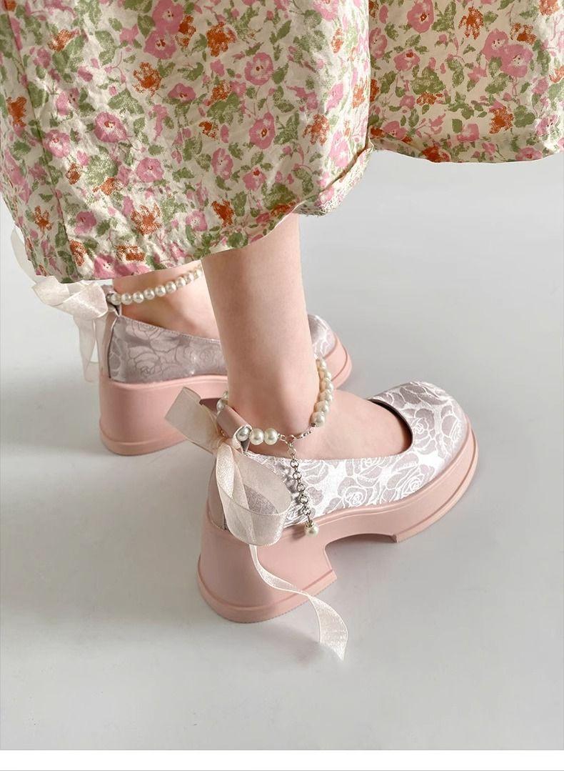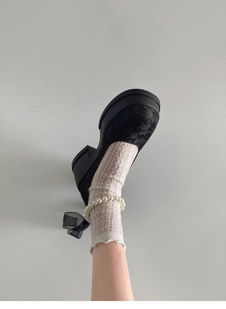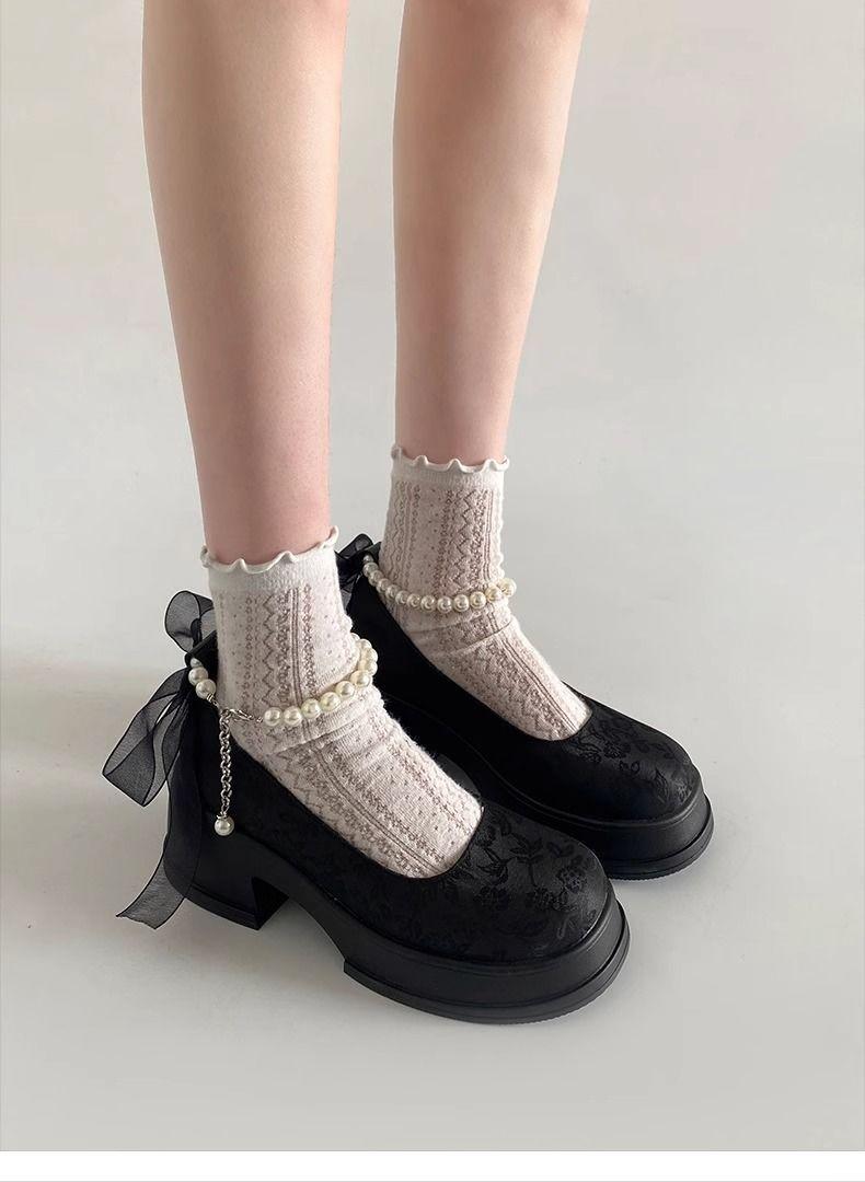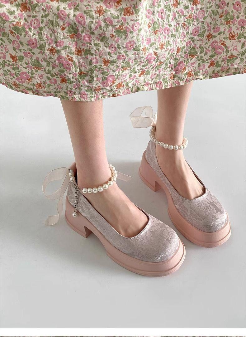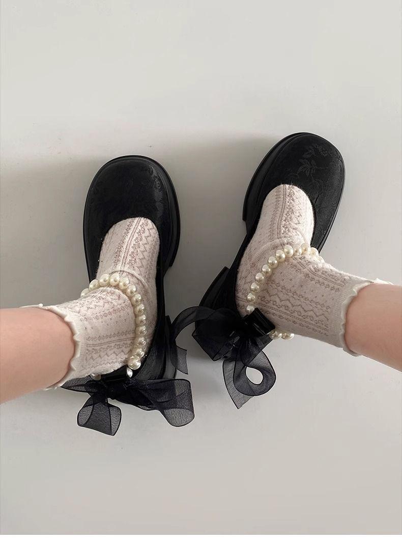 Zapatos de Salón Mary Jane de Perlas Escotados para Mujer Versátiles Retro Franceses 2024 Nuevo Estampado Mocasines de Plataforma Gruesa para Mujer