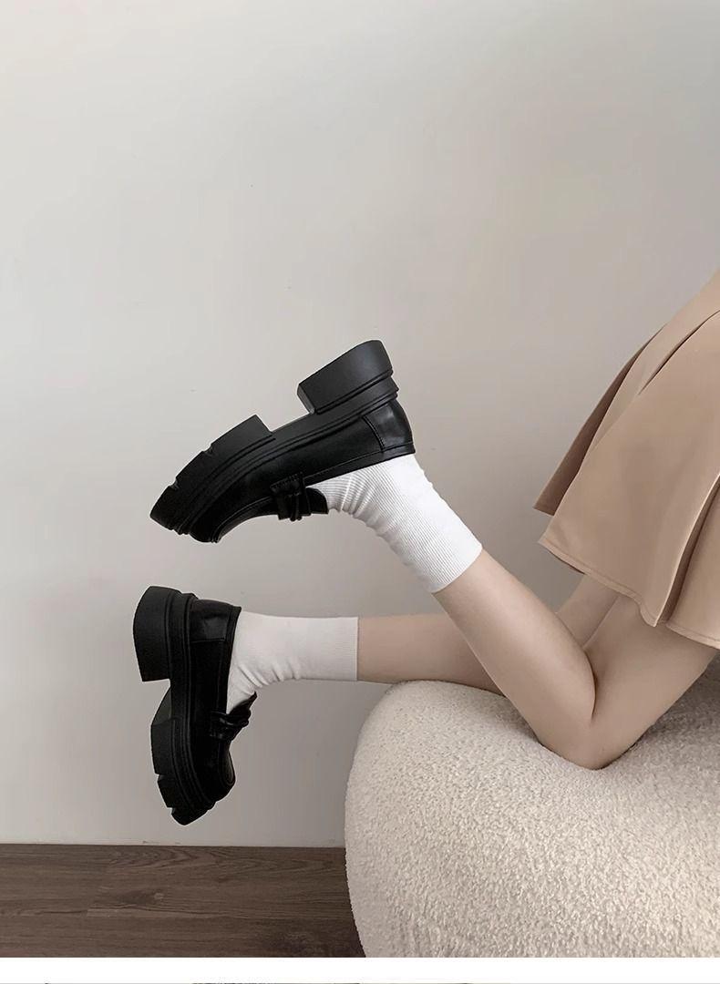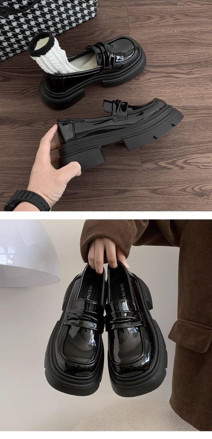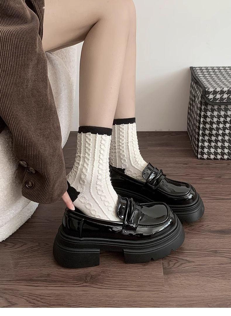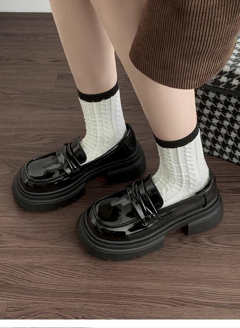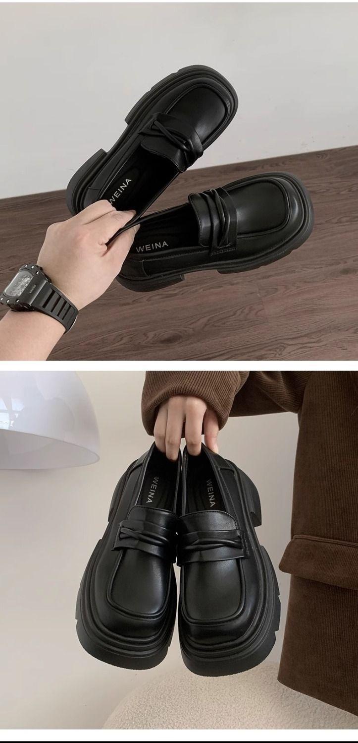 Zapatos nuevos individuales de suela gruesa estilo universitario zapatos de cuero pequeños zapatos de mujer tacón grueso 2023 mocasines de otoño e invierno zapatos de mujer sin cordones negros