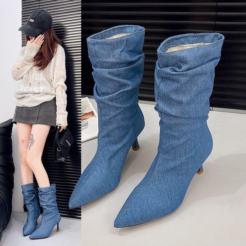 Botas de Tacón de Aguja Apiladas Versátiles y Cómodas a la Moda Mujer 2025 Otoño/Invierno Nuevo Punta Afilada Media Pantorrilla Fruncidas Botas Martin Mujer