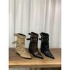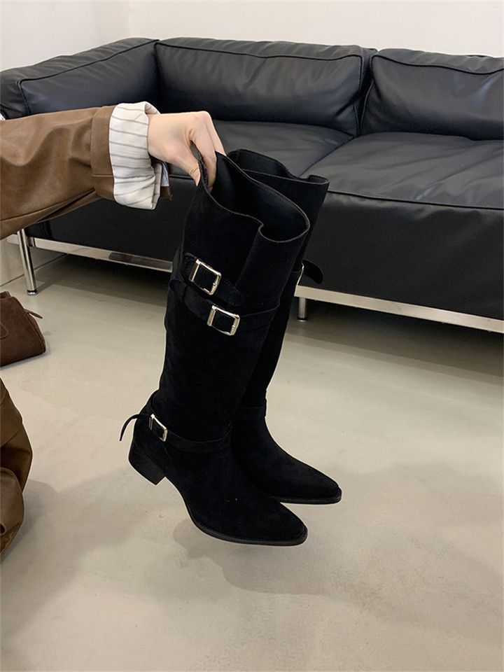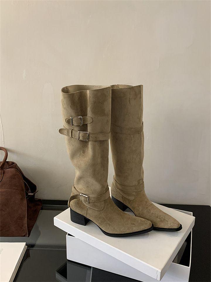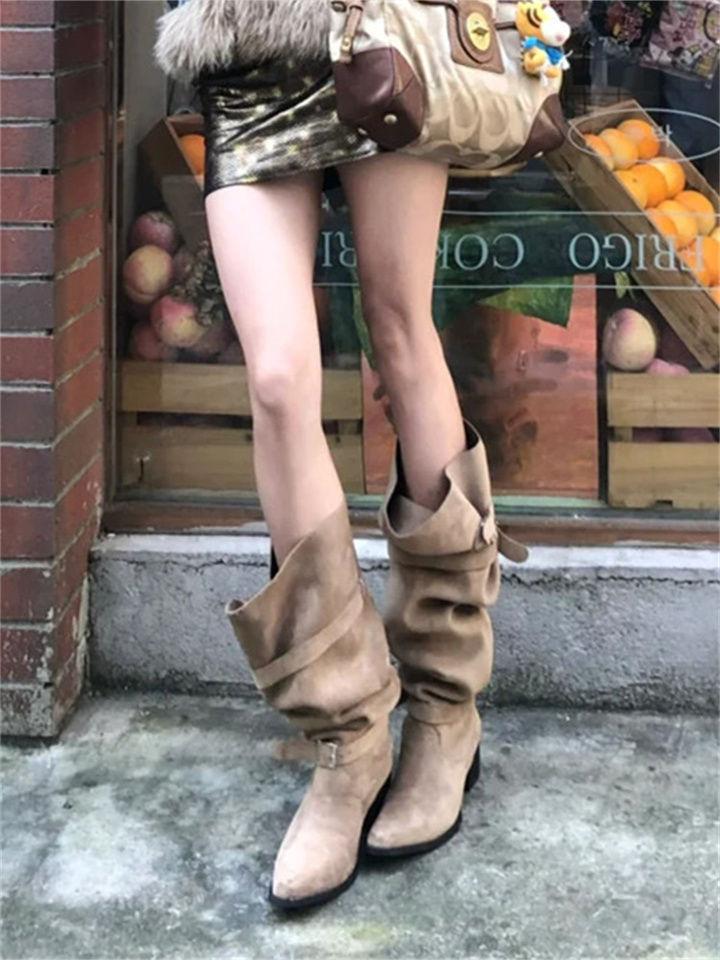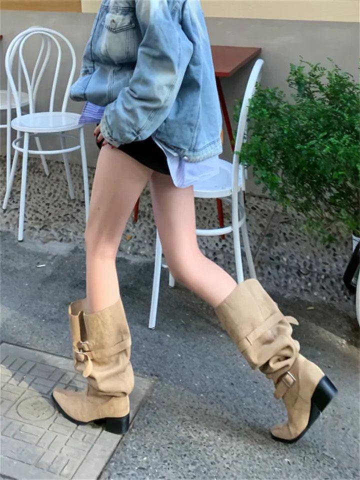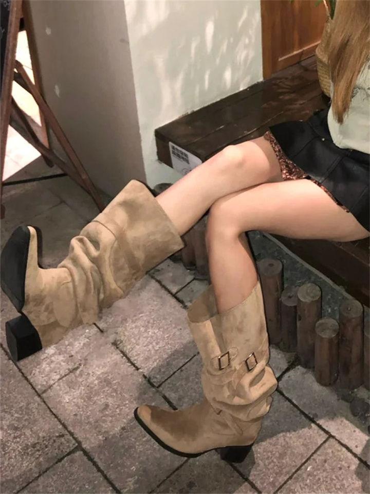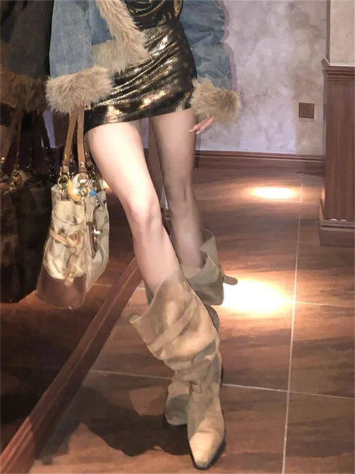 Botas hasta la rodilla de tacón grueso y punta puntiaguda para chica picante Mujer 2025 Primavera/Verano Nuevo estilo Botas apiladas Caña ancha Adelgazantes Botas vaqueras occidentales