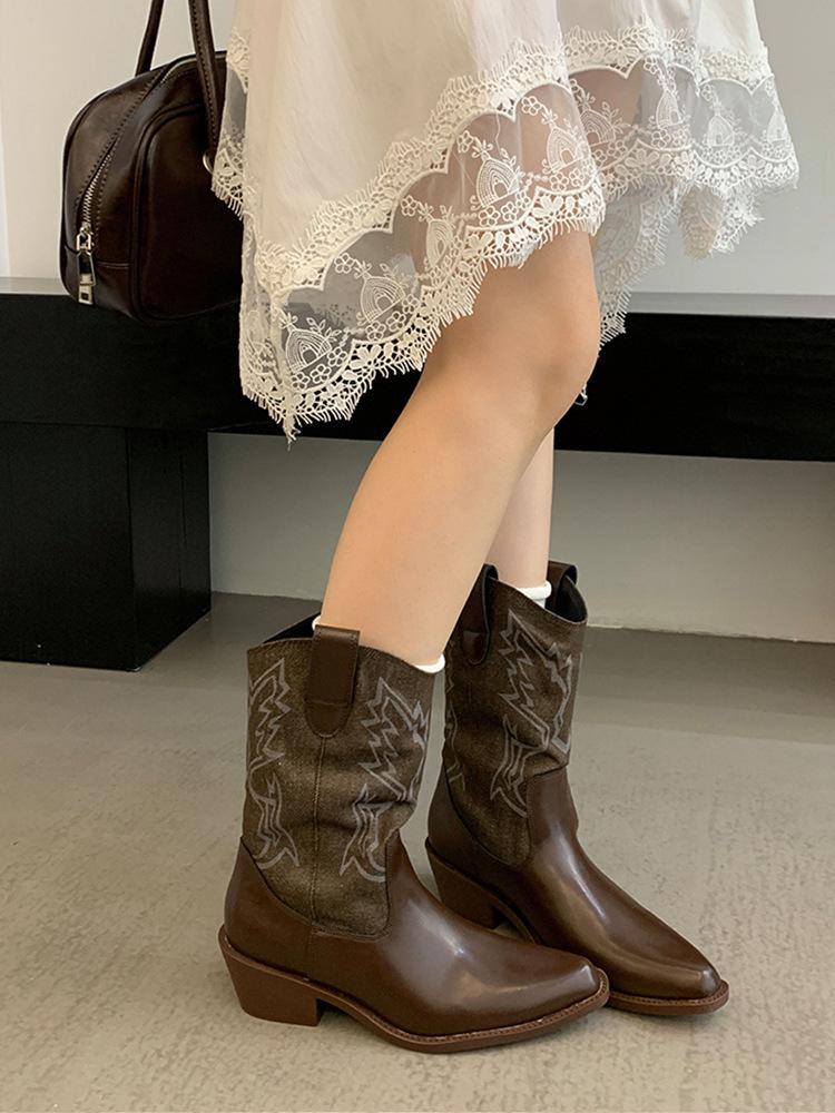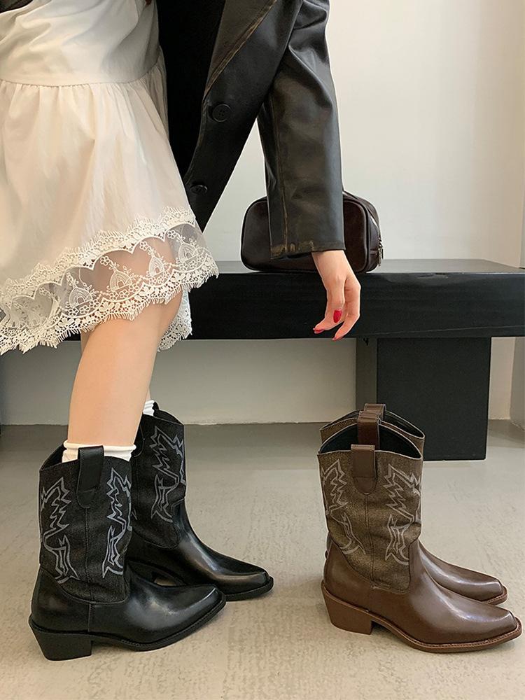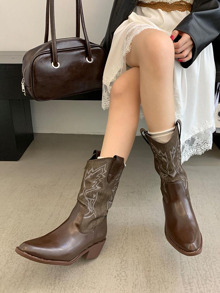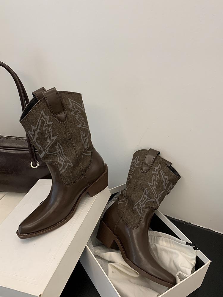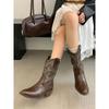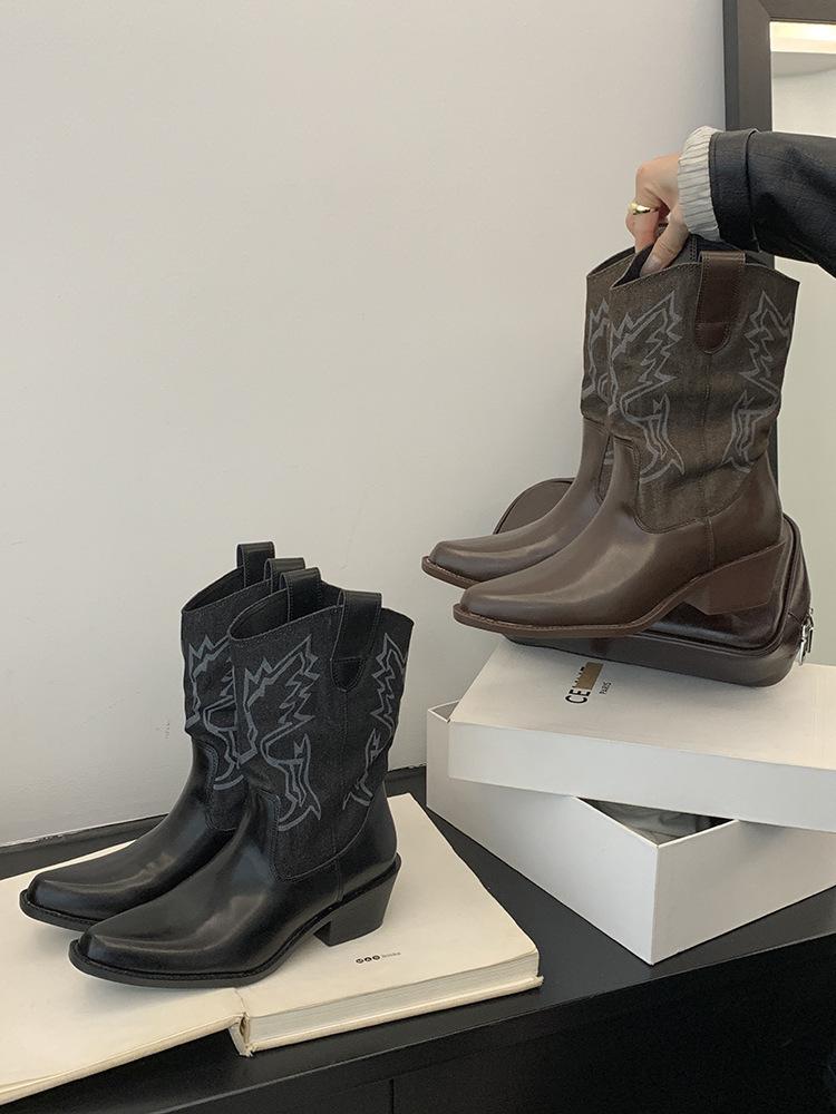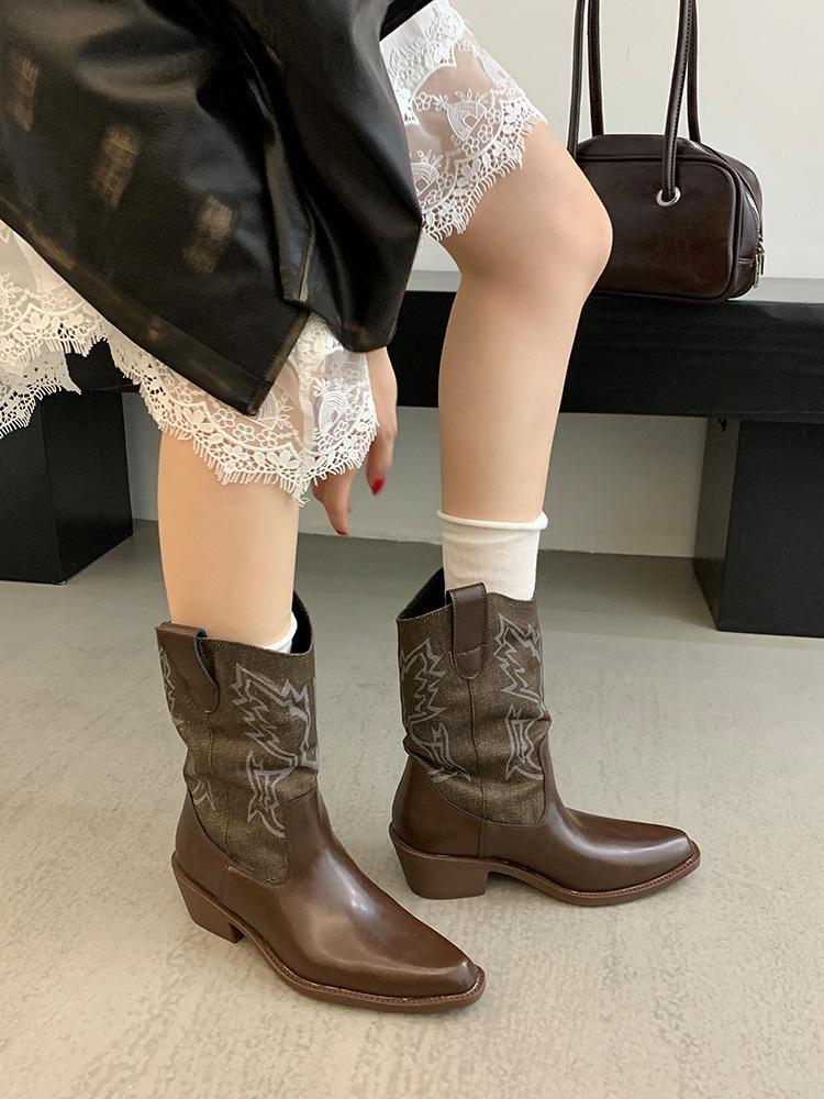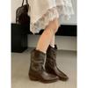 Botines de Mujer 2025 Otoño/Invierno Nuevas Botas de Mujer Tacón Alto Media Caña Botas de Tacón Grueso Vaqueras Occidentales Botas Marrones de Caballero