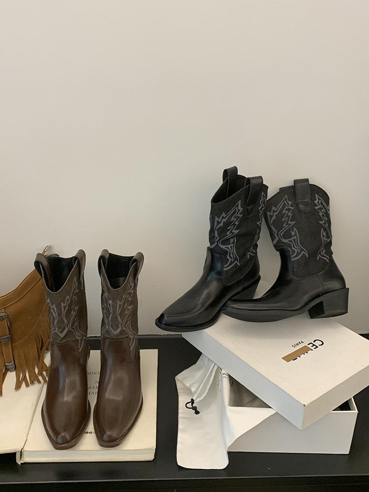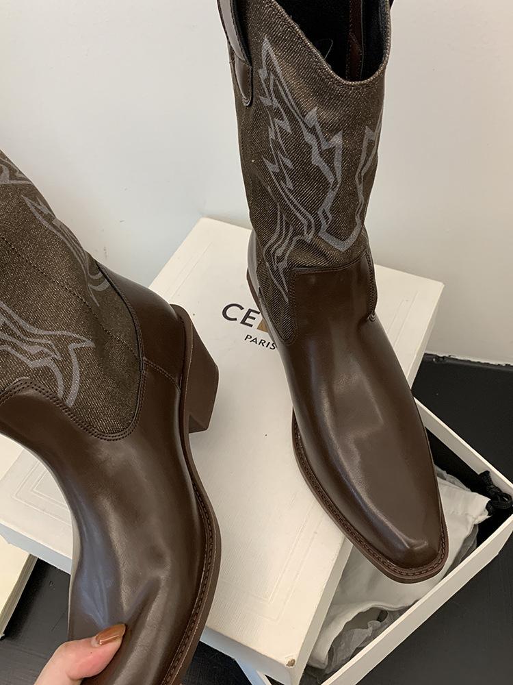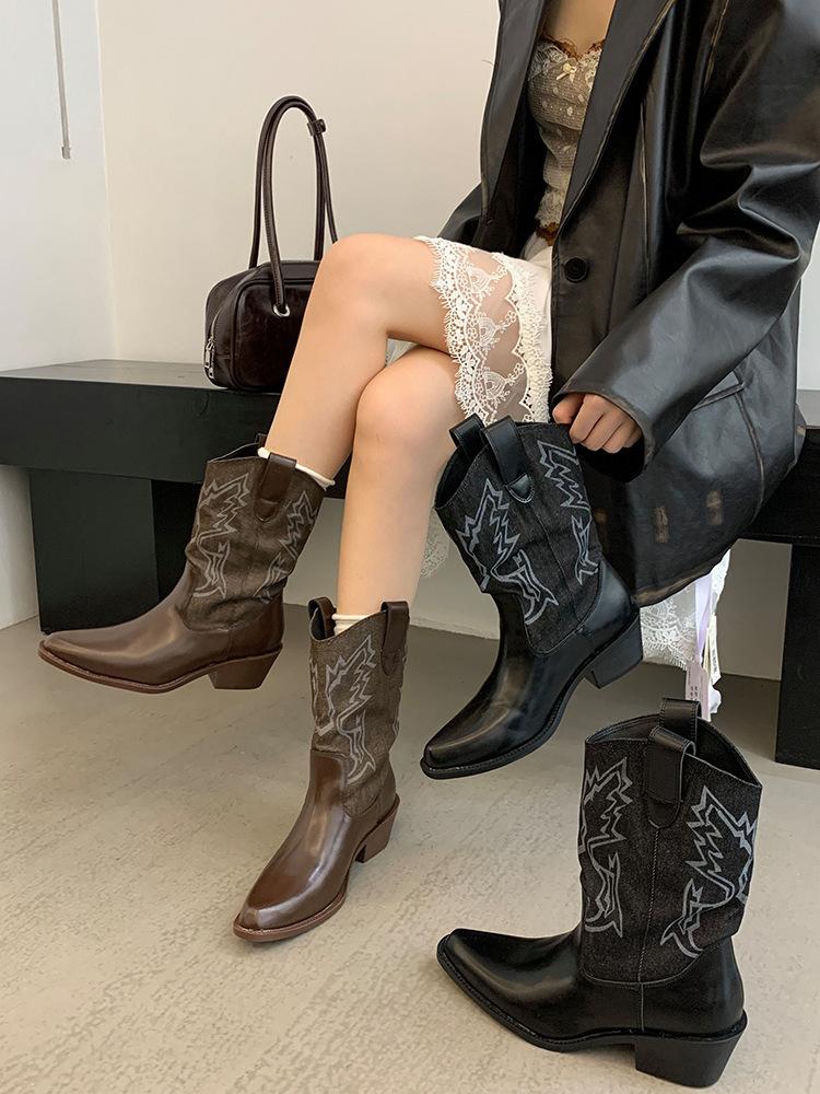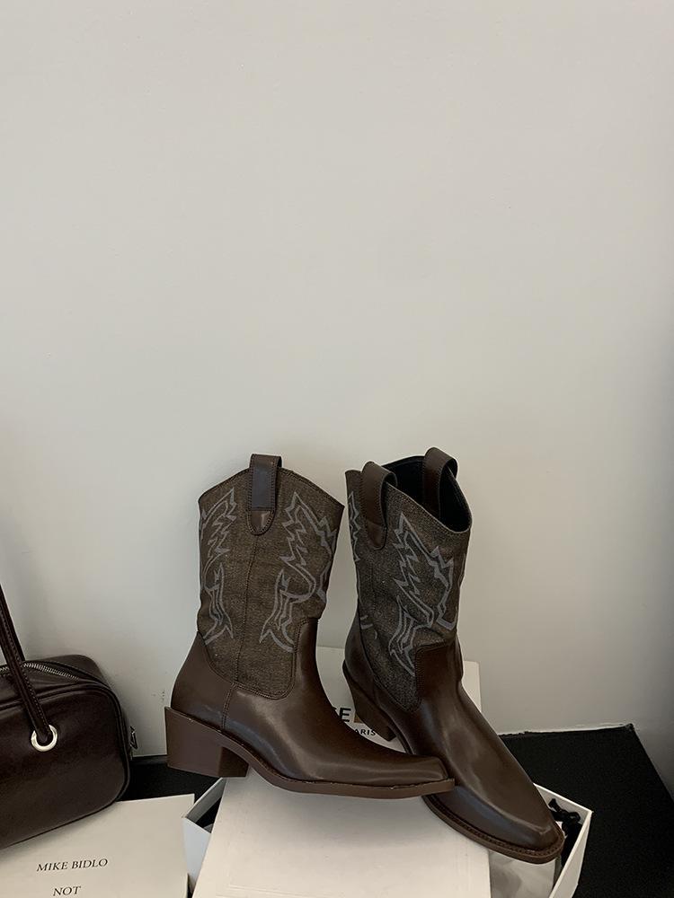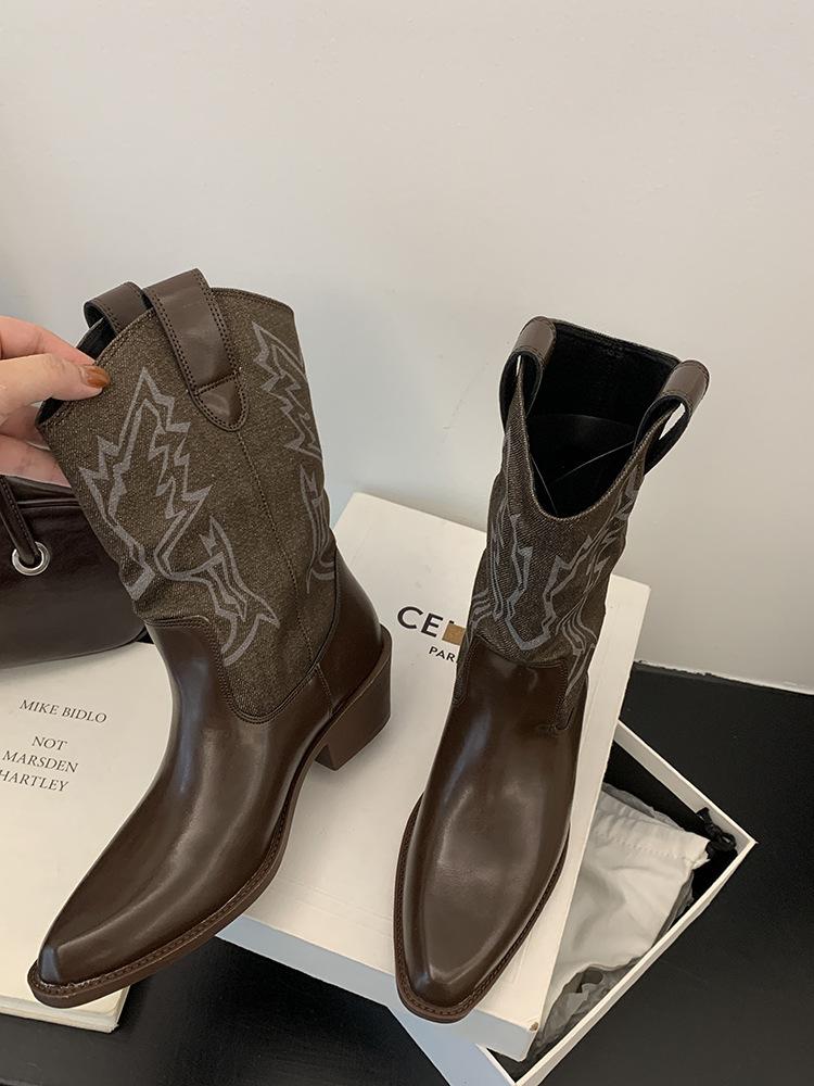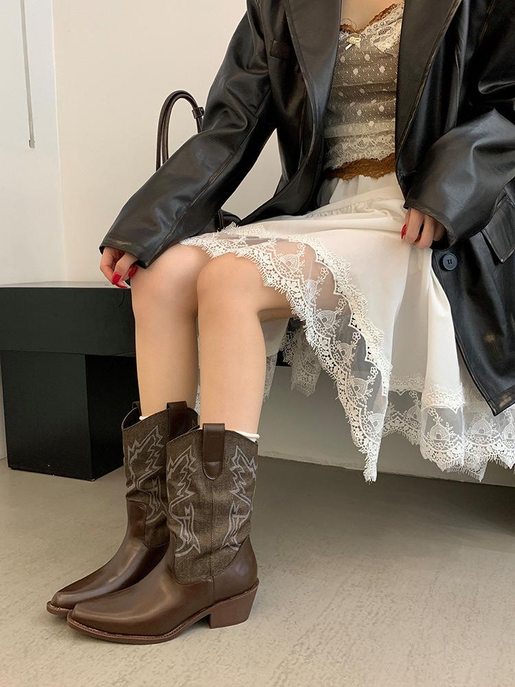 Botines de Mujer 2025 Otoño/Invierno Nuevas Botas de Mujer Tacón Alto Media Caña Botas de Tacón Grueso Vaqueras Occidentales Botas Marrones de Caballero