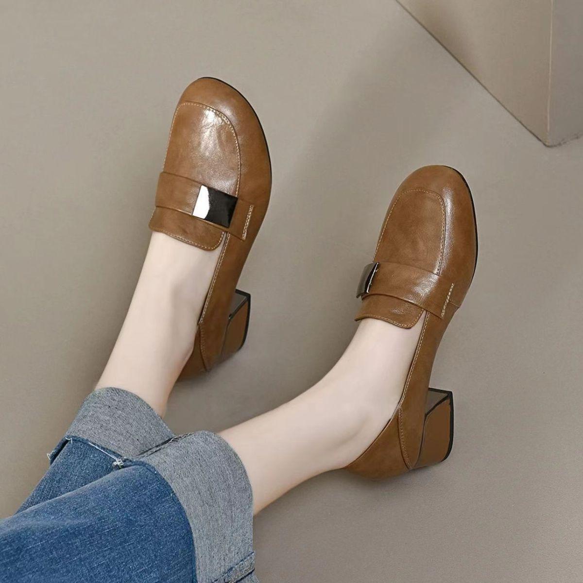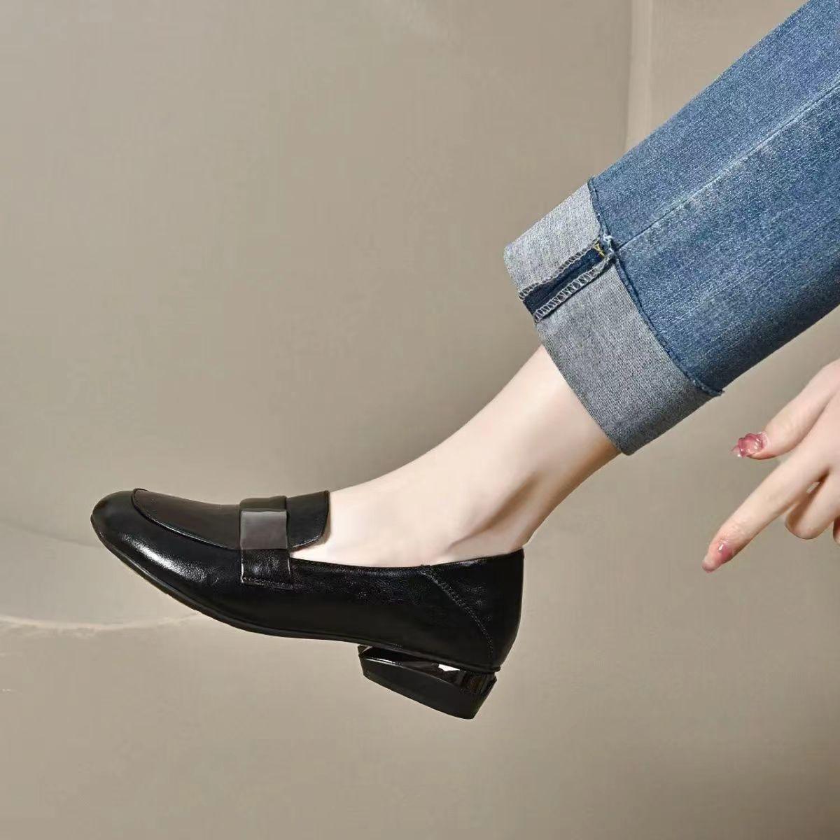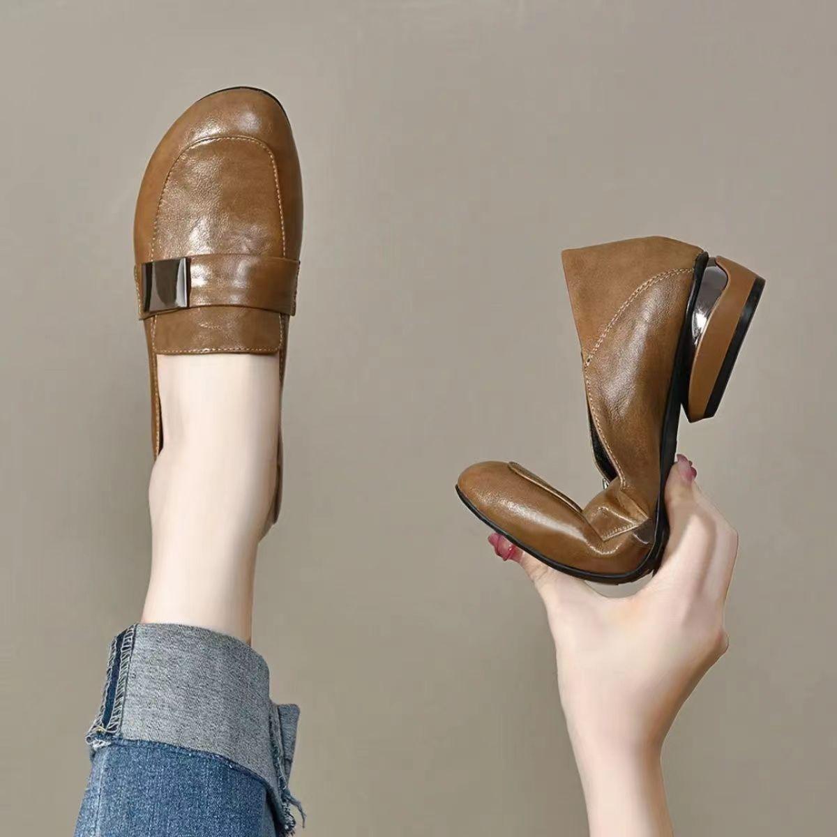 Mocasines de Punta Redonda Zapatos de Mujer Flats 2025 Primavera y Otoño Nuevos Suela Suave Tacón Bajo Zapatos de Cuero Estilo Británico Cuero Suave Flats de Mamá para Mujer