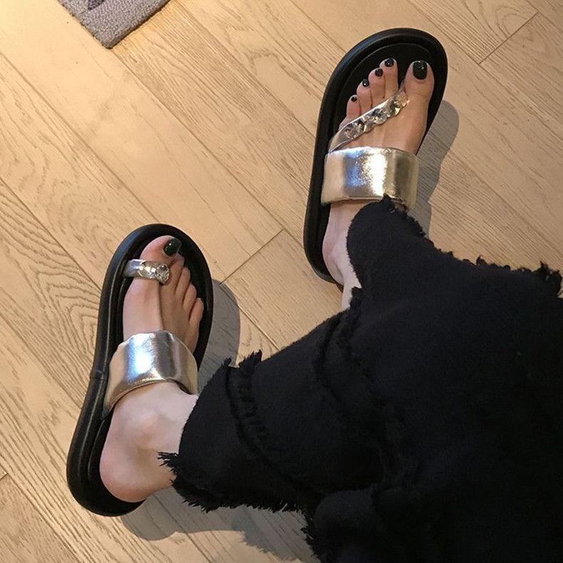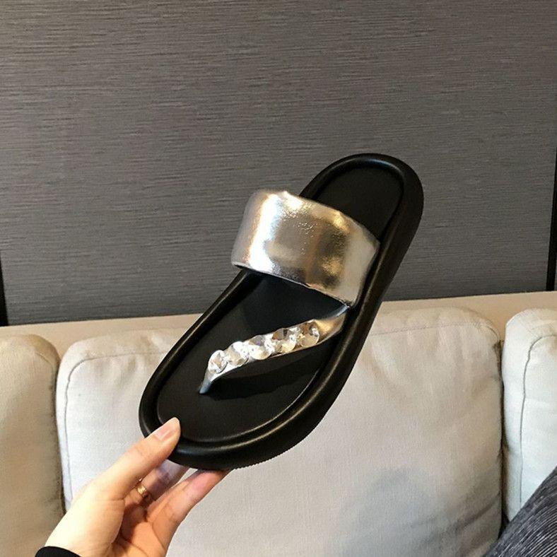 Pantuflas de Pedrería Mujer 2025 Verano Nuevo Estilo Hada Francés Suela Gruesa Antideslizante Una Tira Vacaciones de Playa Sandalias de Dedo