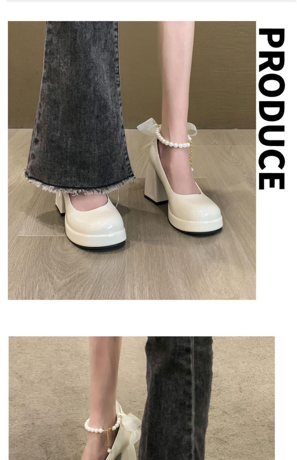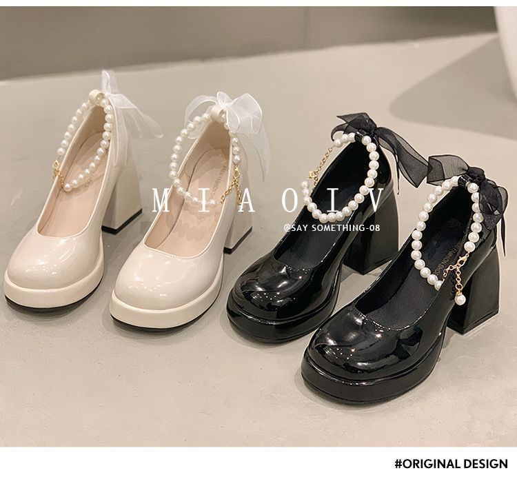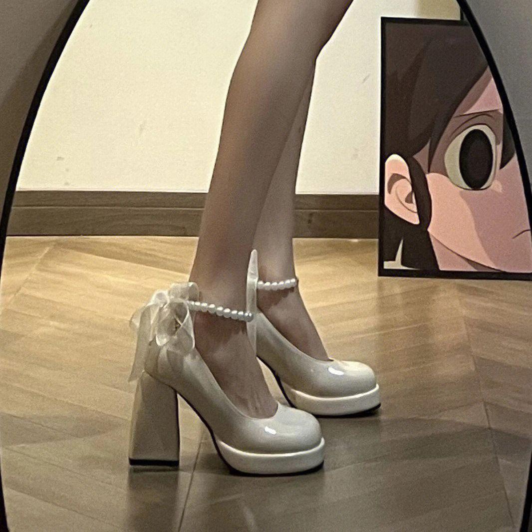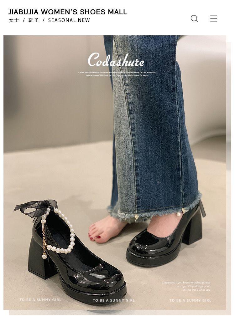 Zapatos Retro Pequeños de Cuero 2023 Mary Jane Tacones Altos Negro Niñas Primavera y Otoño Perla Tacón Grueso Lazo Blanco Nuevo