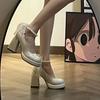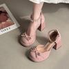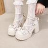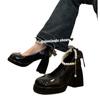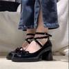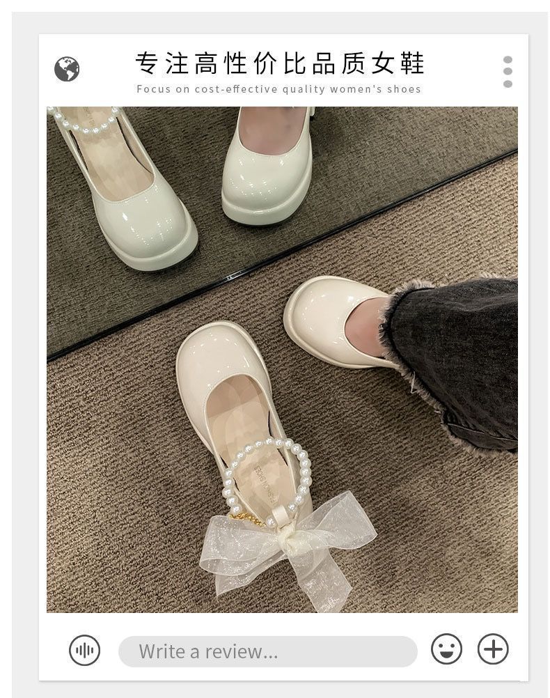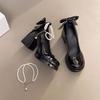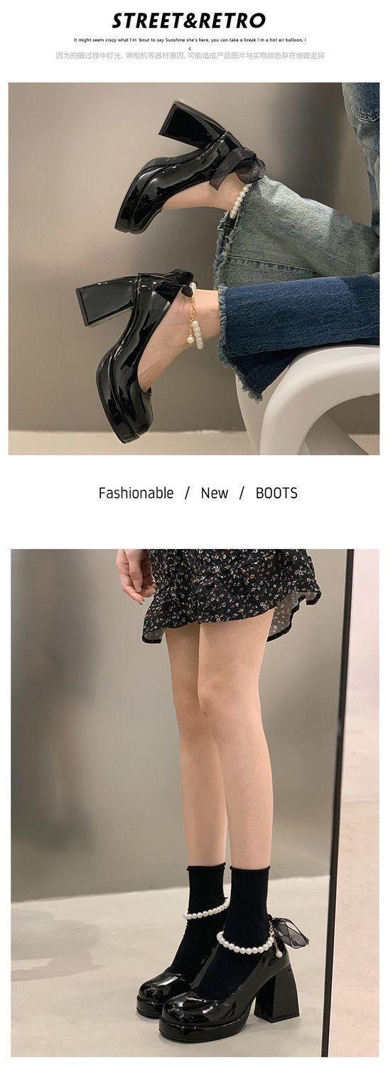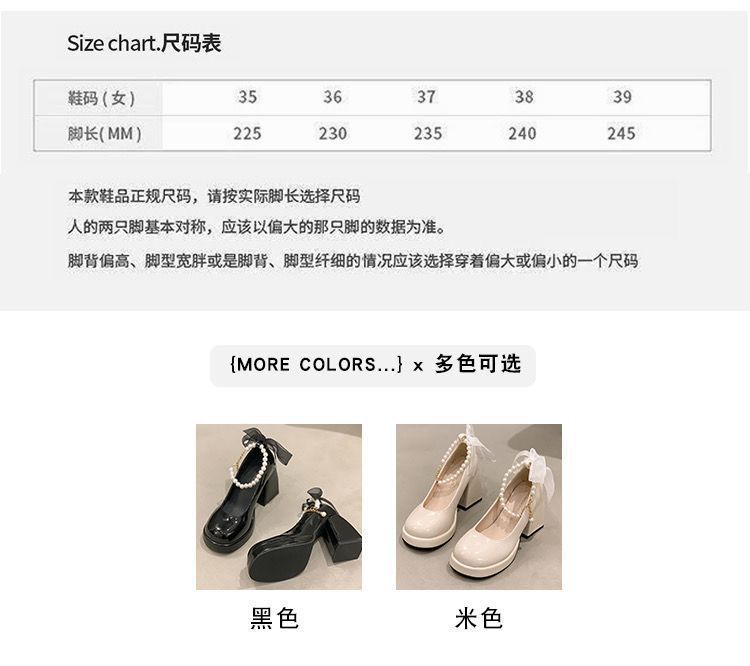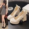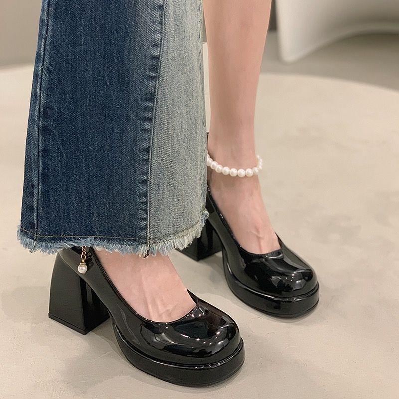 Zapatos Retro Pequeños de Cuero 2023 Mary Jane Tacones Altos Negro Niñas Primavera y Otoño Perla Tacón Grueso Lazo Blanco Nuevo