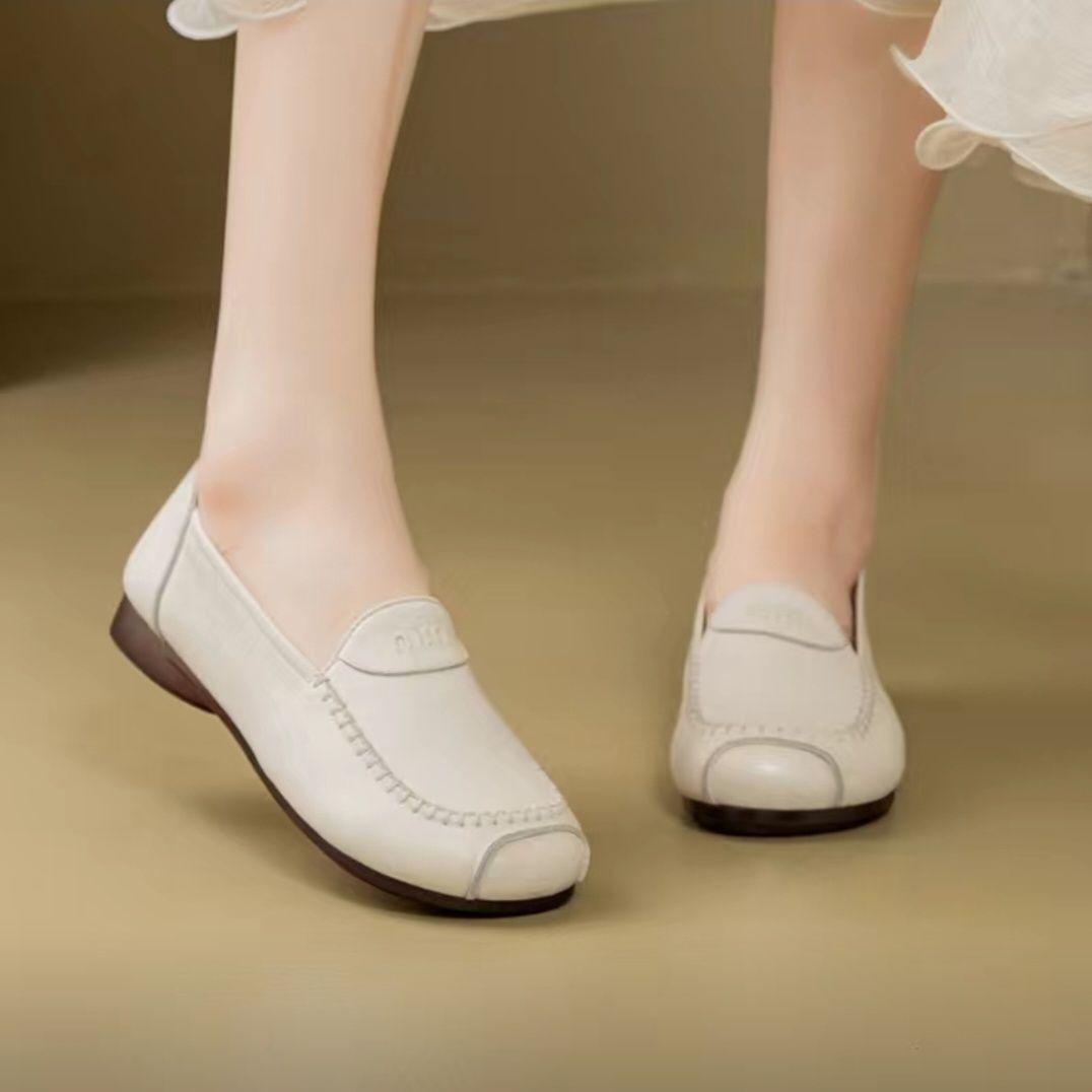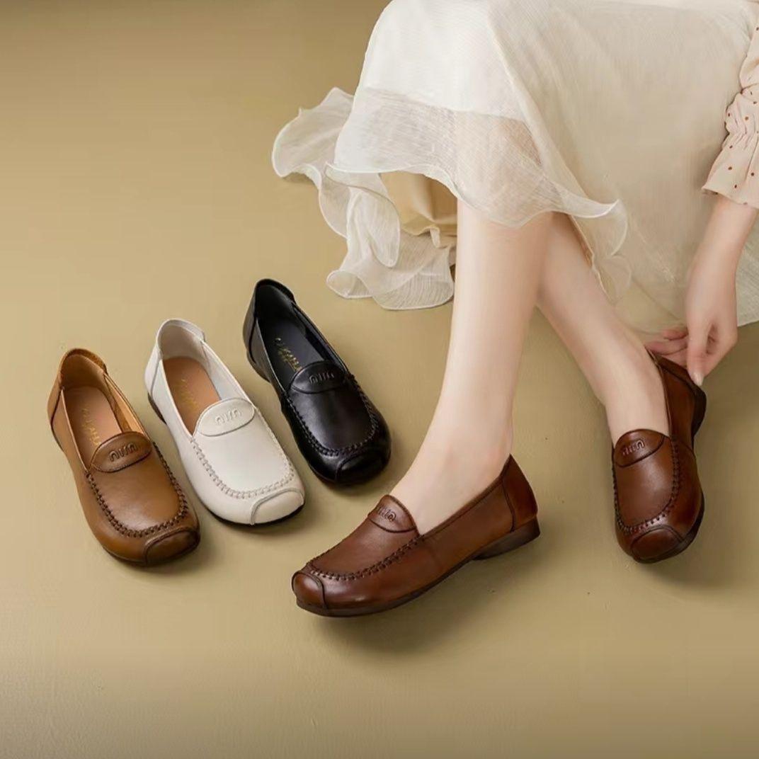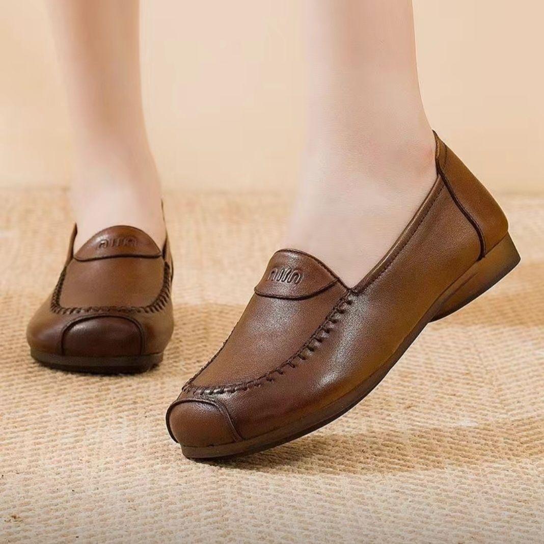2025 Otoño Nuevo Estilo Mamá Tendón Cuero Suave Suela Suave Corte Bajo Zapatos Individuales Zapatos de Cuero Cómodos Mediana Edad y Ancianos Zapatos de Mujer Slip-On