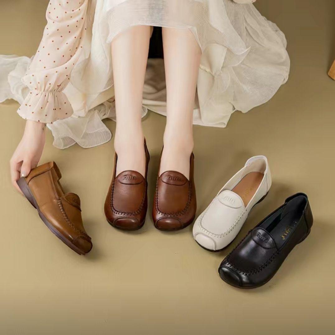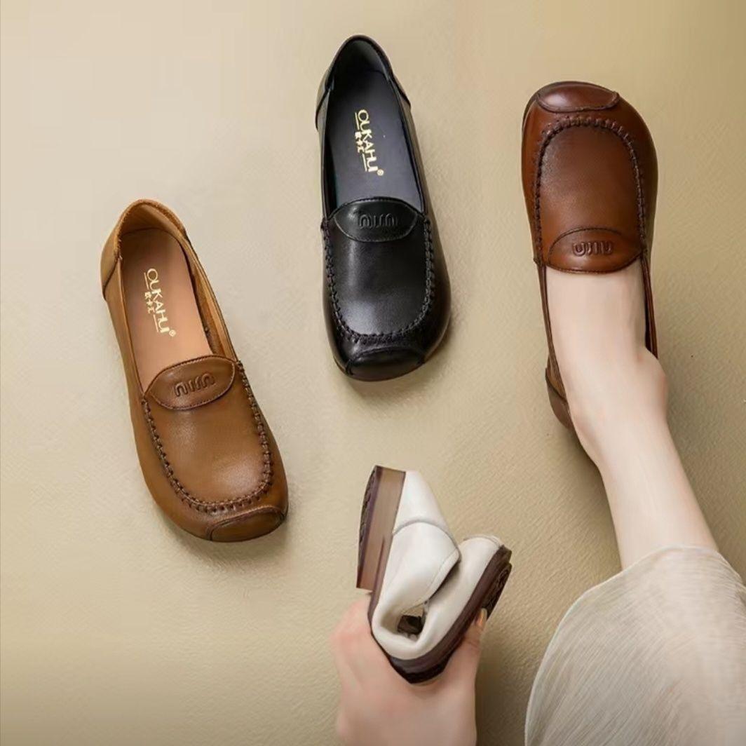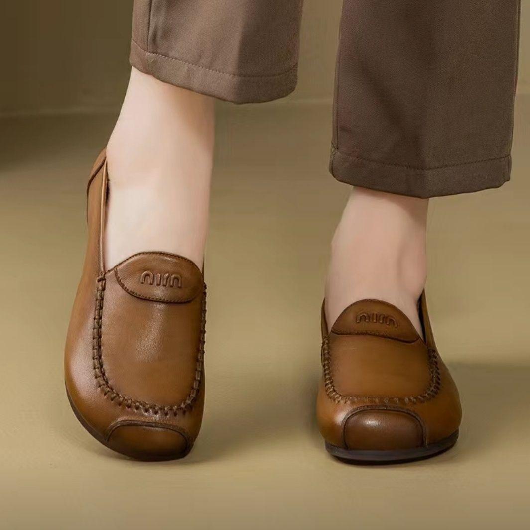 2025 Otoño Nuevo Estilo Mamá Tendón Cuero Suave Suela Suave Corte Bajo Zapatos Individuales Zapatos de Cuero Cómodos Mediana Edad y Ancianos Zapatos de Mujer Slip-On