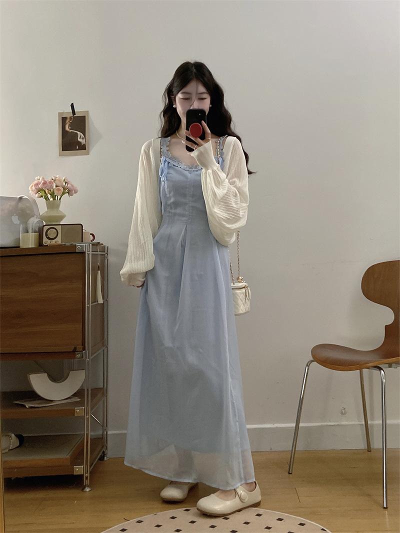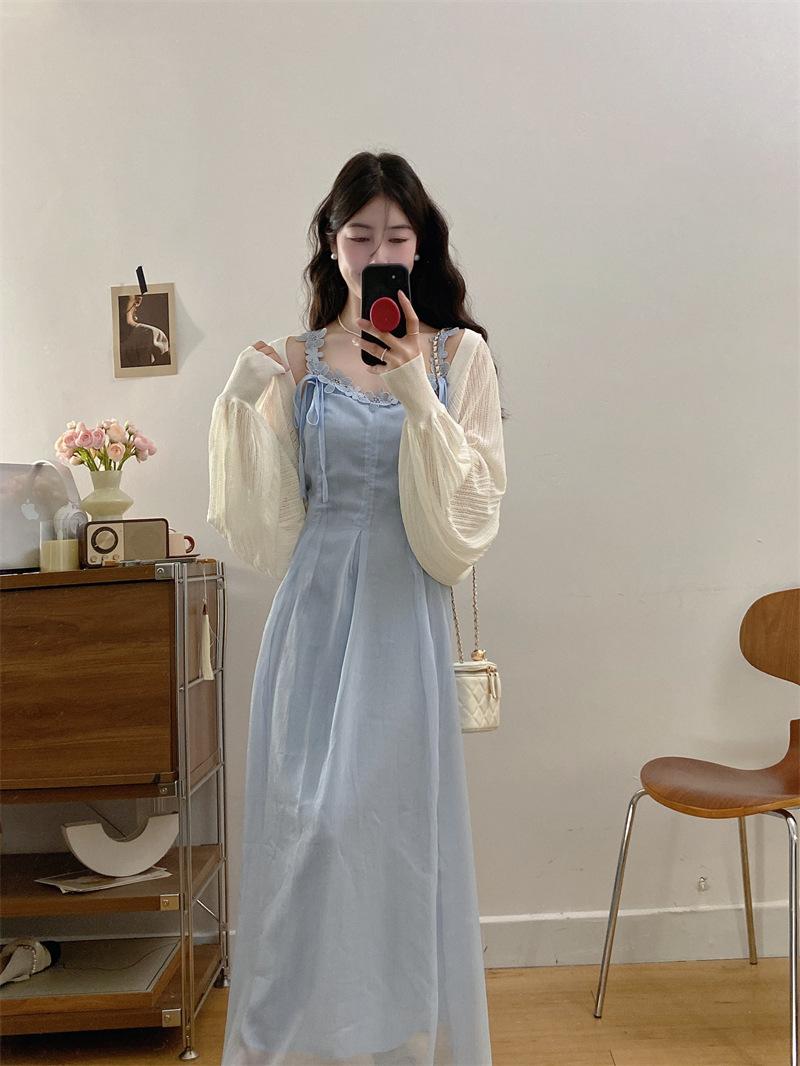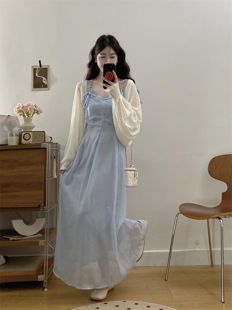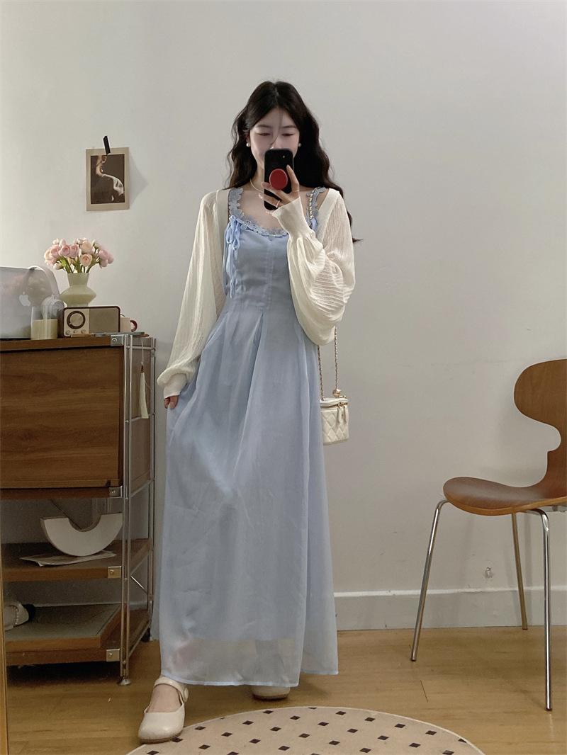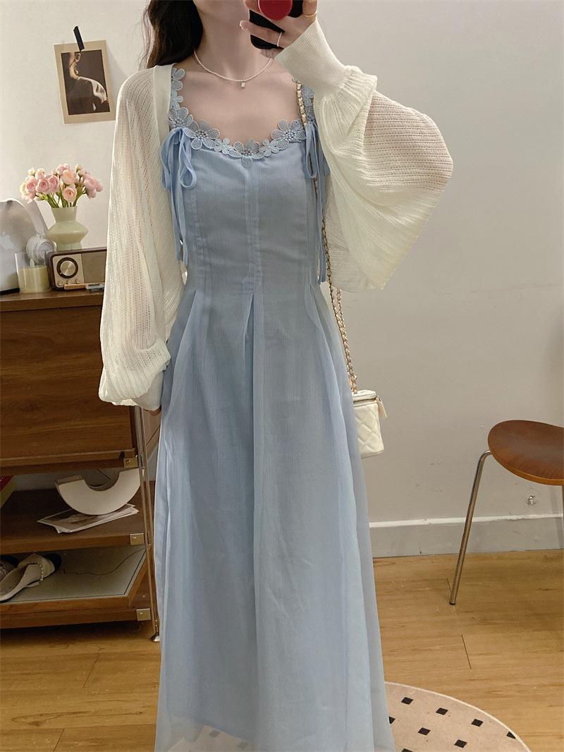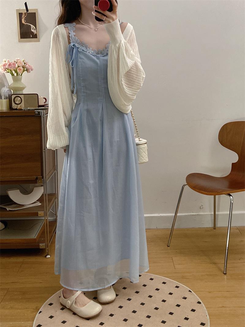 Vestido de tirantes adelgazante que cubre el vientre de cintura alta estilo coreano de primavera y verano, elegante conjunto largo de punto de dos piezas