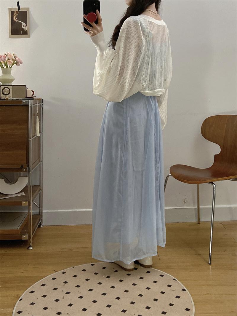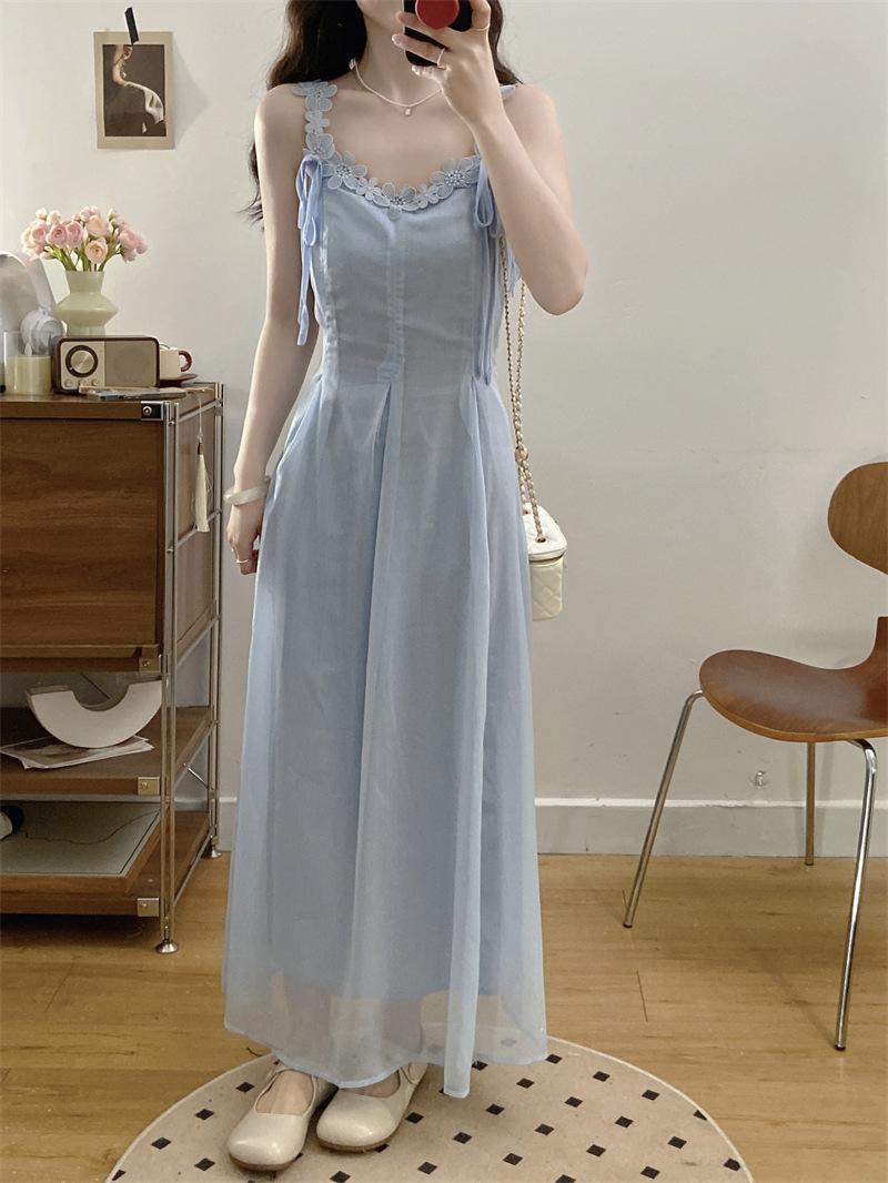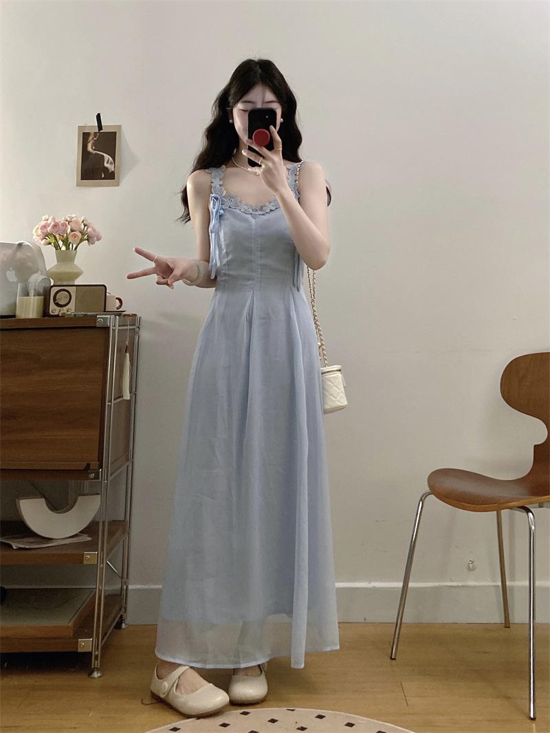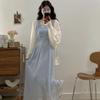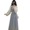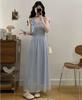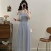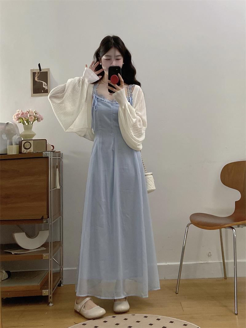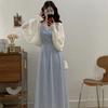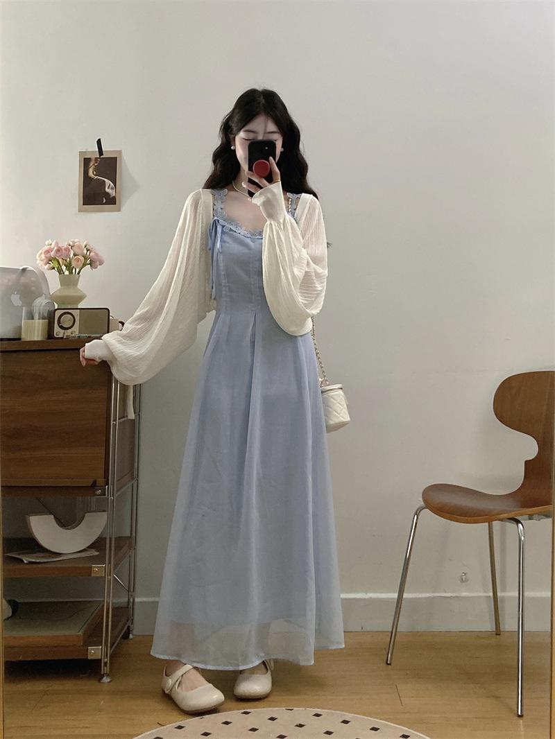Vestido de tirantes adelgazante que cubre el vientre de cintura alta estilo coreano de primavera y verano, elegante conjunto largo de punto de dos piezas