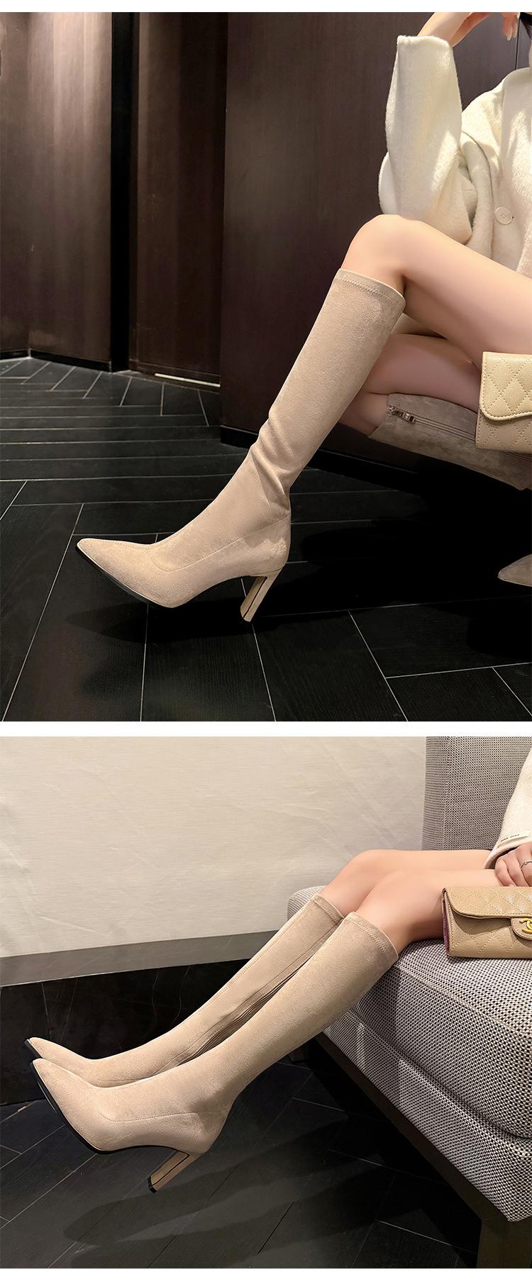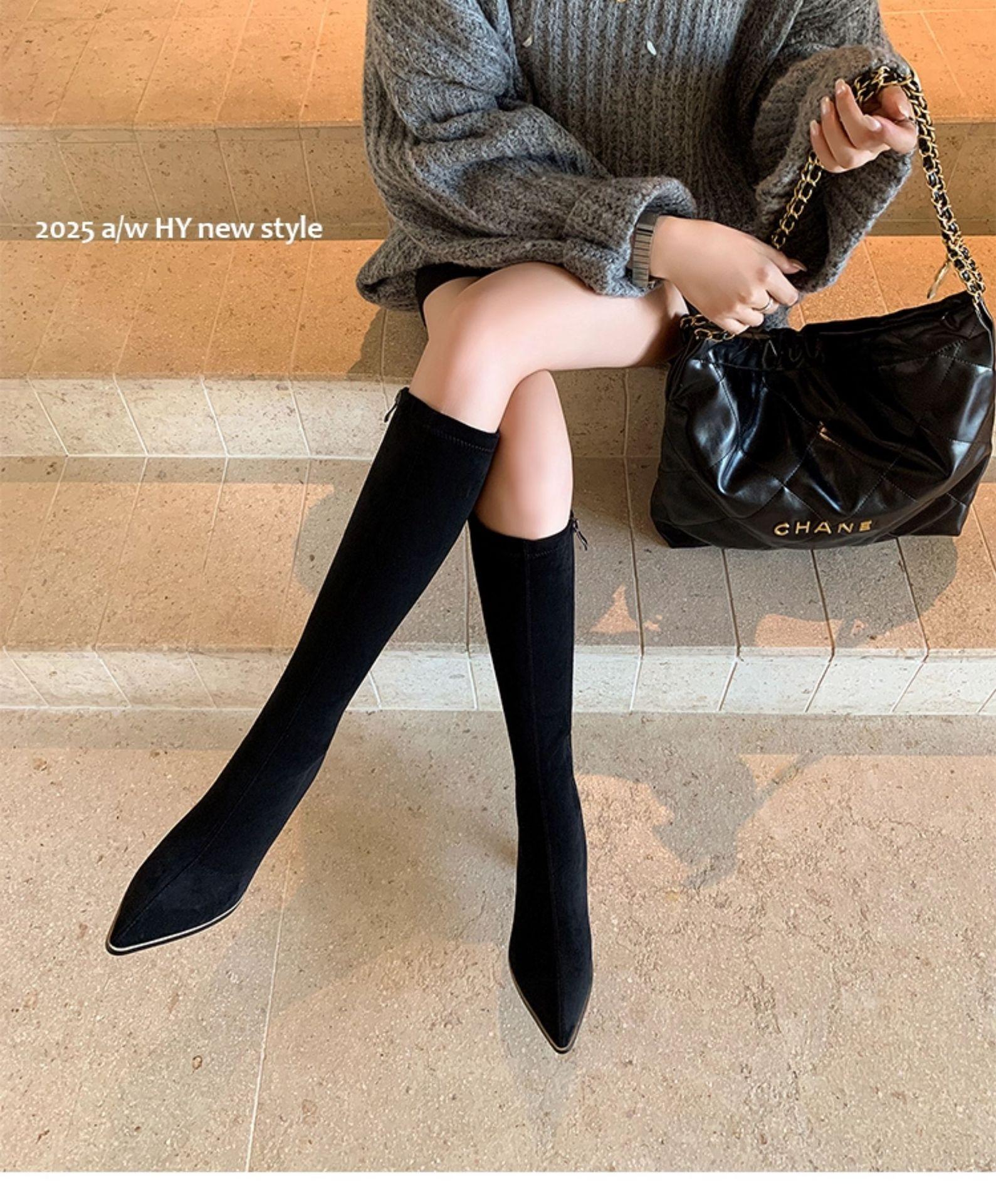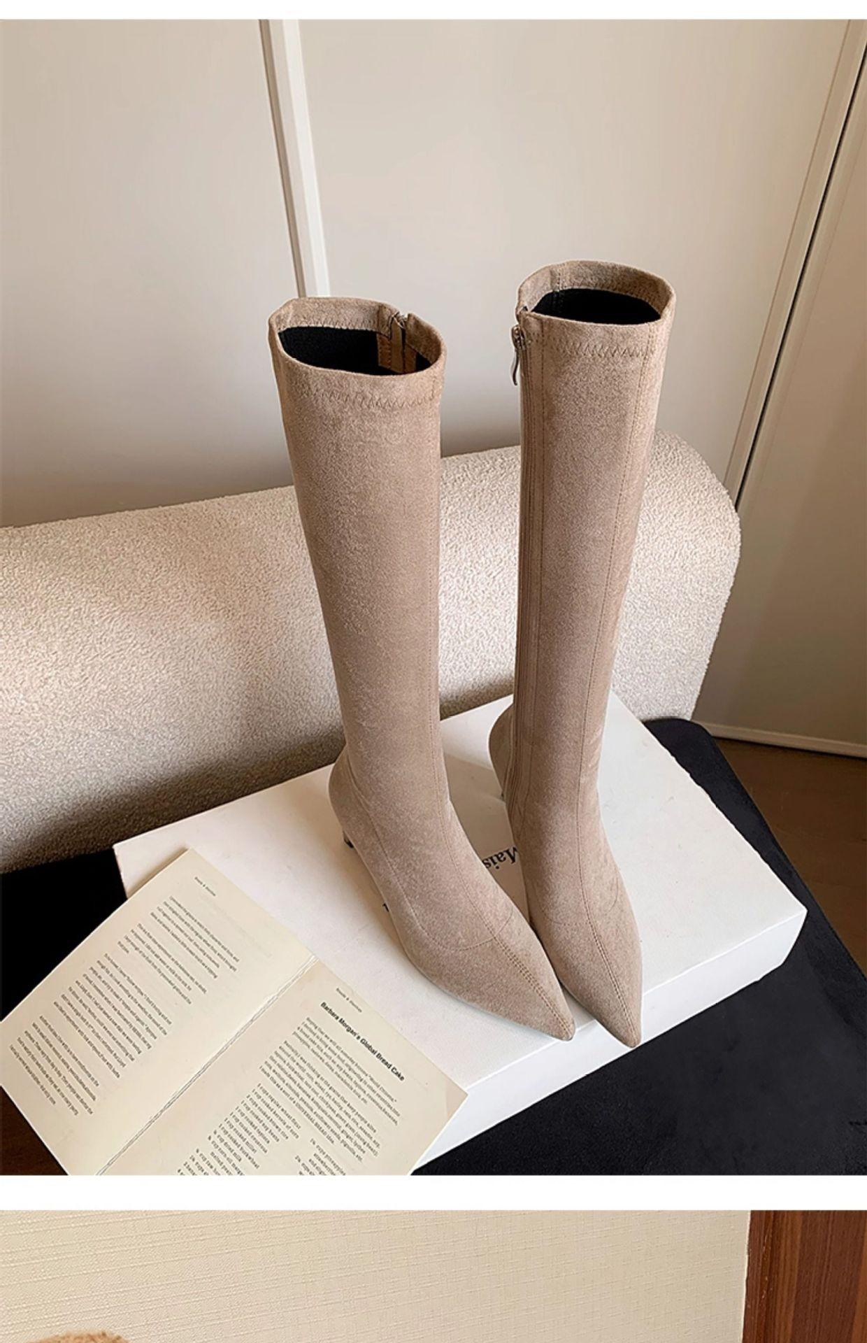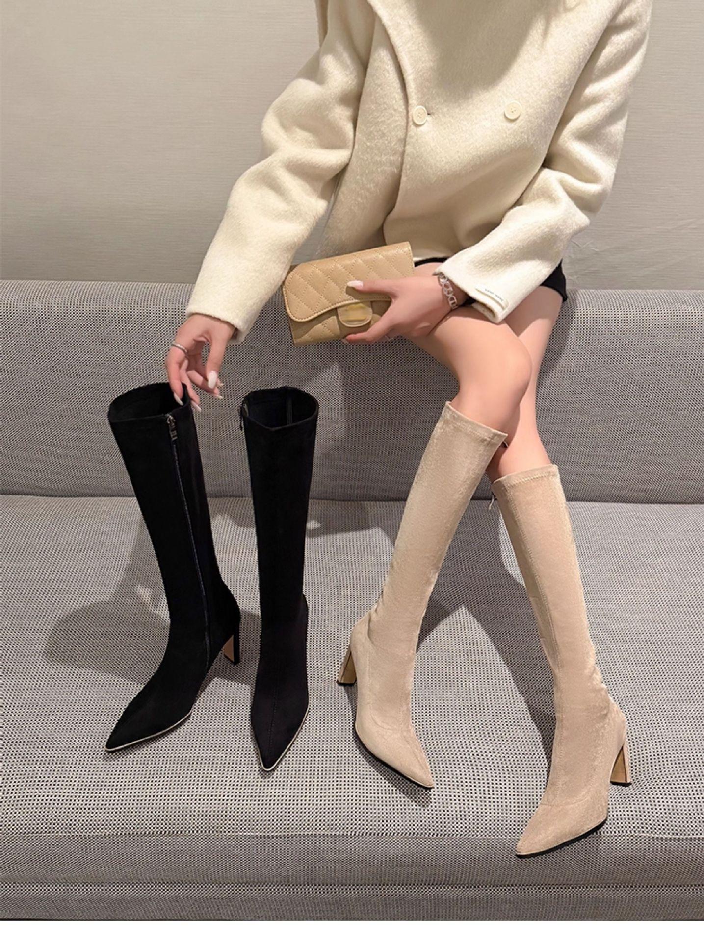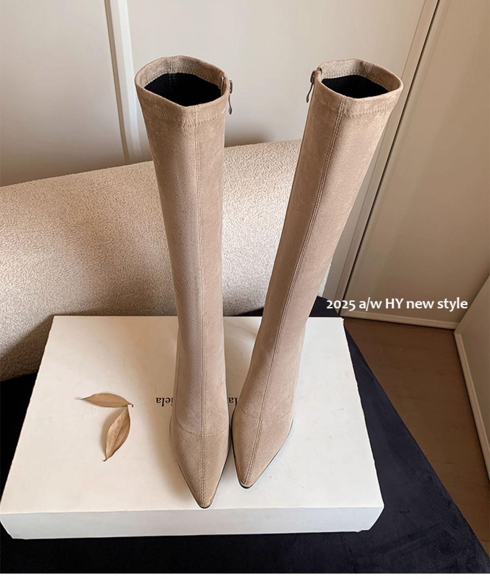 Punta Puntiaguda Tacón de Aguja Tacón Alto Botas Largas Mujer 2025 Otoño/Invierno Nuevo Elástico Moda Versátil Gamuza Botas Ajustadas Sobre la Rodilla