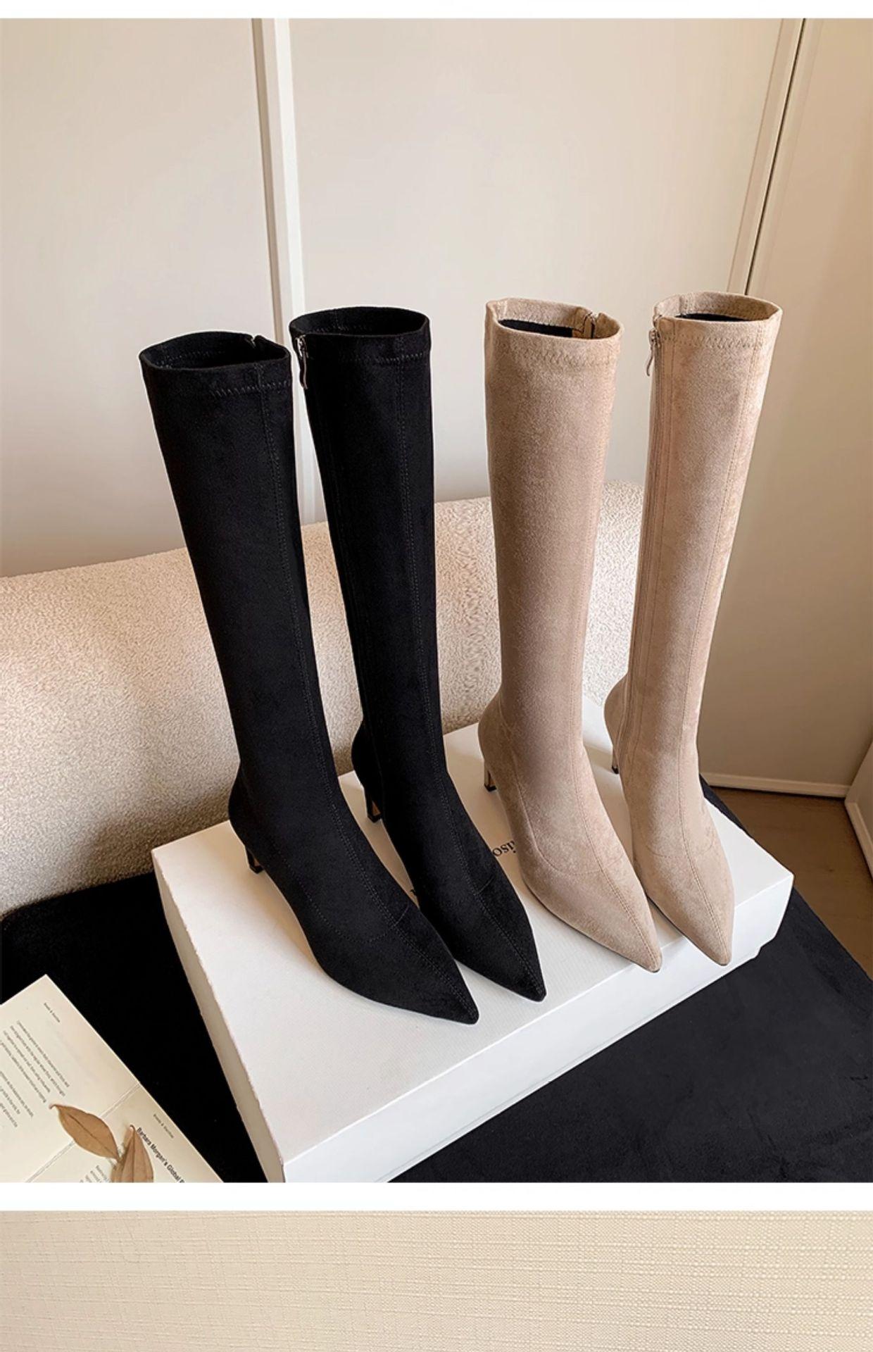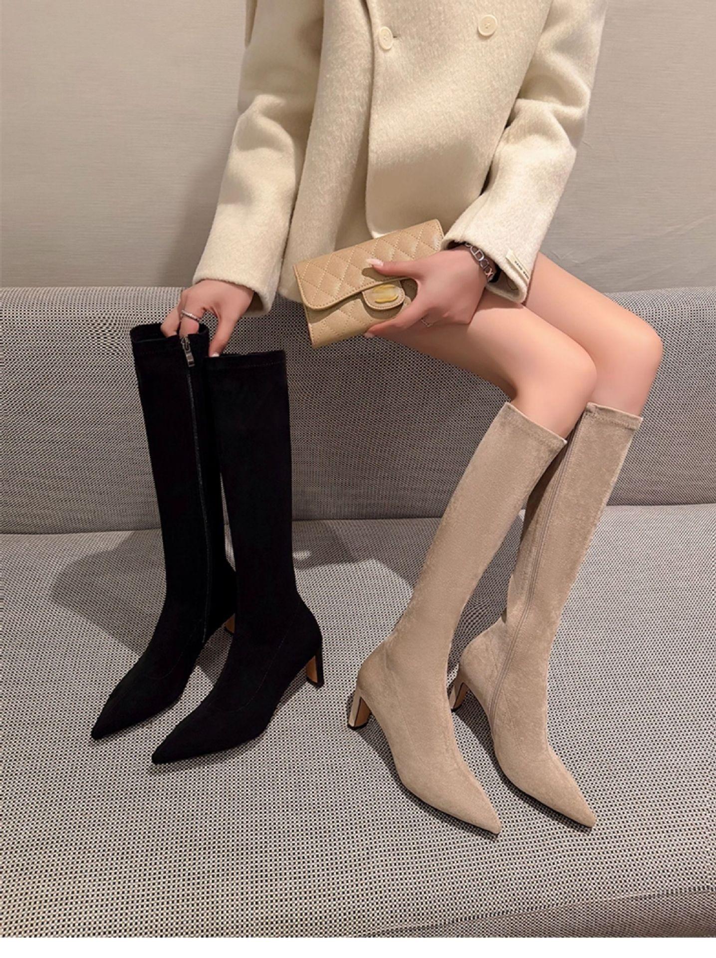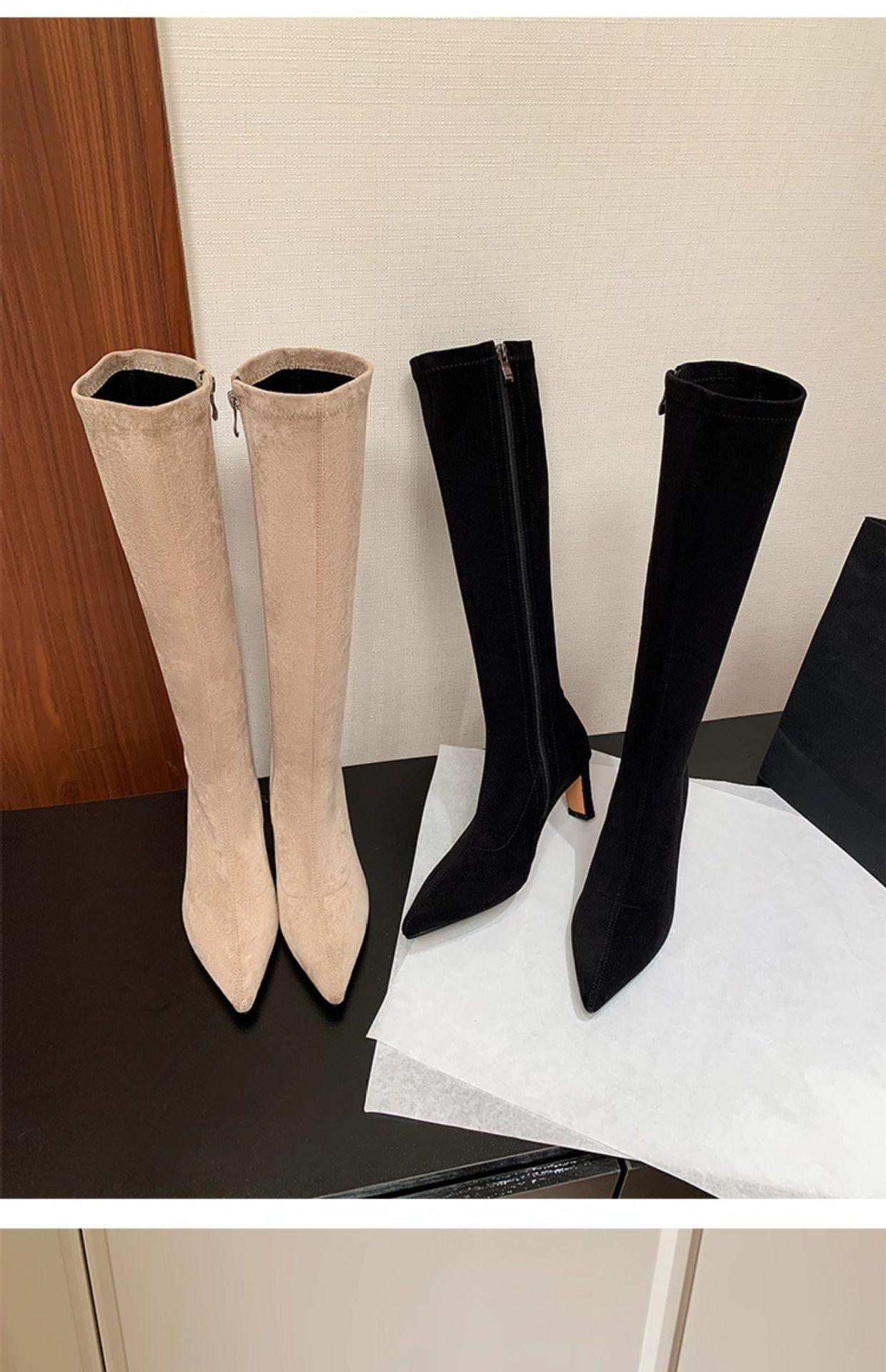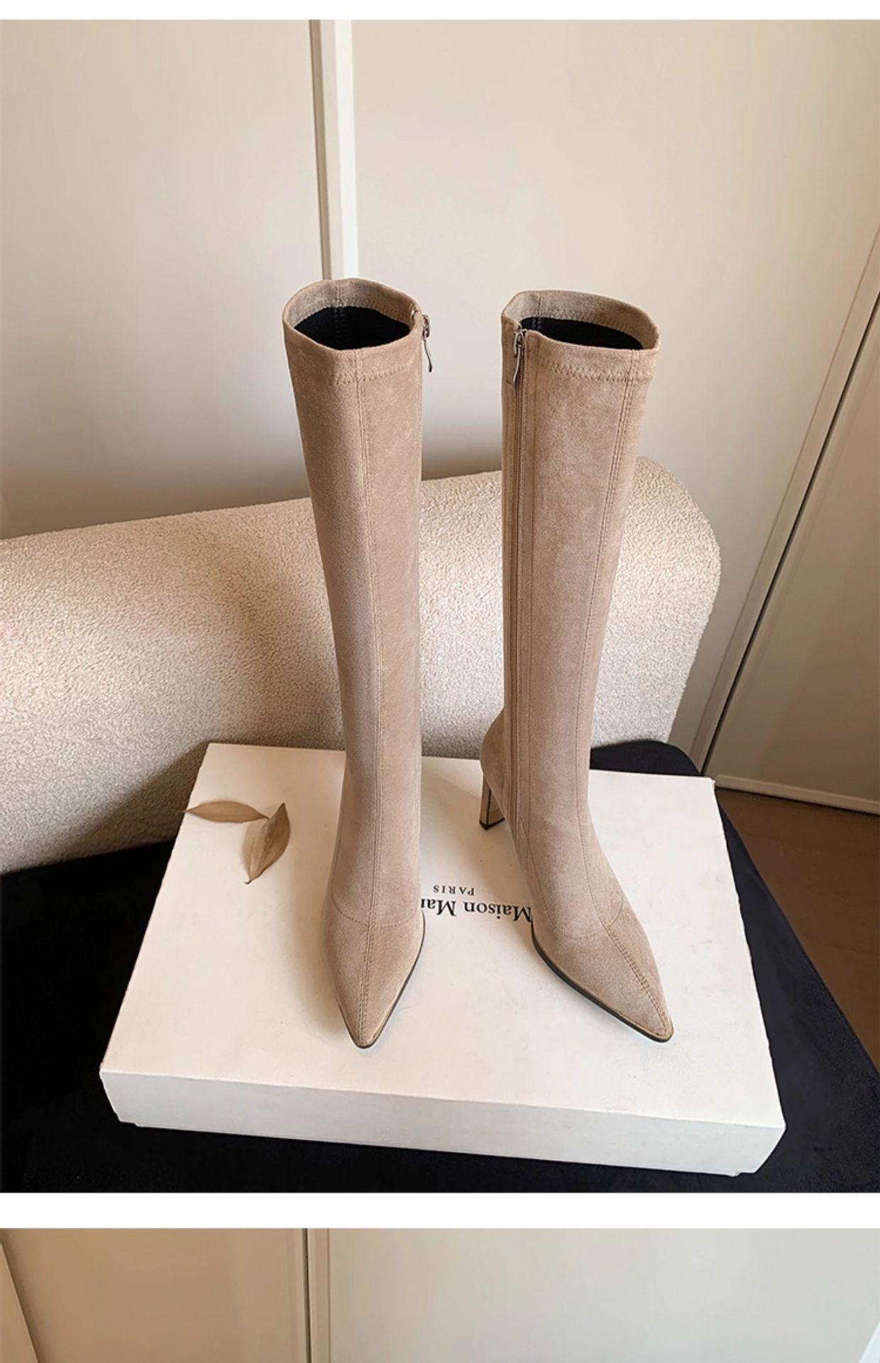 Punta Puntiaguda Tacón de Aguja Tacón Alto Botas Largas Mujer 2025 Otoño/Invierno Nuevo Elástico Moda Versátil Gamuza Botas Ajustadas Sobre la Rodilla