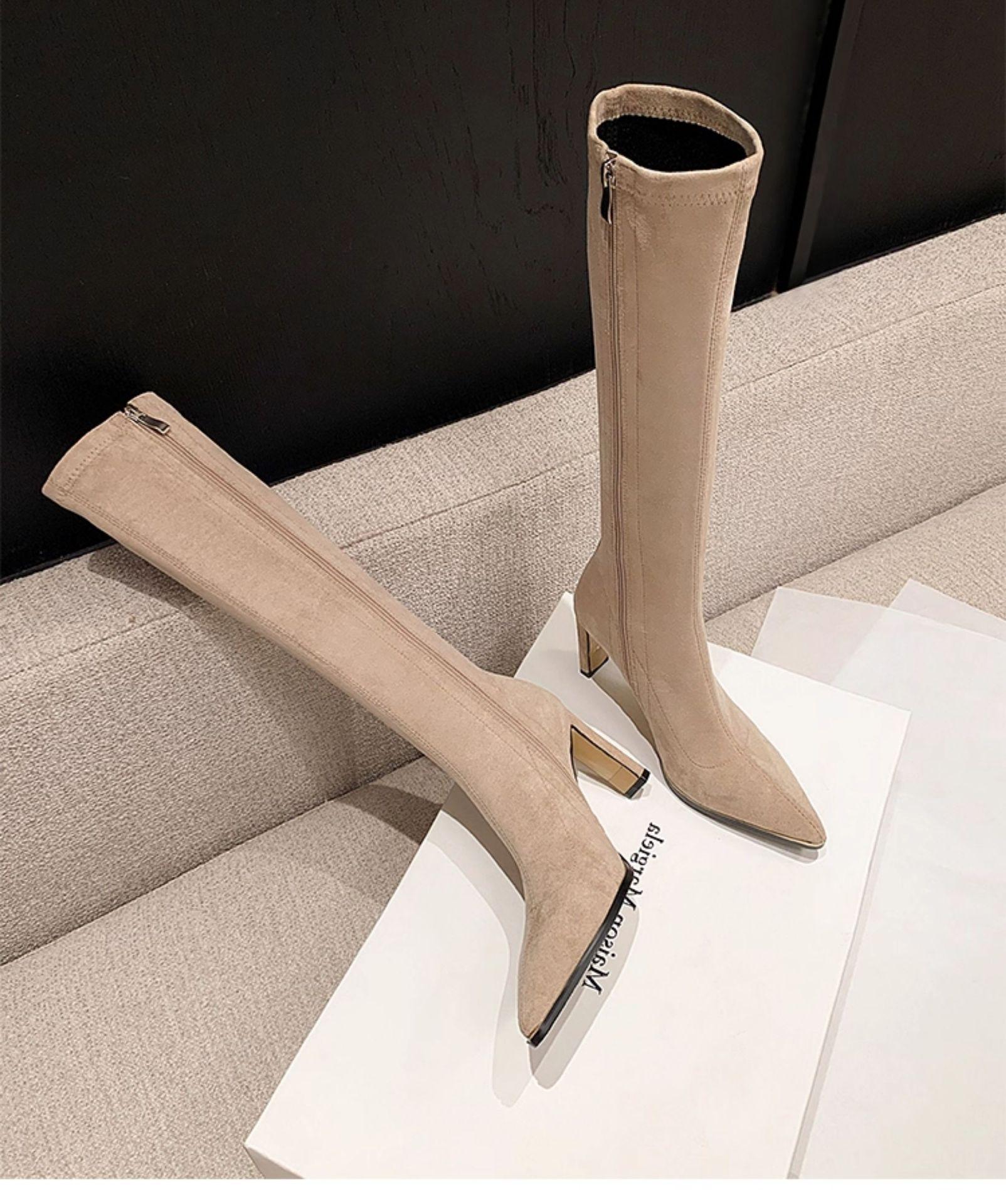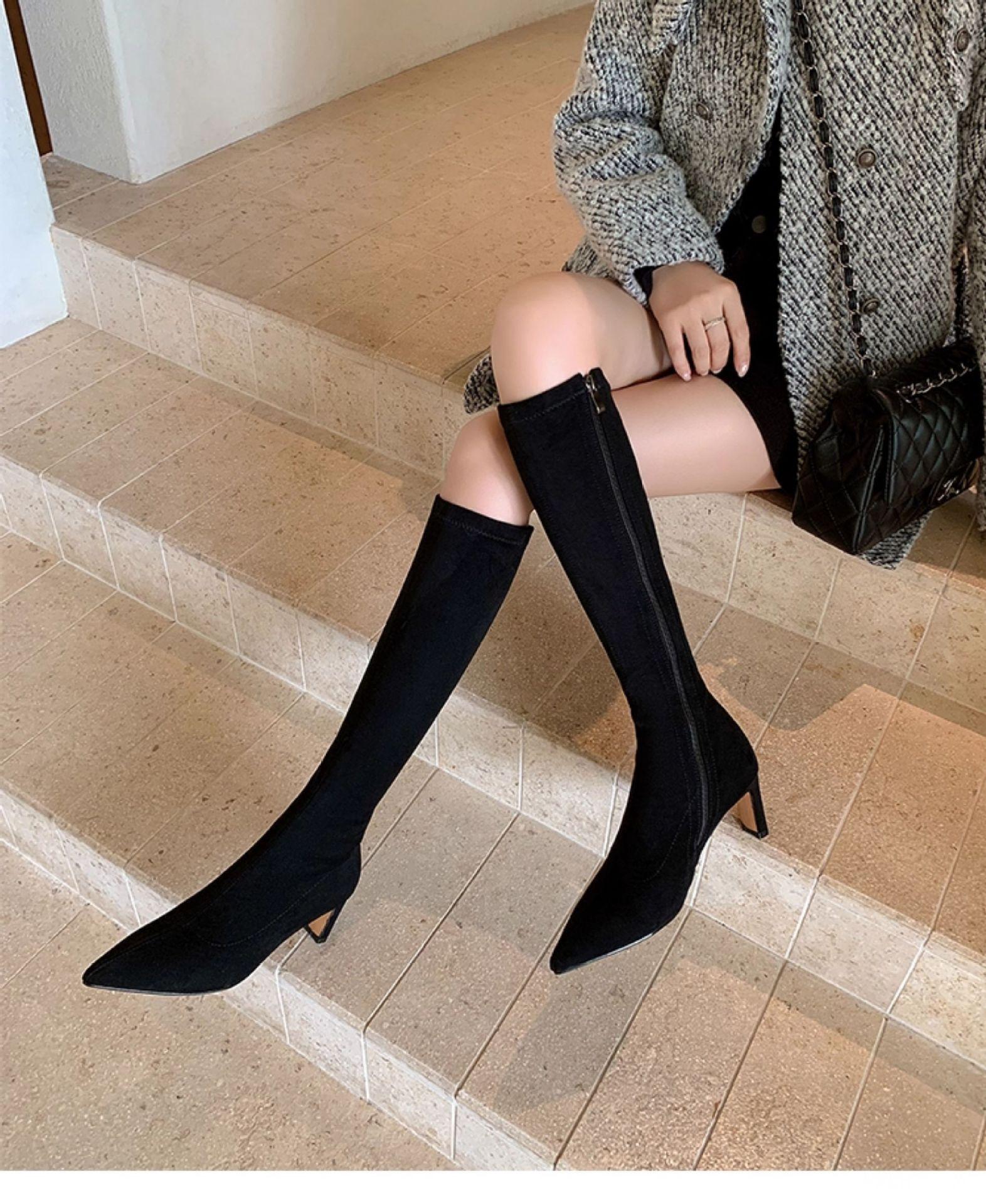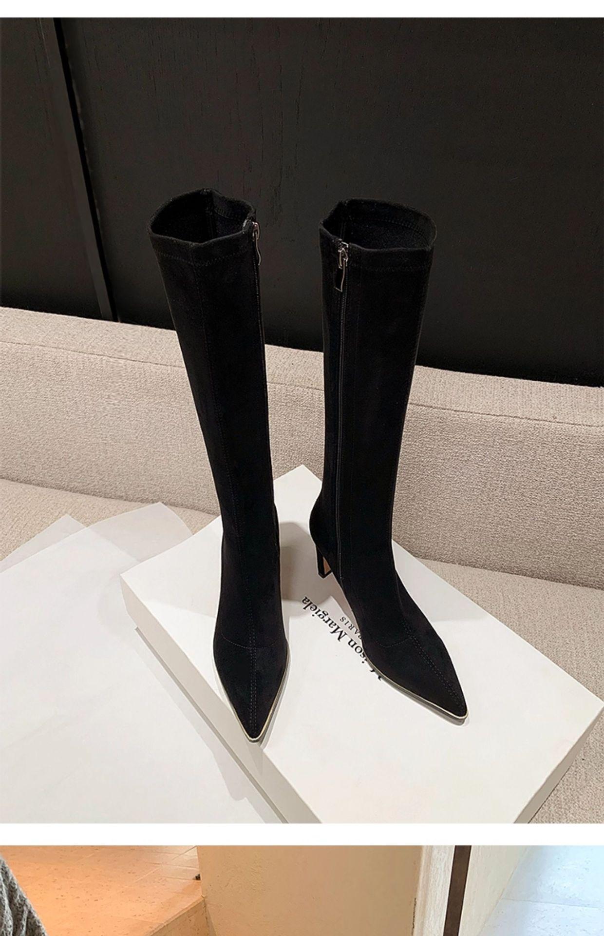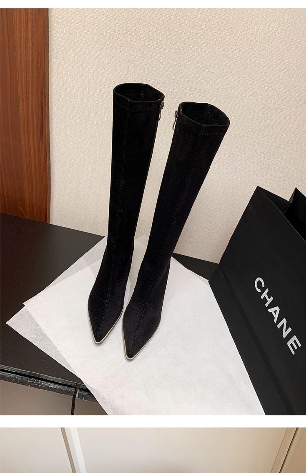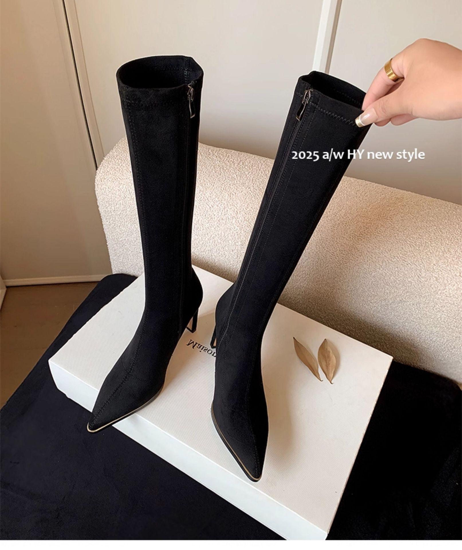 Punta Puntiaguda Tacón de Aguja Tacón Alto Botas Largas Mujer 2025 Otoño/Invierno Nuevo Elástico Moda Versátil Gamuza Botas Ajustadas Sobre la Rodilla