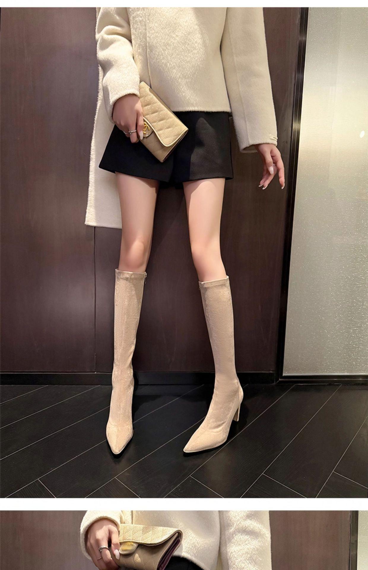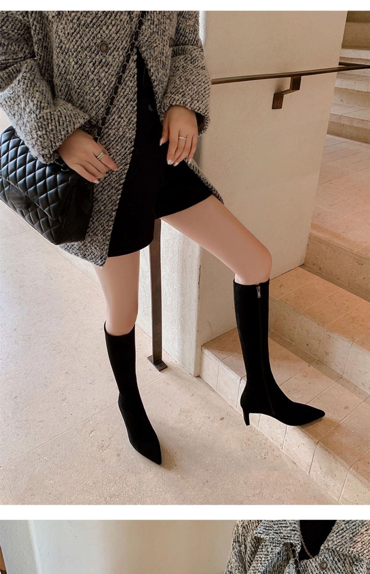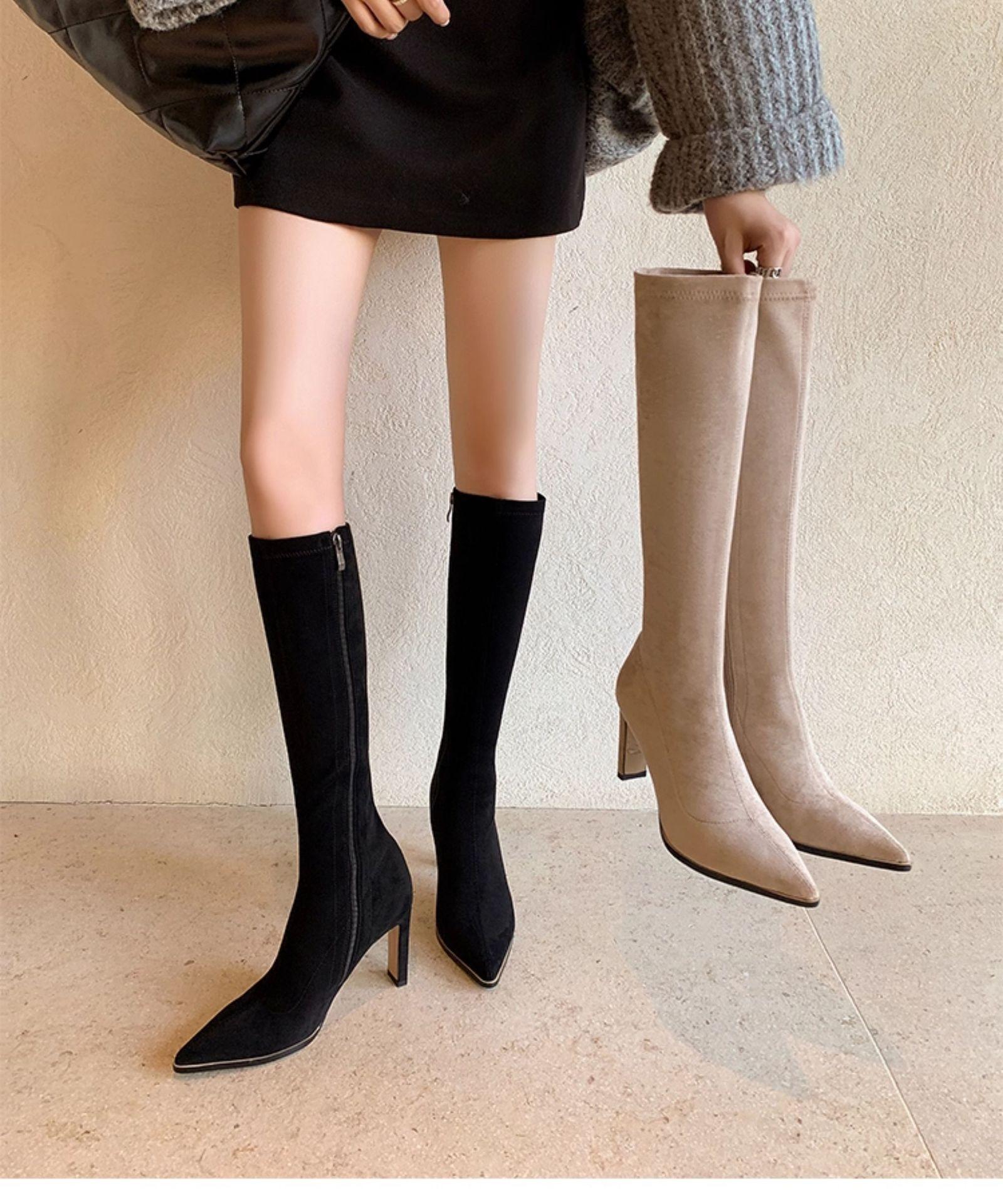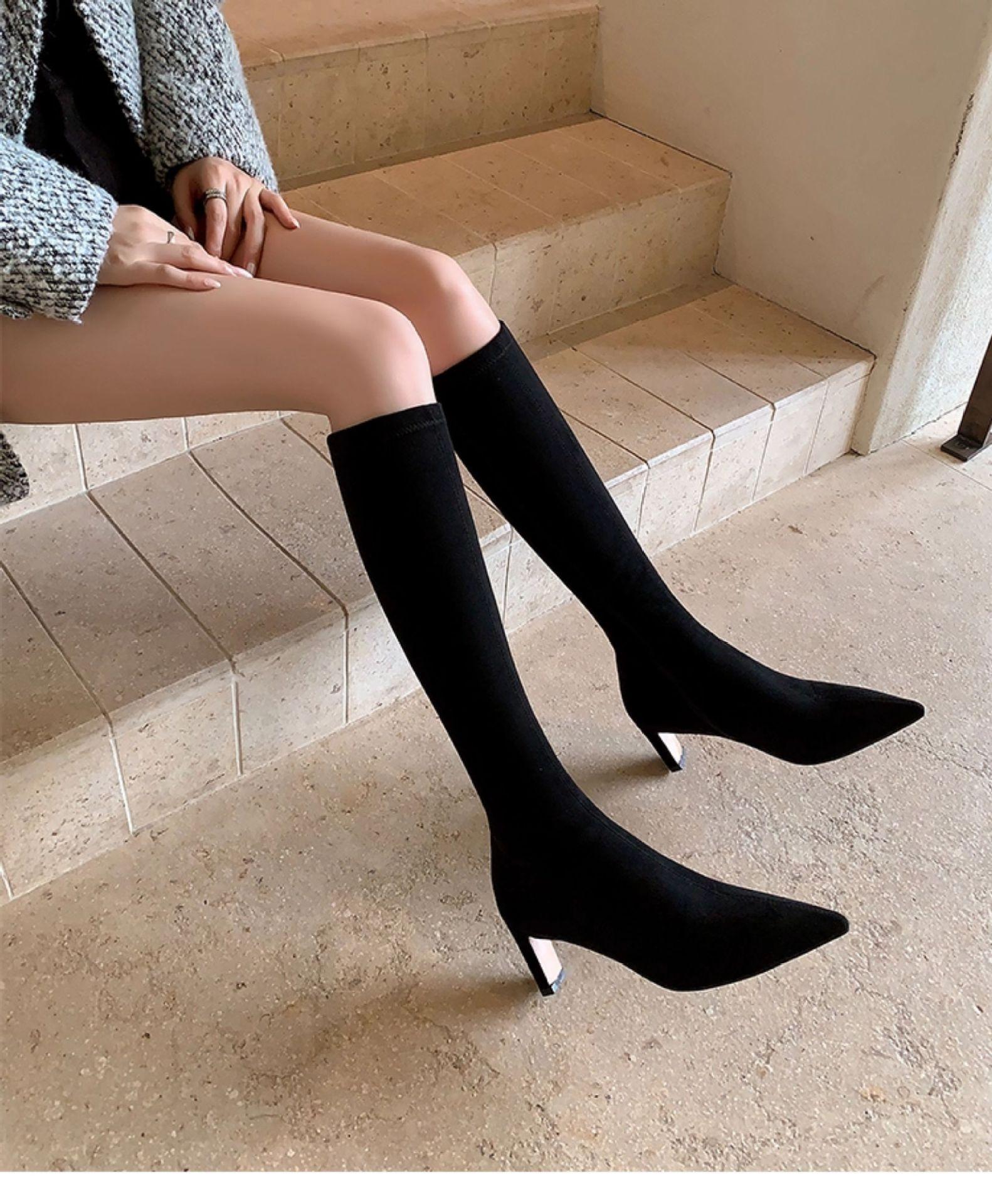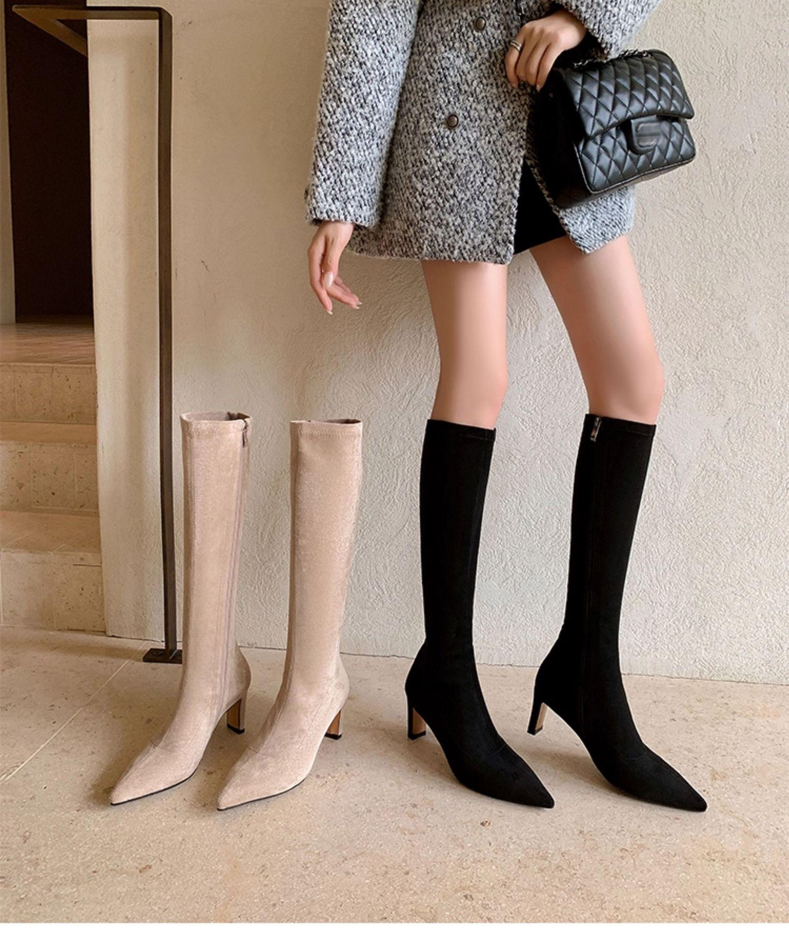 Punta Puntiaguda Tacón de Aguja Tacón Alto Botas Largas Mujer 2025 Otoño/Invierno Nuevo Elástico Moda Versátil Gamuza Botas Ajustadas Sobre la Rodilla