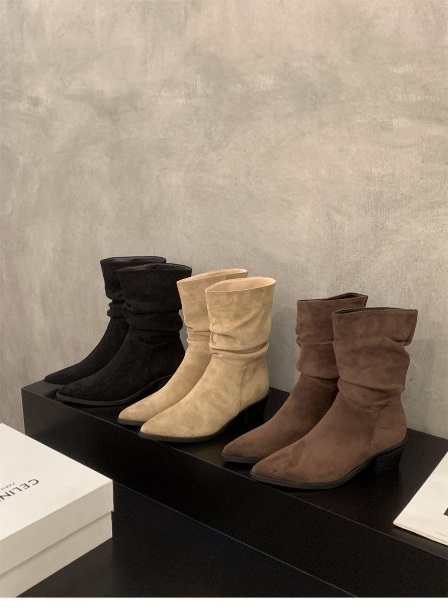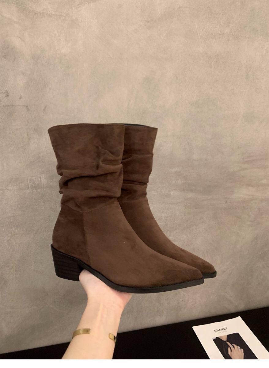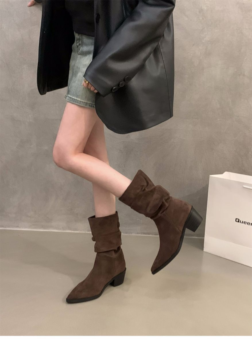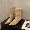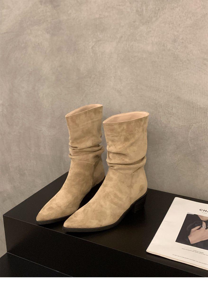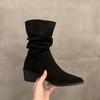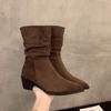 Botines cortos de tacón alto puntiagudo de gamuza caqui estilo francés ajustados para mujer zapatos 2025 nuevo estilo botas de pelo primavera y otoño botas individuales