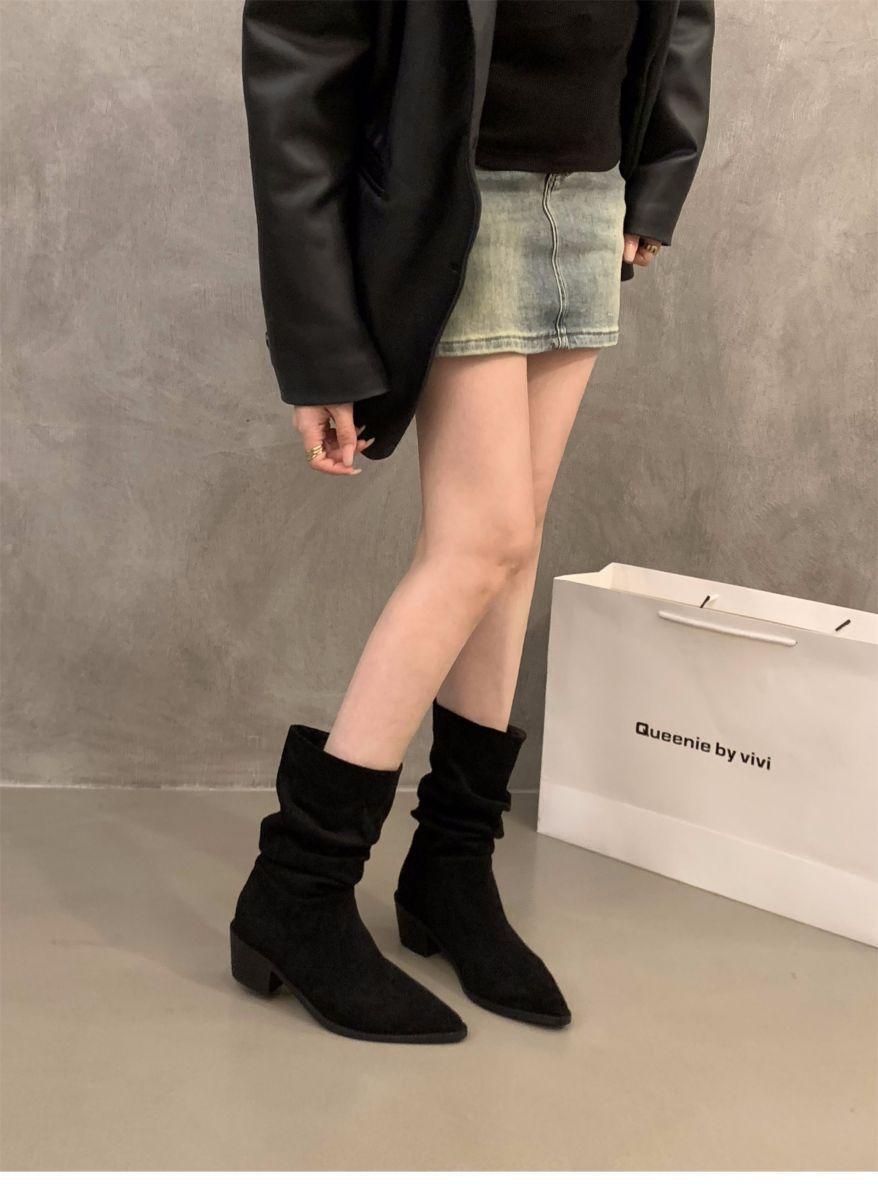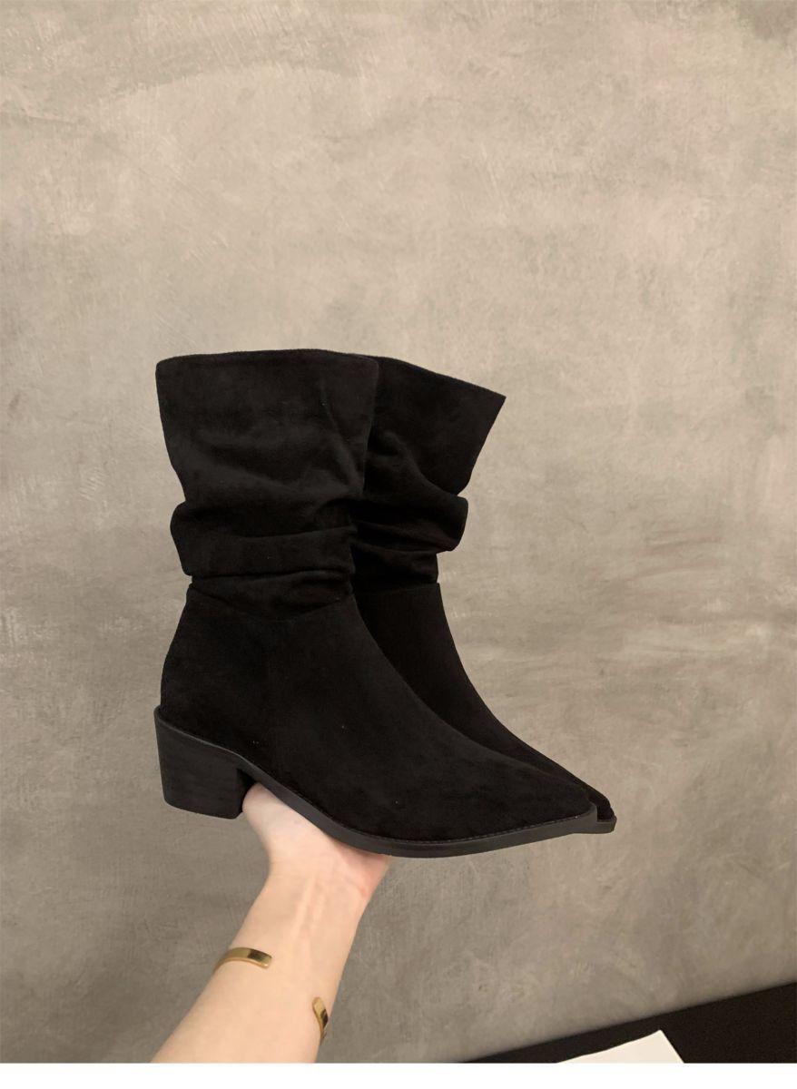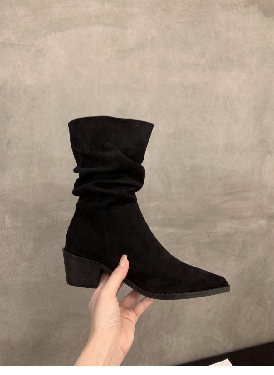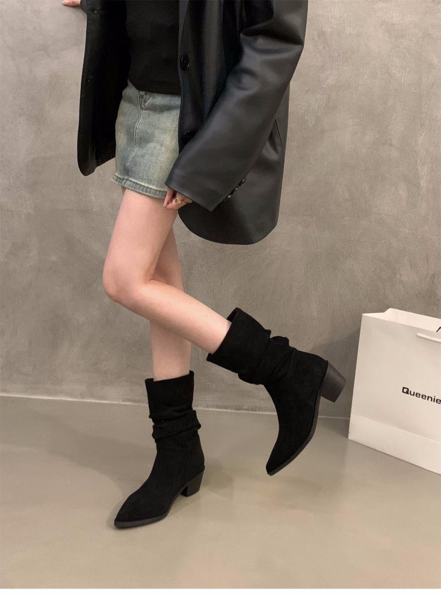 Botines cortos de tacón alto puntiagudo de gamuza caqui estilo francés ajustados para mujer zapatos 2025 nuevo estilo botas de pelo primavera y otoño botas individuales