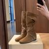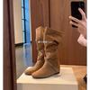 Estilo Mamá Uva Aumentar altura 6cm~ Estilo coreano punta redonda correa con hebilla suave plisado adelgazante botas de media pantorrilla botas de tacón alto para mujer