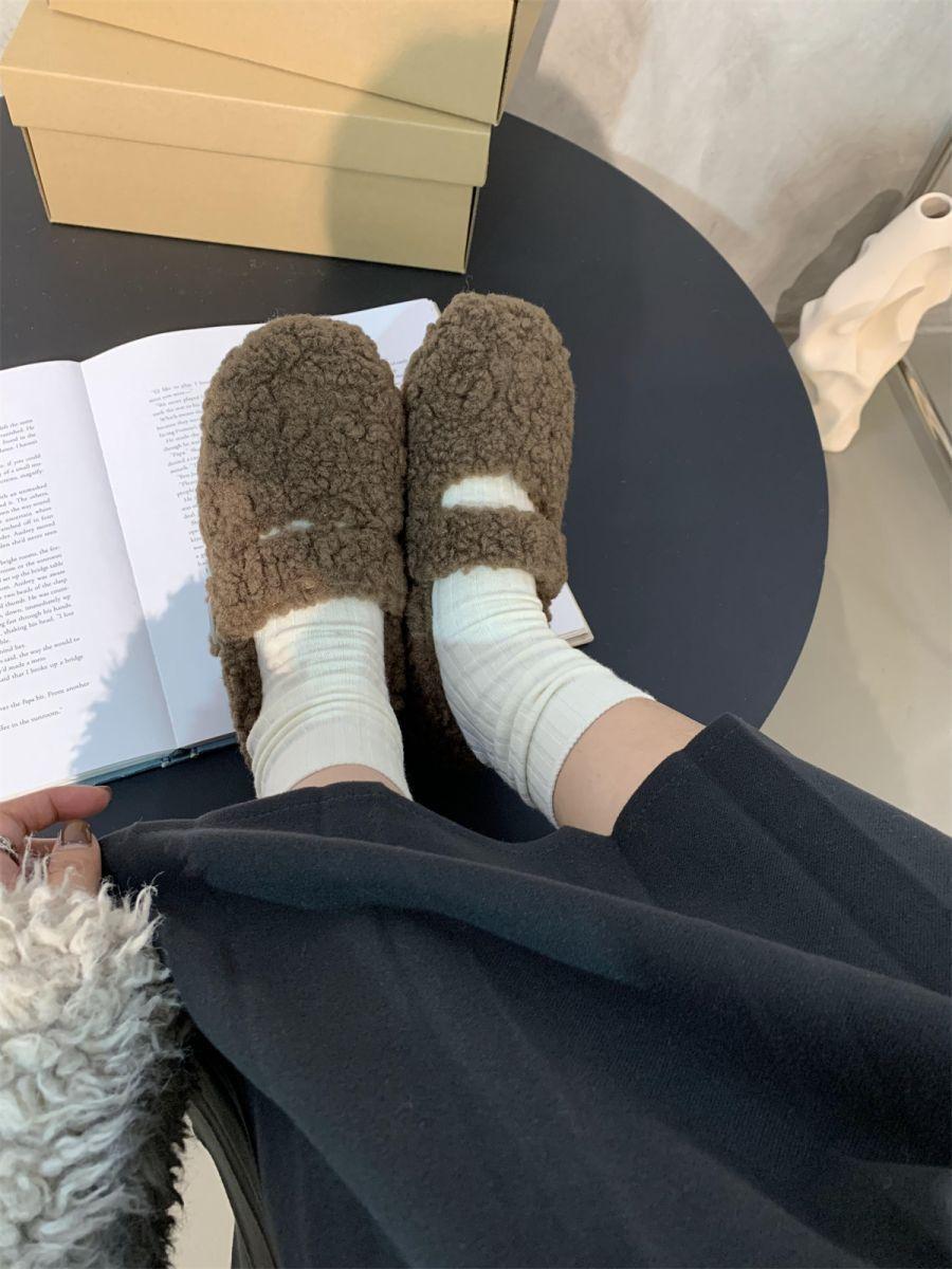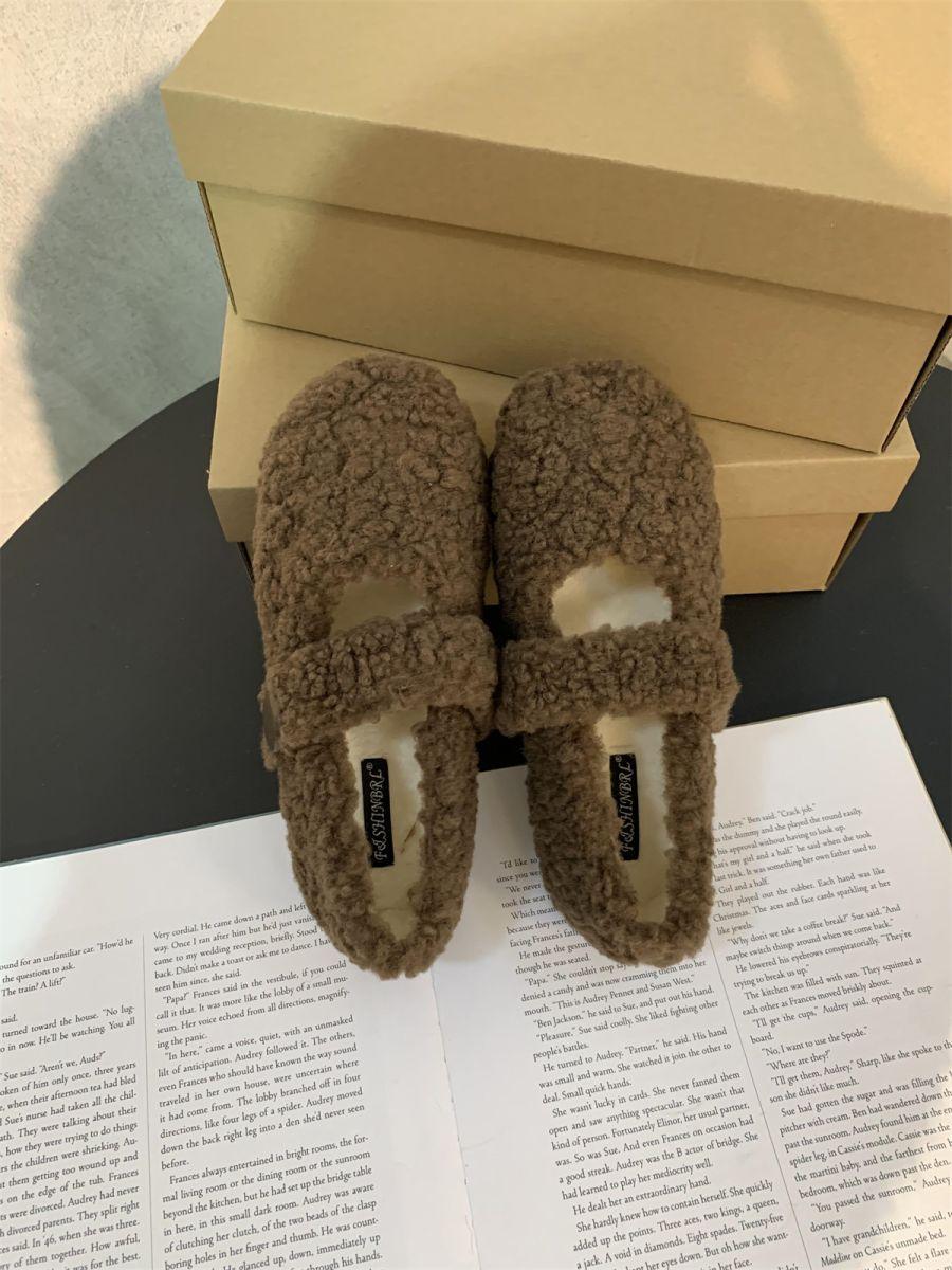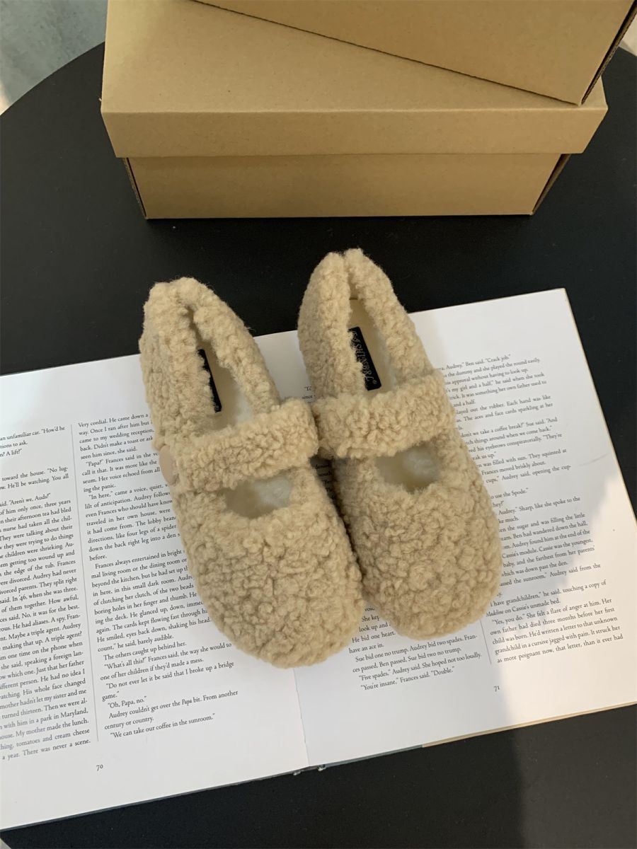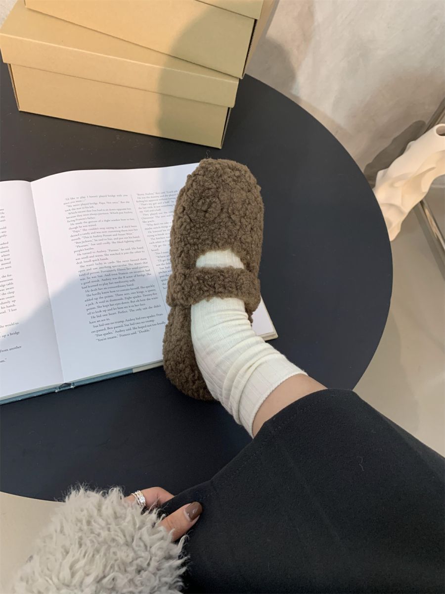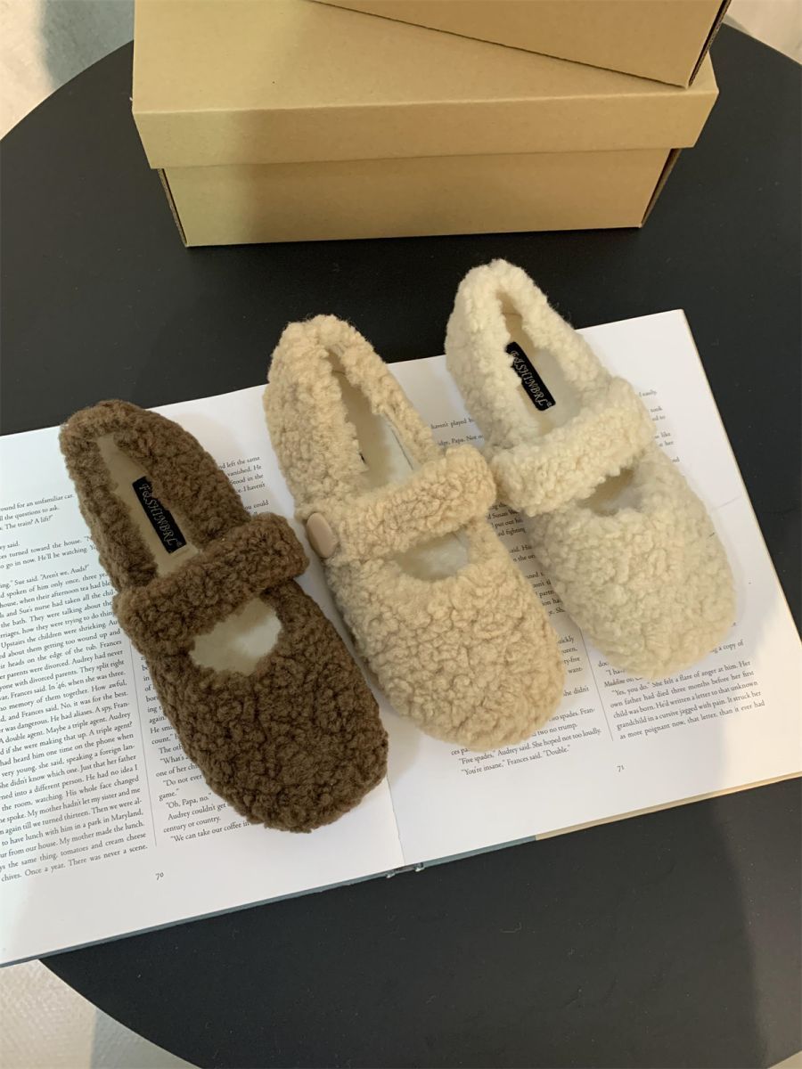 Zapatos planos peludos para mujer ropa de invierno 2025 nuevo estilo más zapatos de frijol de terciopelo súper absolutos Mary Jane de una sola correa zapatos individuales