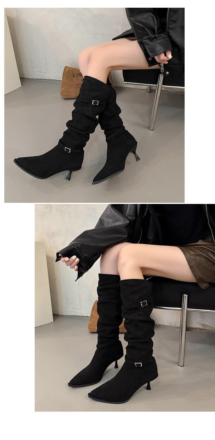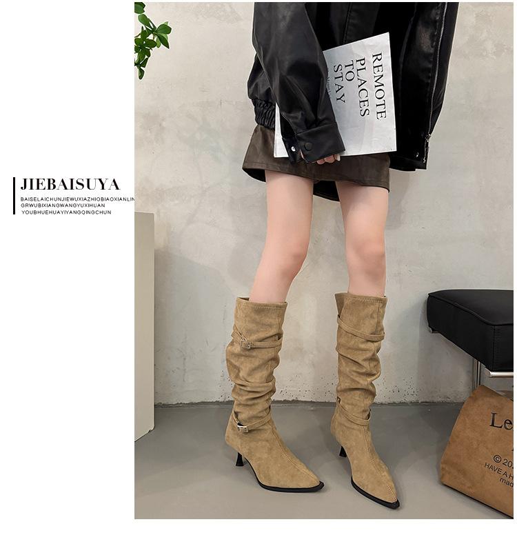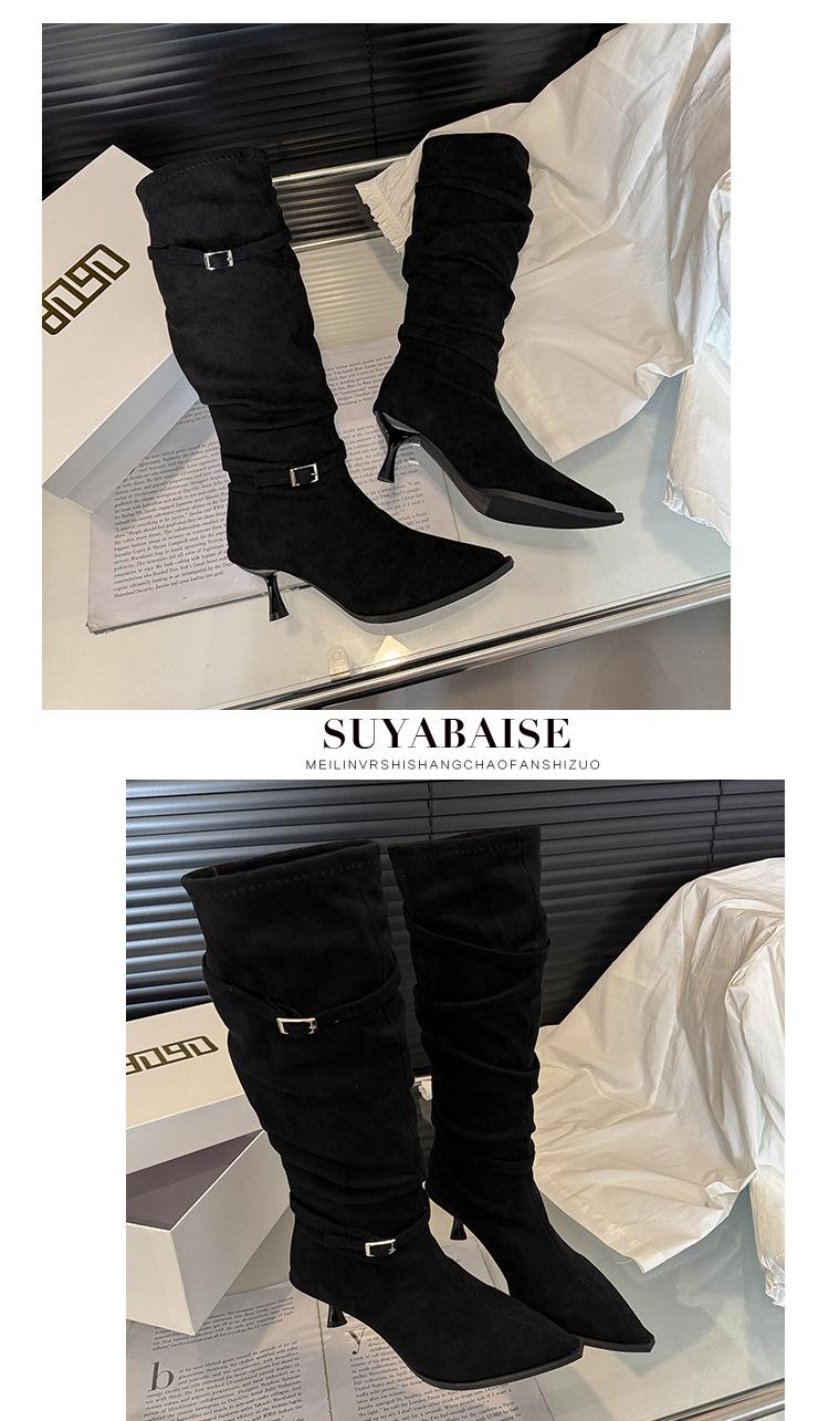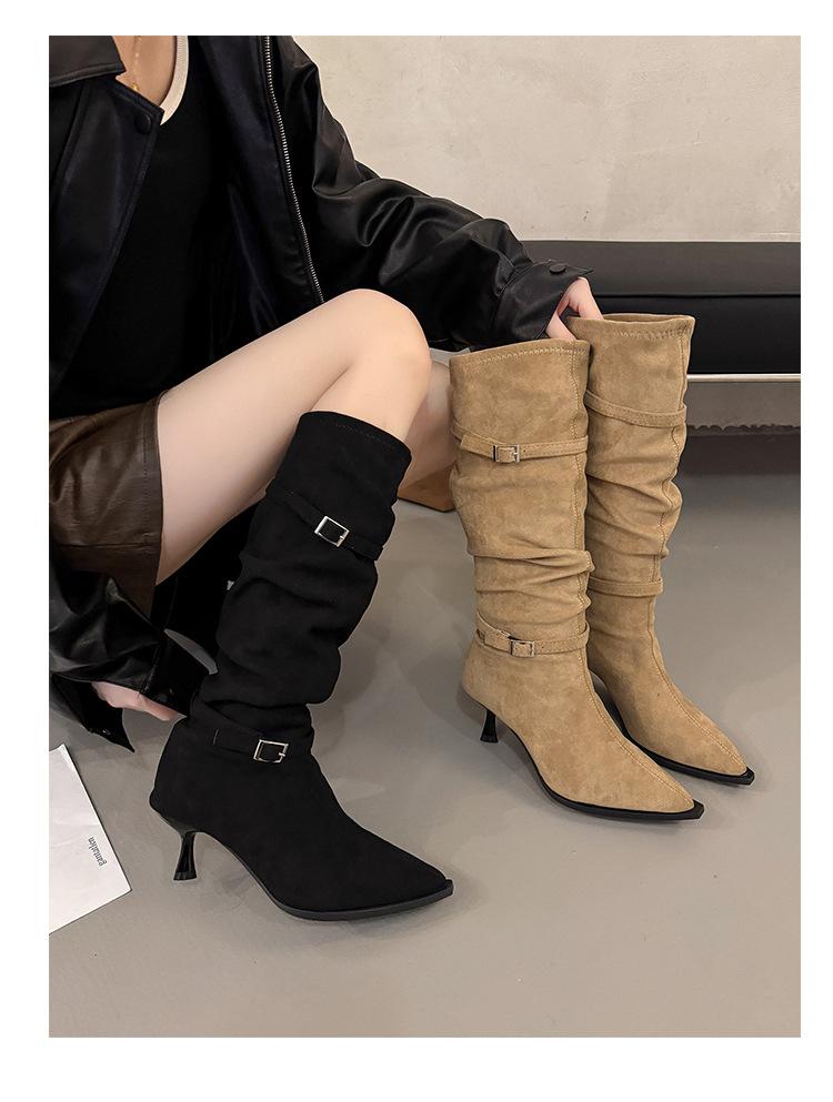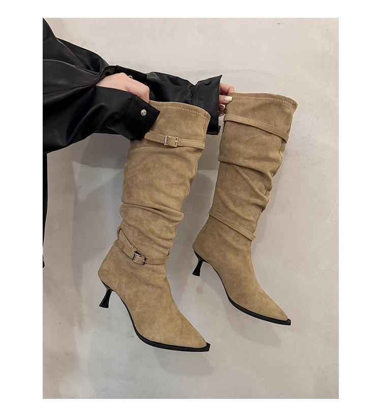 Botas Largas de Moda Punta Afilada Tacón de Aguja Hebilla Fruncidas Apiladas Mujer 2025 Otoño Nuevo Temperamento Adelgazantes Botas de Tacón Alto